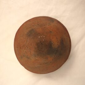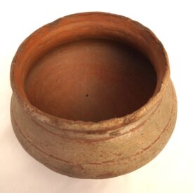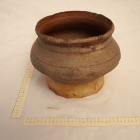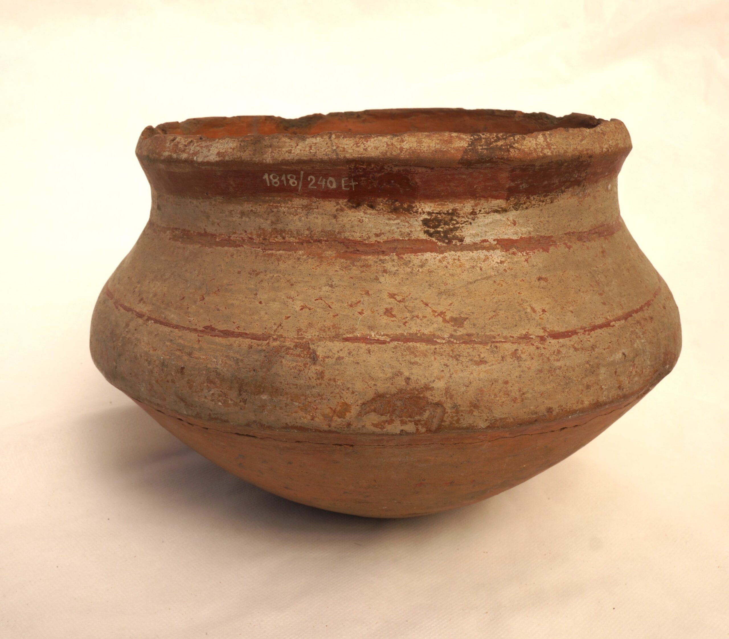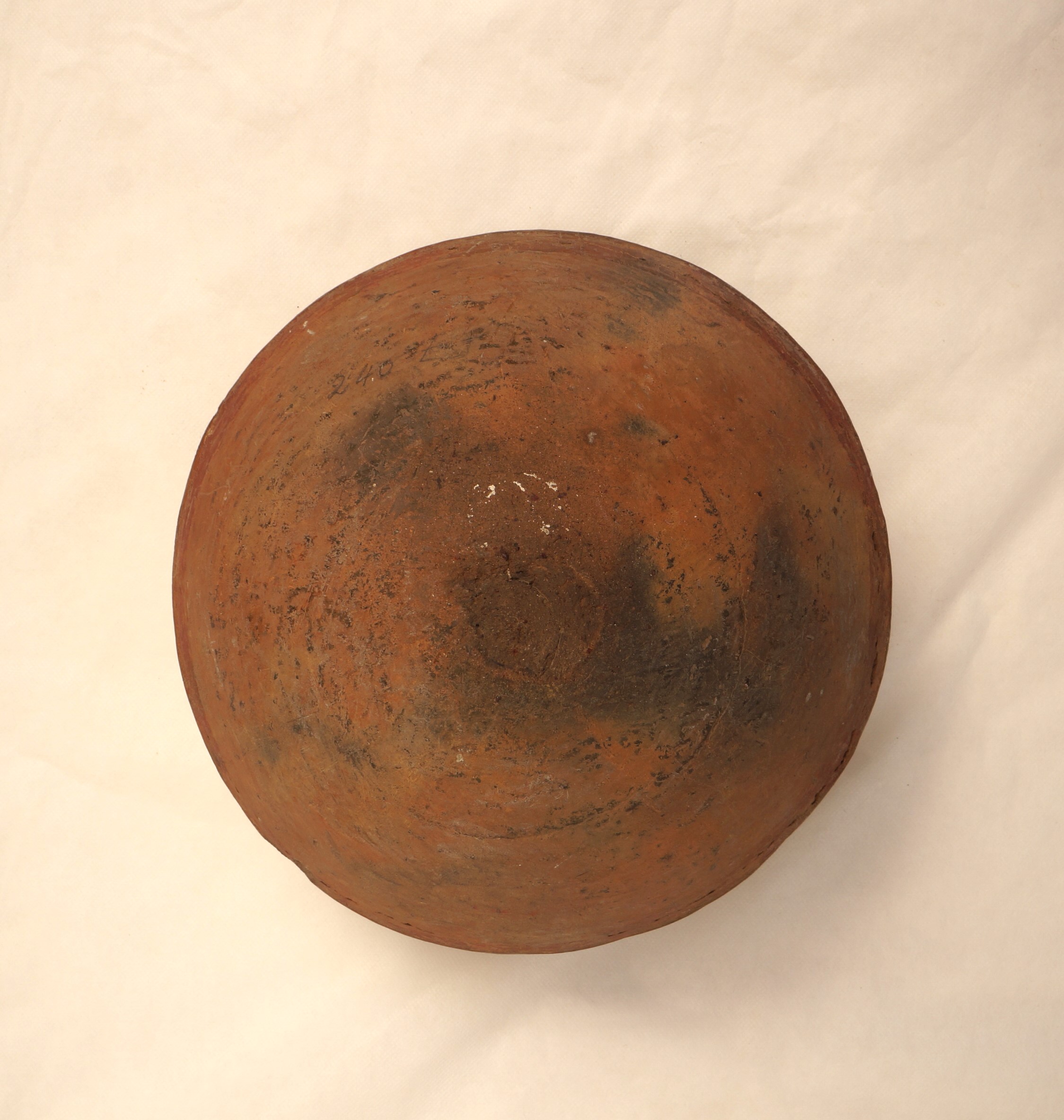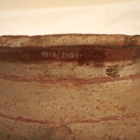 Base em forma de cone invertido. Parte superior formada por três zonas, separadas apenas por traços de tinta vermelha. Borda encurvada para dentro. Base não decorada. Parte superior recoberta por camada de caolim branco-amarelado, sobre a qual se veem quatro anéis vermelhos, dois mais largos, um junto a borda, logo abaixo do "aro bucal" e o outro circundando a parte superior da base. Modelado pelo método de "cordas" em espiral, depois alisado interna e externamente. Pasta fina e homogênea. Forma simétrica. Pintura geométrica vermelha sobre fundo branco.