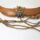 Dentes curvos, pontiagudos, e sementes esferoides marrom-escuro, perfurados, enfiados em um cordão de fibras torcidas. Há, também, três argolas de metal enfiadas no colar.