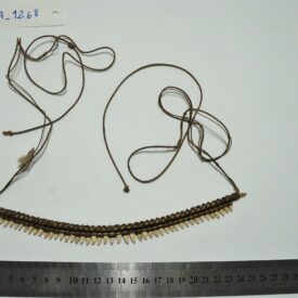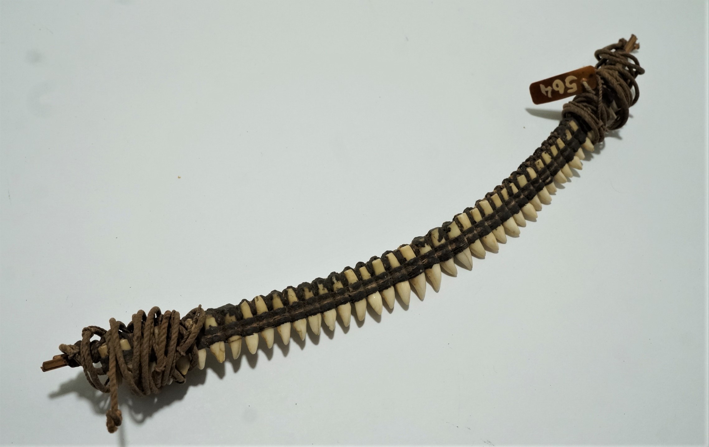 Fileira de dentes pontiagudos, simetricamente dispostos do maior ao menor a partir do centro, fixados por meio de fibras em uma vareta cilíndrica de madeira. Das extremidades da fileira de dentes saem cordões de fibras vegetais torcidas.