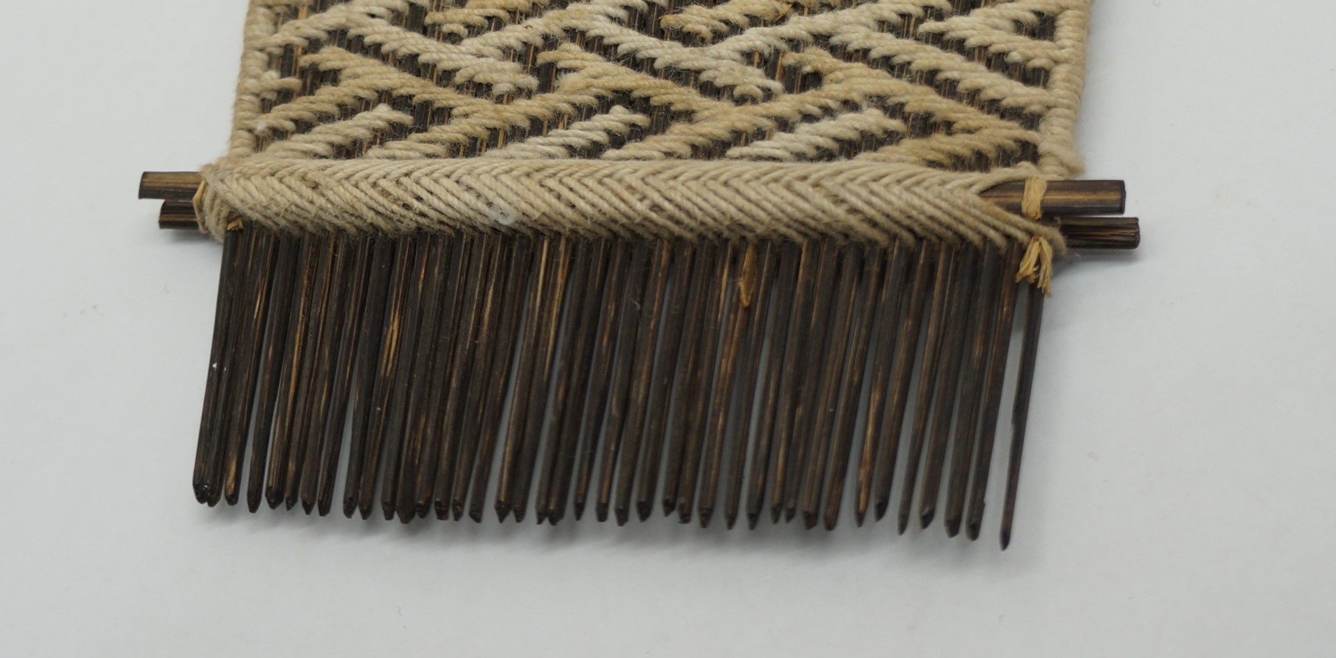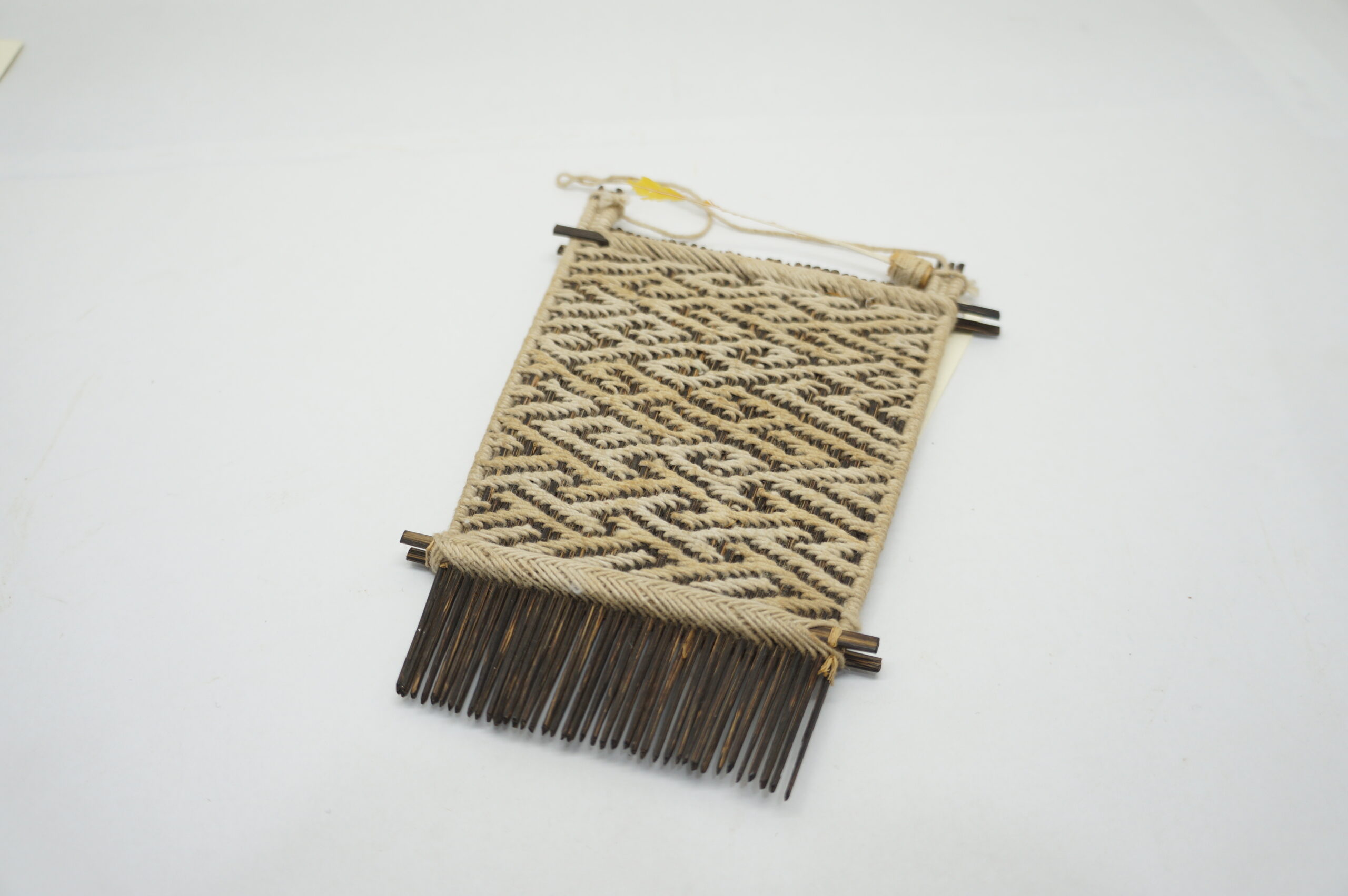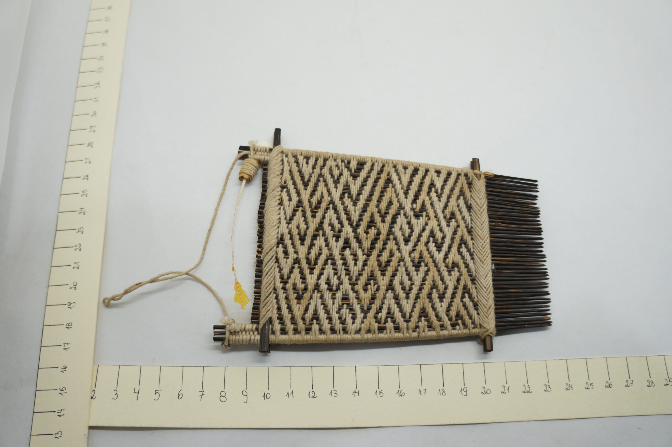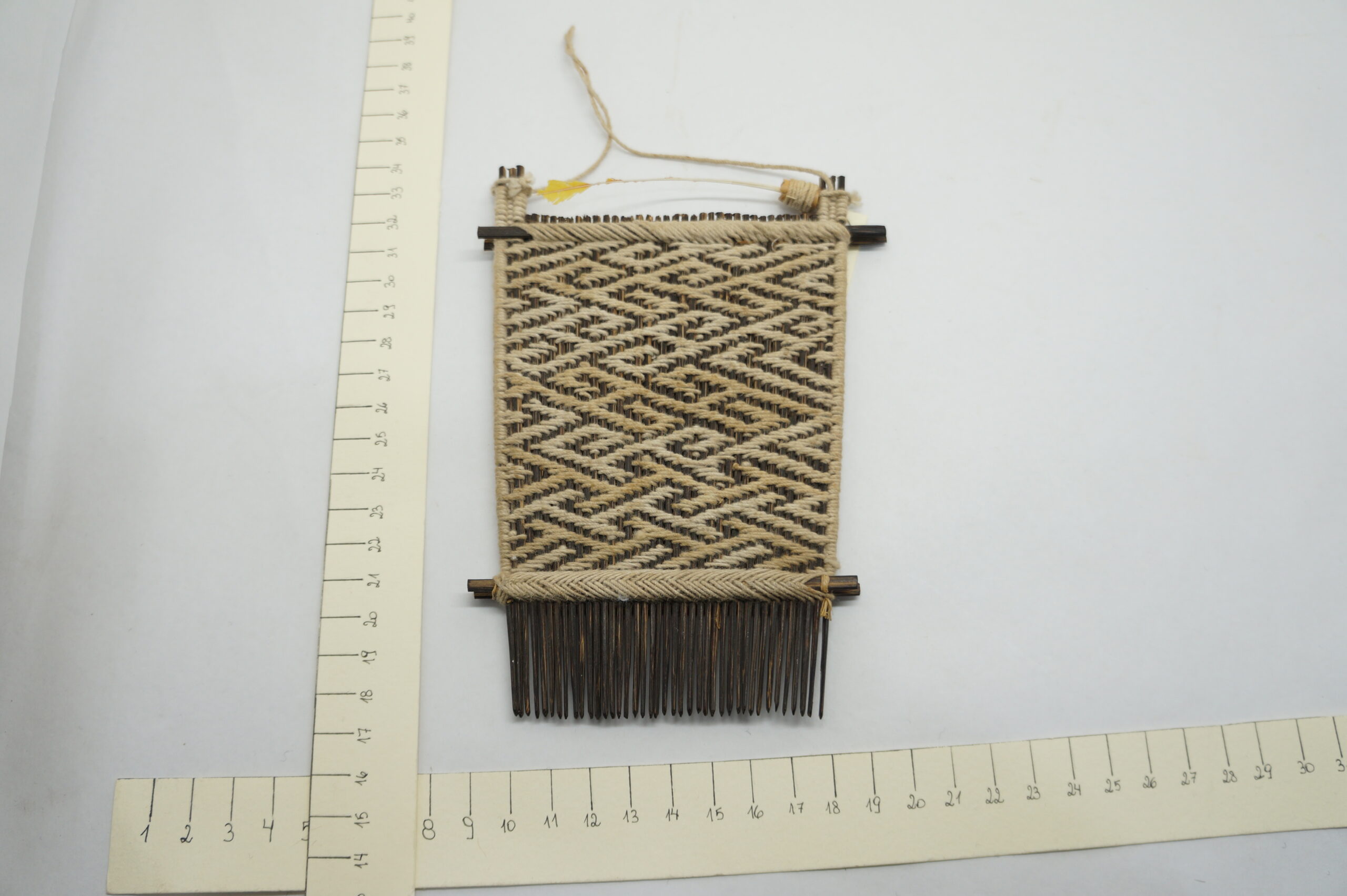 Fileira de varetas fixadas entre quatro peças transversais do mesmo material, reunidos por uma rede de fios trançados, que formam desenhos nas cores branco e amarelo; essa rede deixa livres as extremidades pontiagudas das varetas na área inferior, formando os dentes do pente. Na parte superior de ambos os lados, existem ornamentos de penas coloridas de cor azul e amarelo.