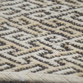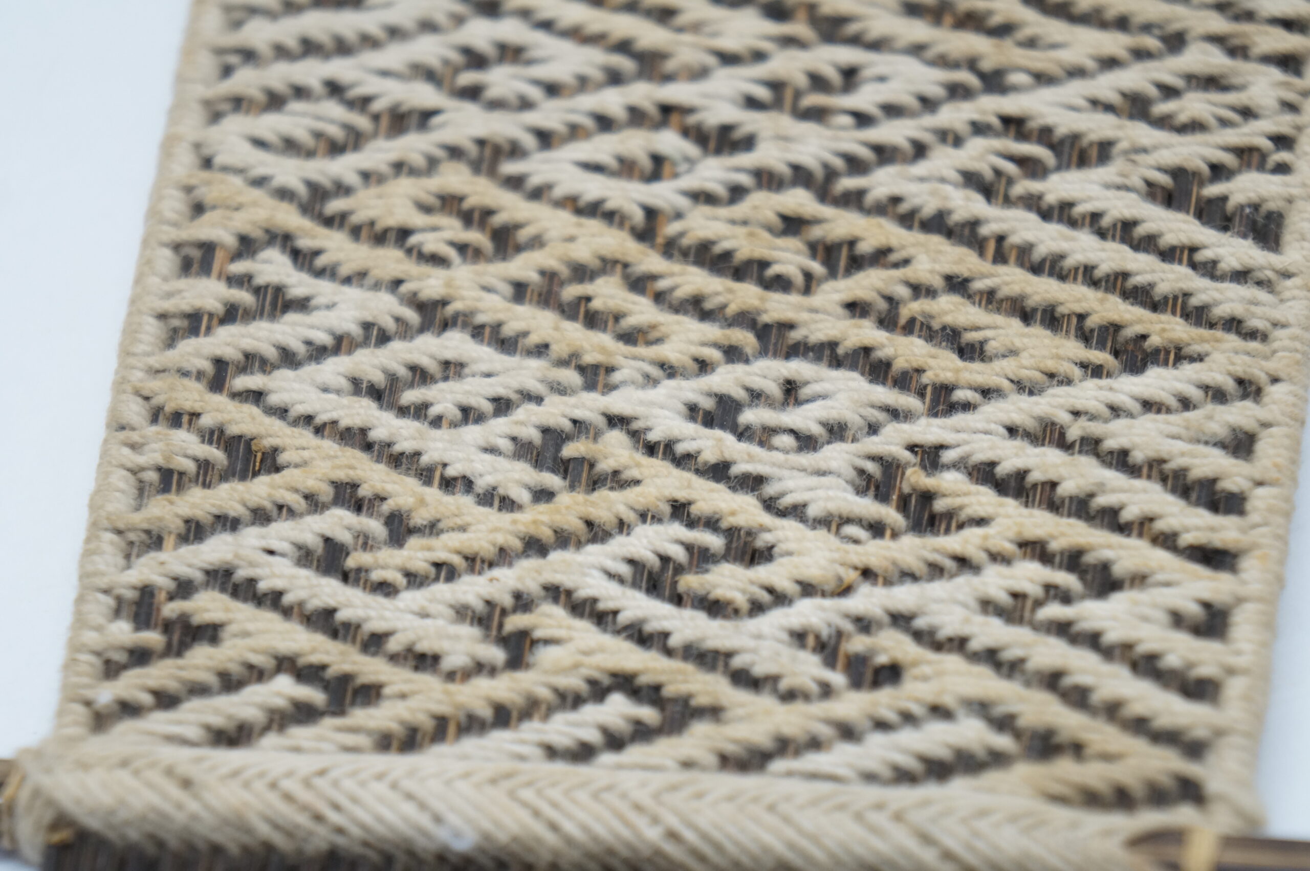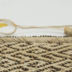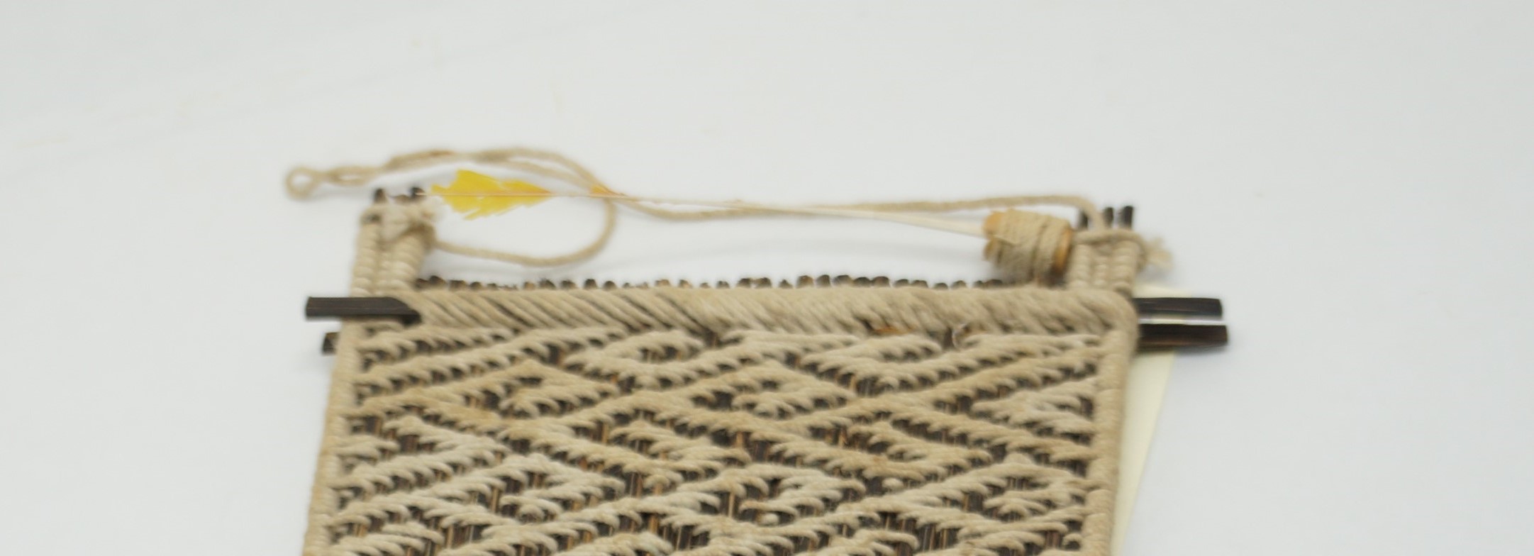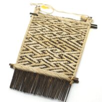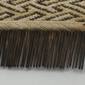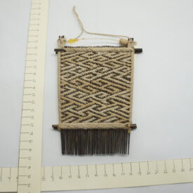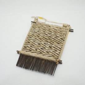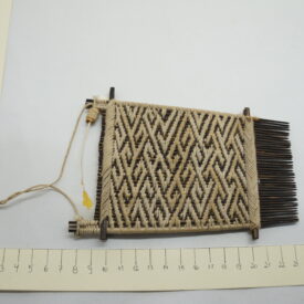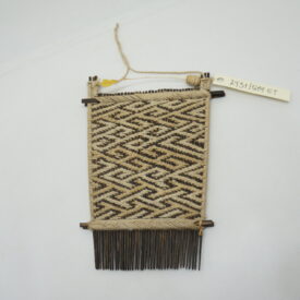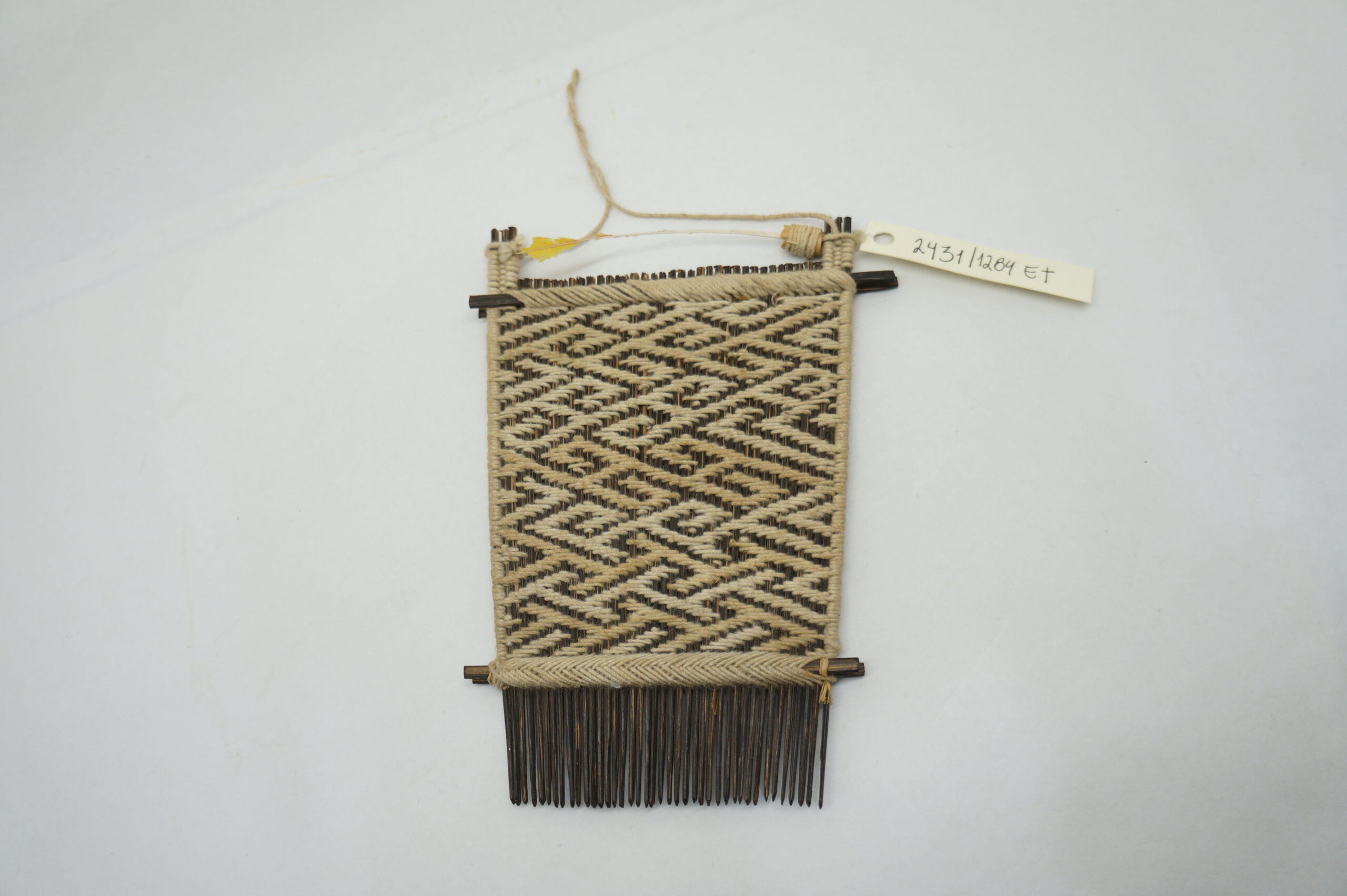Fileira de varetas fixadas entre quatro peças transversais do mesmo material, reunidos por uma rede de fios trançados, que formam desenhos nas cores branco e amarelo; essa rede deixa livres as extremidades pontiagudas das varetas na área inferior, formando os dentes do pente. Na parte superior de ambos os lados, existem ornamentos de penas coloridas de cor azul e amarelo.