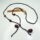 Pulseira feita com grupos de três segmentos de bambu, entremeados por sementes. Os segmentos estão amarrados verticalmente com fio vegetal. As sementes que os separam são em número de três, sendo uma maior vermelha e preta e duas menores pretas. O grupo de bambus do meio possui dois chumaços de penas em tons de roxo, amarelo e preto. As extremidades são formadas por dois segmentos de bambu amarrados obliquamente, formando o feixe, com um pedaço de fio vegetal para amarrar.