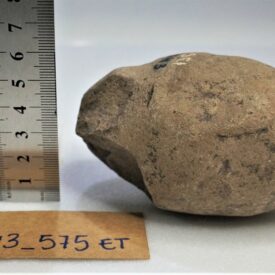Corpo ovoide. Prolongamento esferoide sugere a cabeça. Não há indício dos olhos. A parte inferior desse prolongamento, uma incisão, talvez formasse o bico.