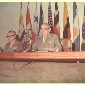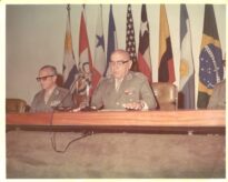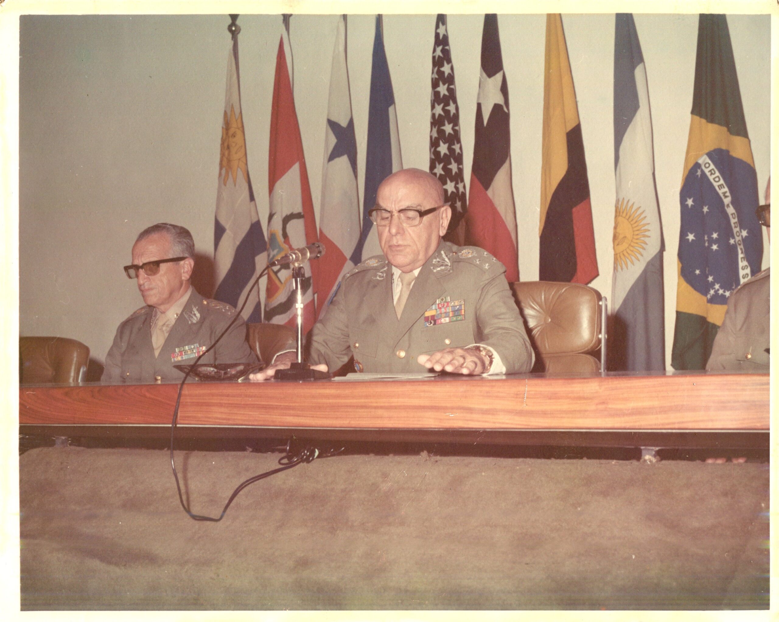 Figura humana: dois homens sentados atrás de uma mesa longa de madeira polida, posicionados lado a lado, cada um em uma cadeira acolchoada de cor clara. Ambos vestem uniformes militares, com insígnias metálicas nos ombros e fileiras de condecorações coloridas no peito, e usam óculos. A pessoa posicionada ao centro, identificada como o General Breno Borges Fortes, encontra-se sentada diretamente atrás de um microfone fixado em um suporte metálico sobre a mesa; a outra encontra-se à esquerda do enquadramento, sem microfone visível à sua frente. Ao fundo, atrás das cadeiras, uma fileira de bandeiras de nove países: Uruguai, Canadá, Panamá, França, Estados Unidos, Chile, Colômbia, Argentina e Brasil. No verso da fotografia, consta a inscrição American Armies – General Breno Borges Fortes, Chief of Staff – Brazilian Army – 12–17 Jun 73. Photo by Larry L. Letzer Sr., US Army Spec Photo Det., Pan.