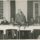 Fotografia em preto e branco, com bordas brancas onduladas, registrando Raul Pilla sentado em uma mesa com toalhas brancas, uma decoração de flores e várias garrafas de vidro. No centro da mesa, um homem moreno, de terno escuro, encontra-se em pé, discursando com o dedo em riste. No verso está escrito Londrina, 25. VII.55