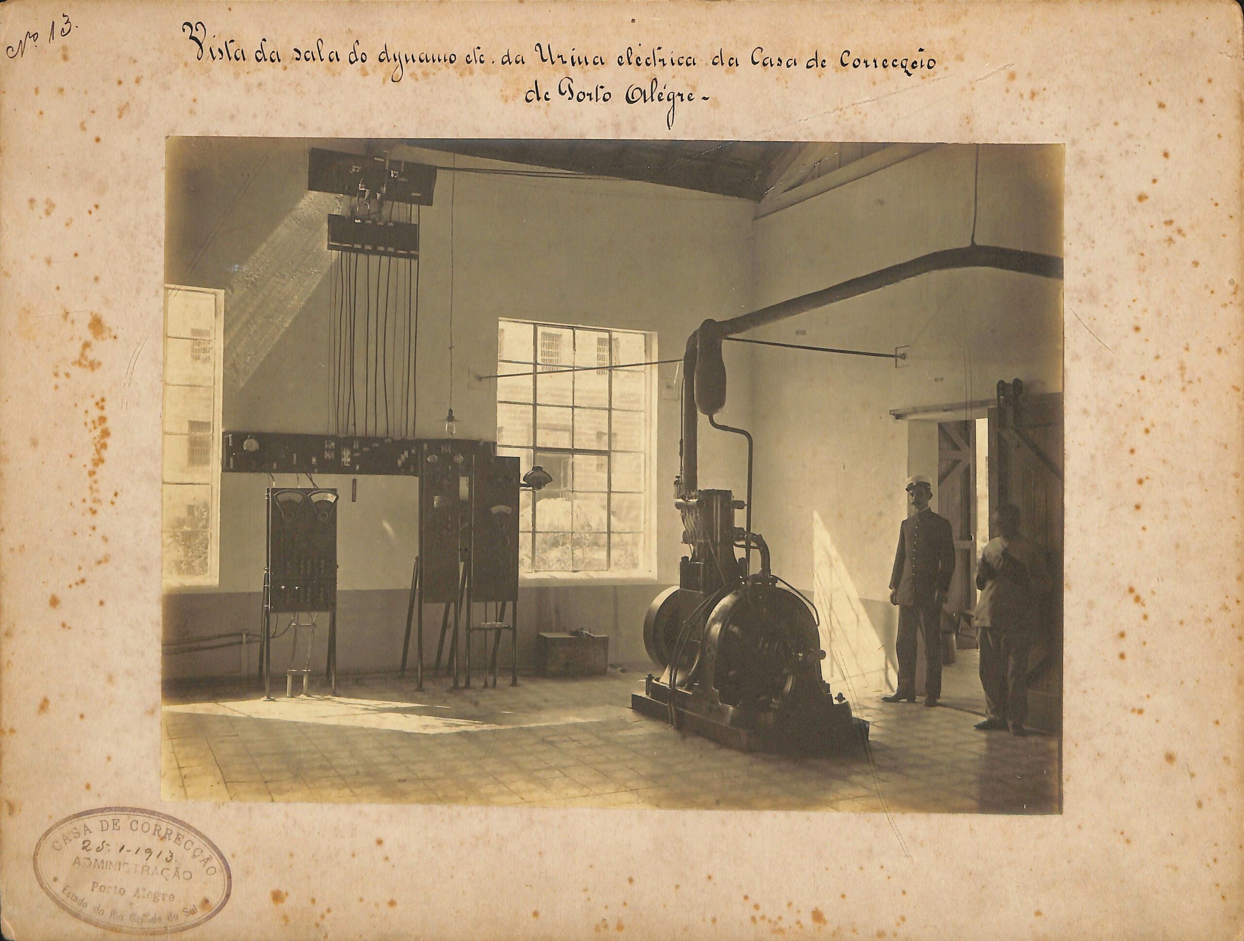 Sala com duas janelas e uma porta, com aparelhos de eletricidade, alguns juntos à parede, outro mais próximo da porta, no meio, perto da qual ha 2 figuras humanas masculinas, vestidas de corpo inteiro, de pé, voltadas para a esquerda, uma delas com uniforme militar.