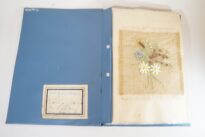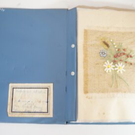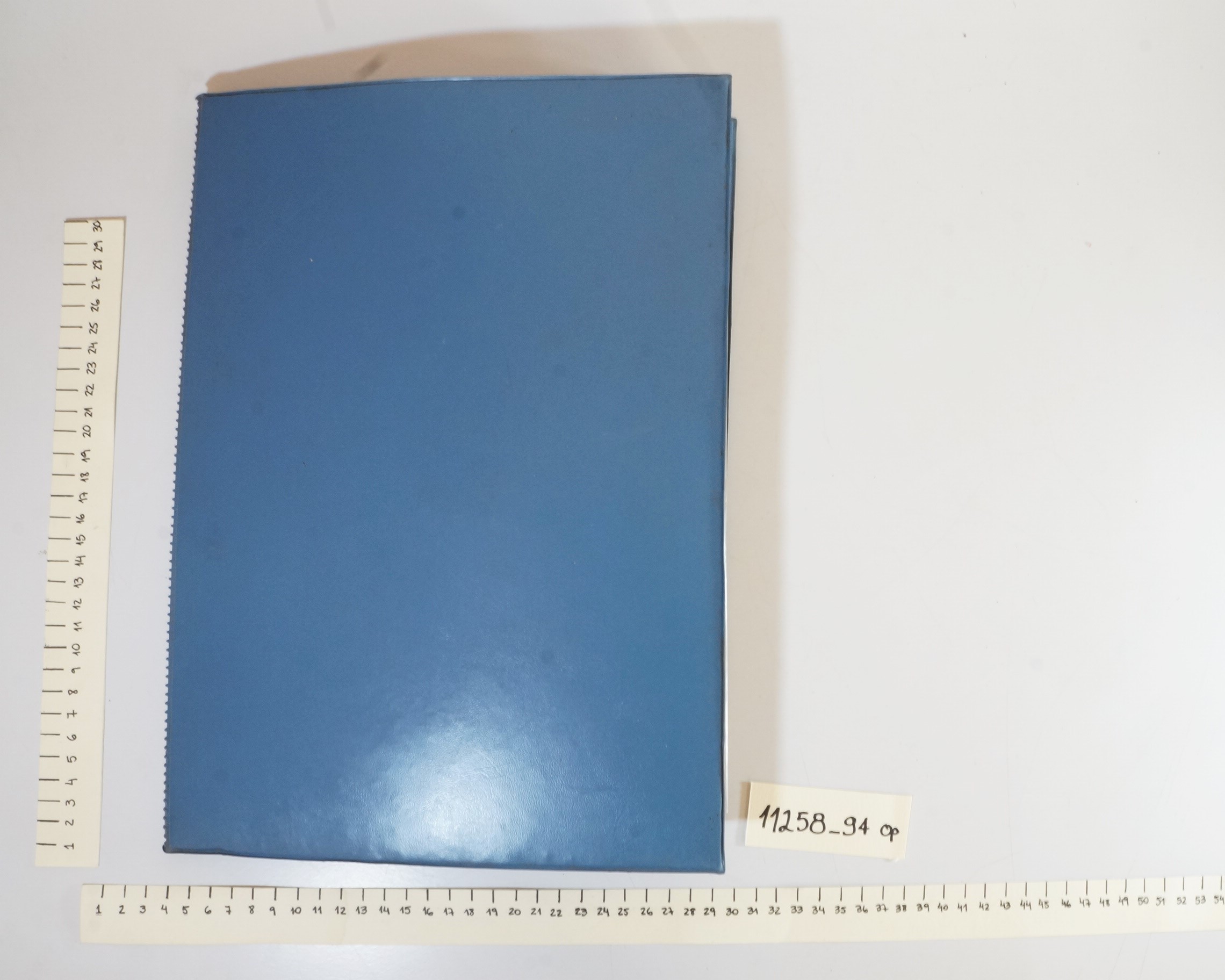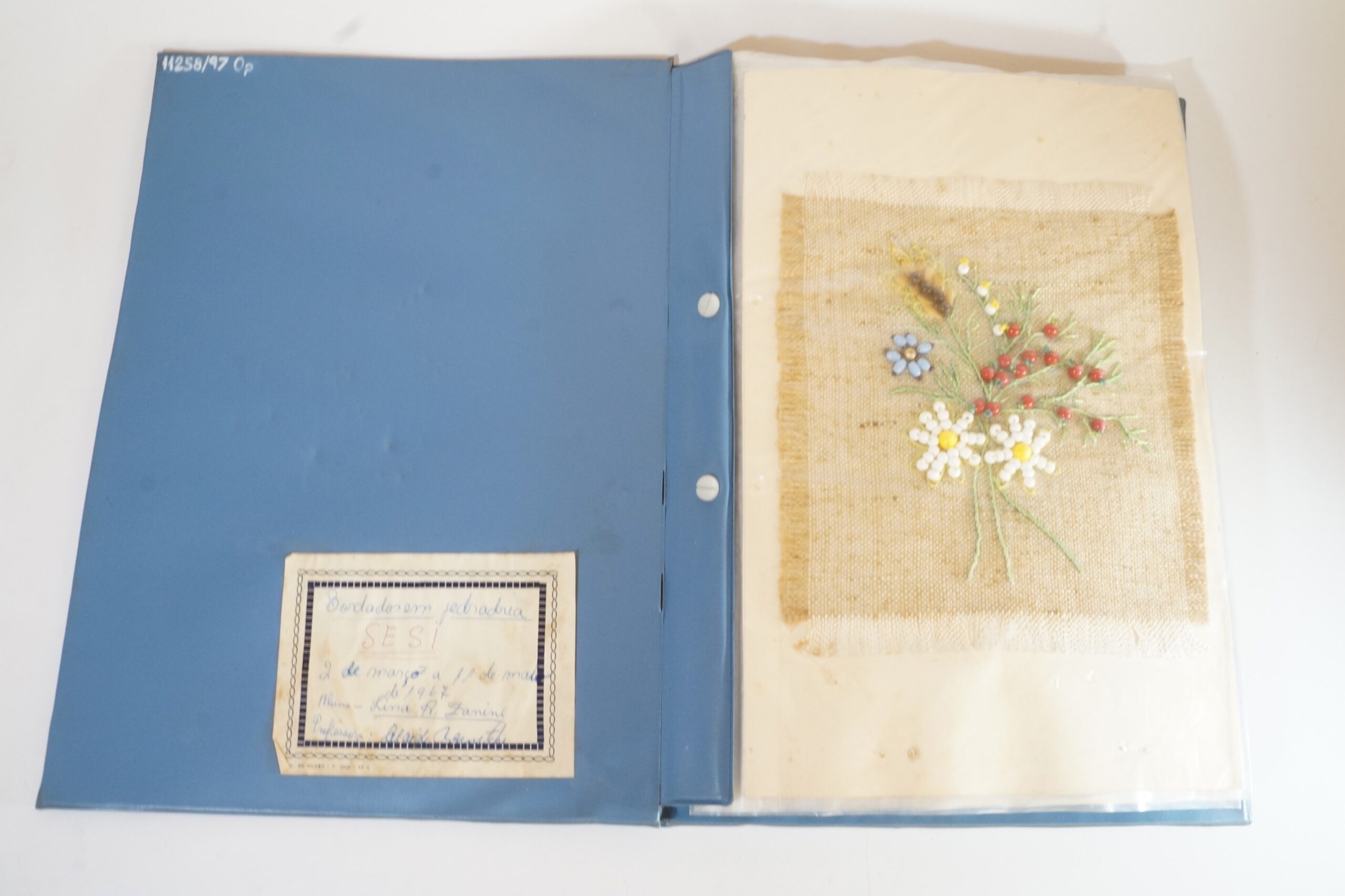 Álbum de capa de plástico na cor azul. Internamente, no verso da capa há uma etiqueta dizendo “Bordados em pedraria SESI. 2 de março a 11 de maio de 1967. Aluna Lina F. Zanini. Professora:”. Acondicionados em folhas de plástico individuais há diversos exercícios de bordado em pedraria.