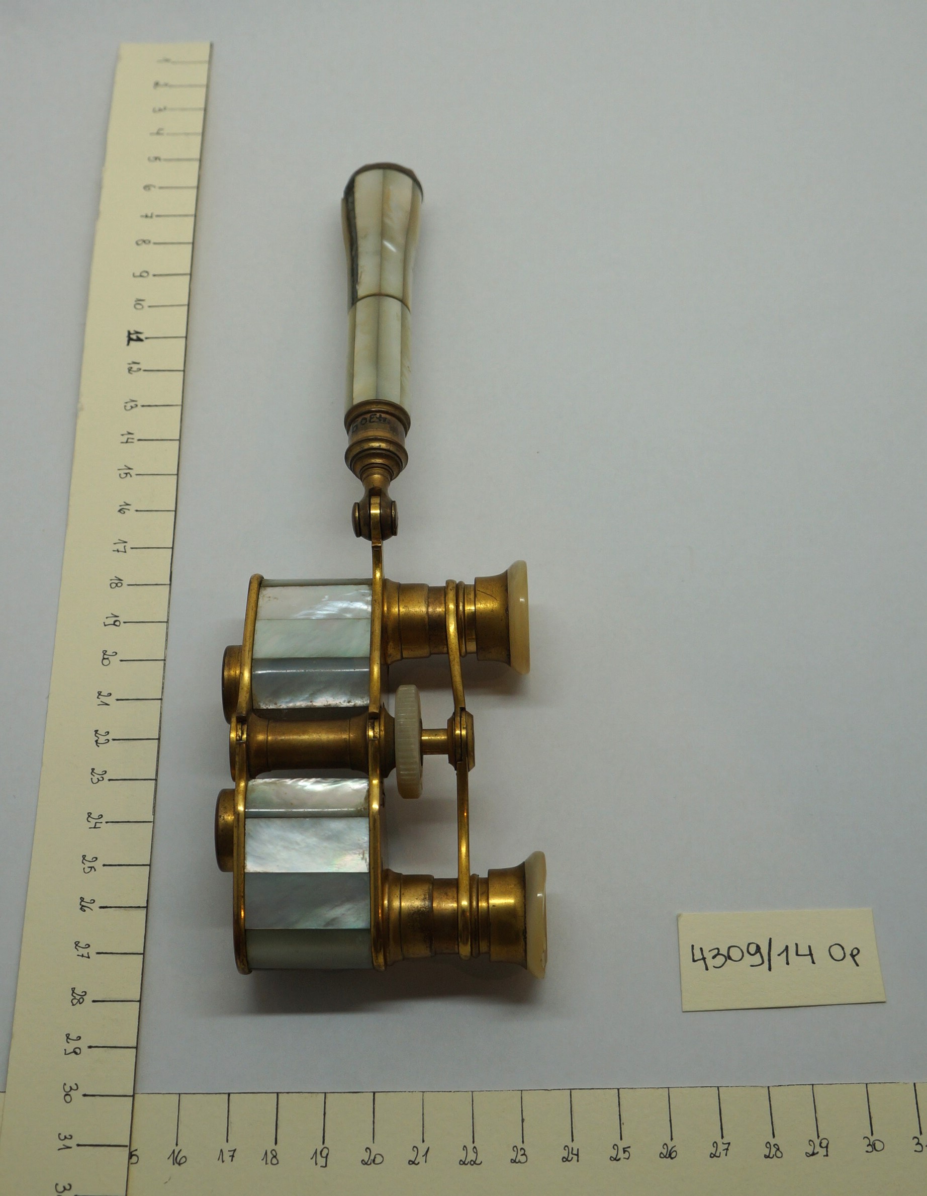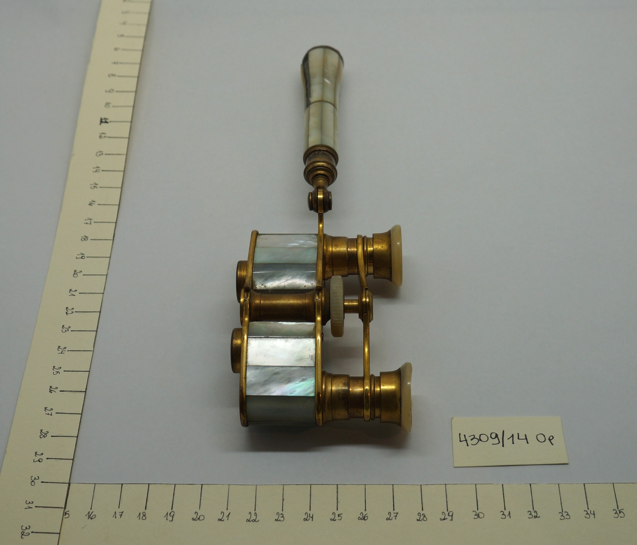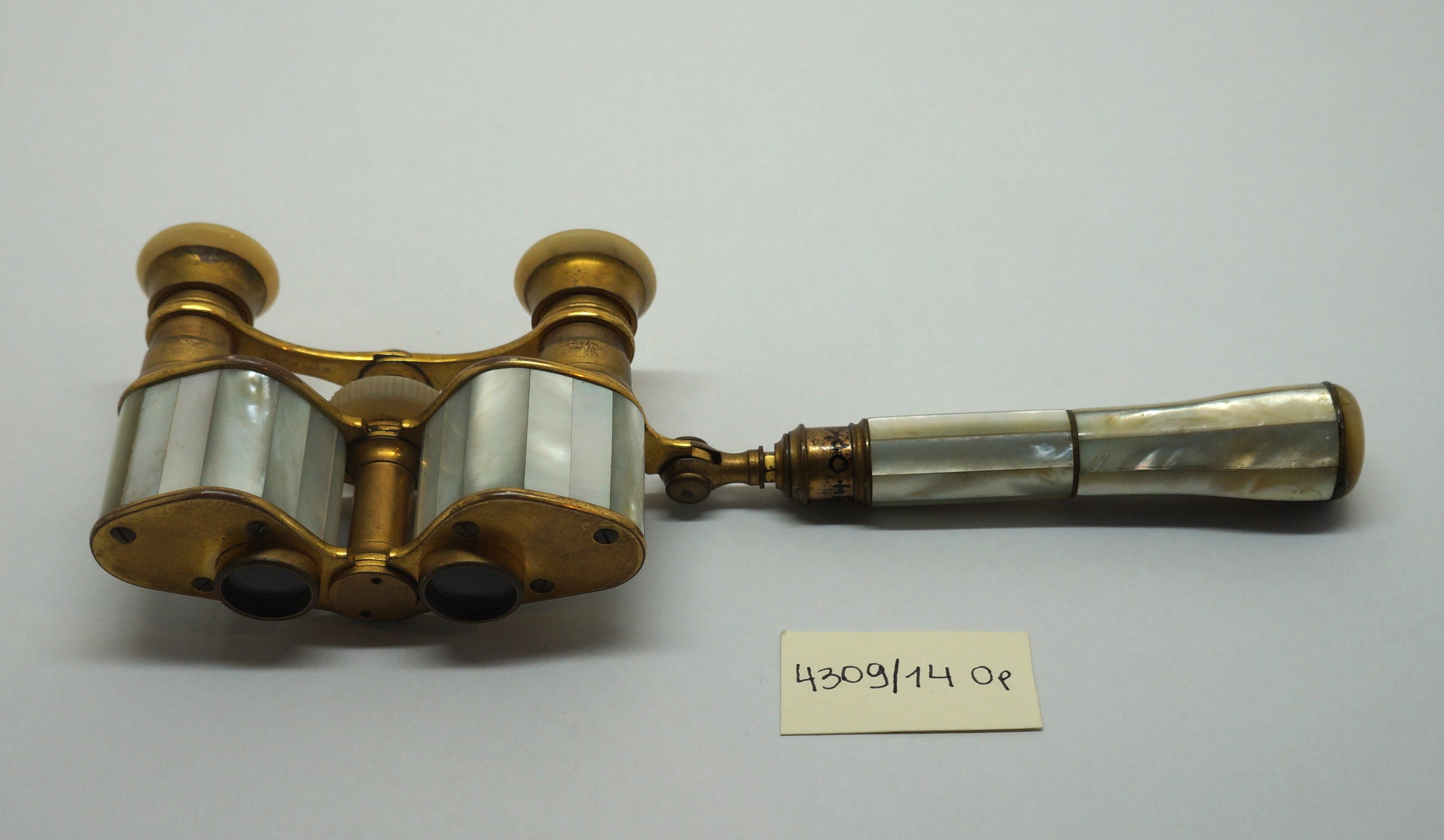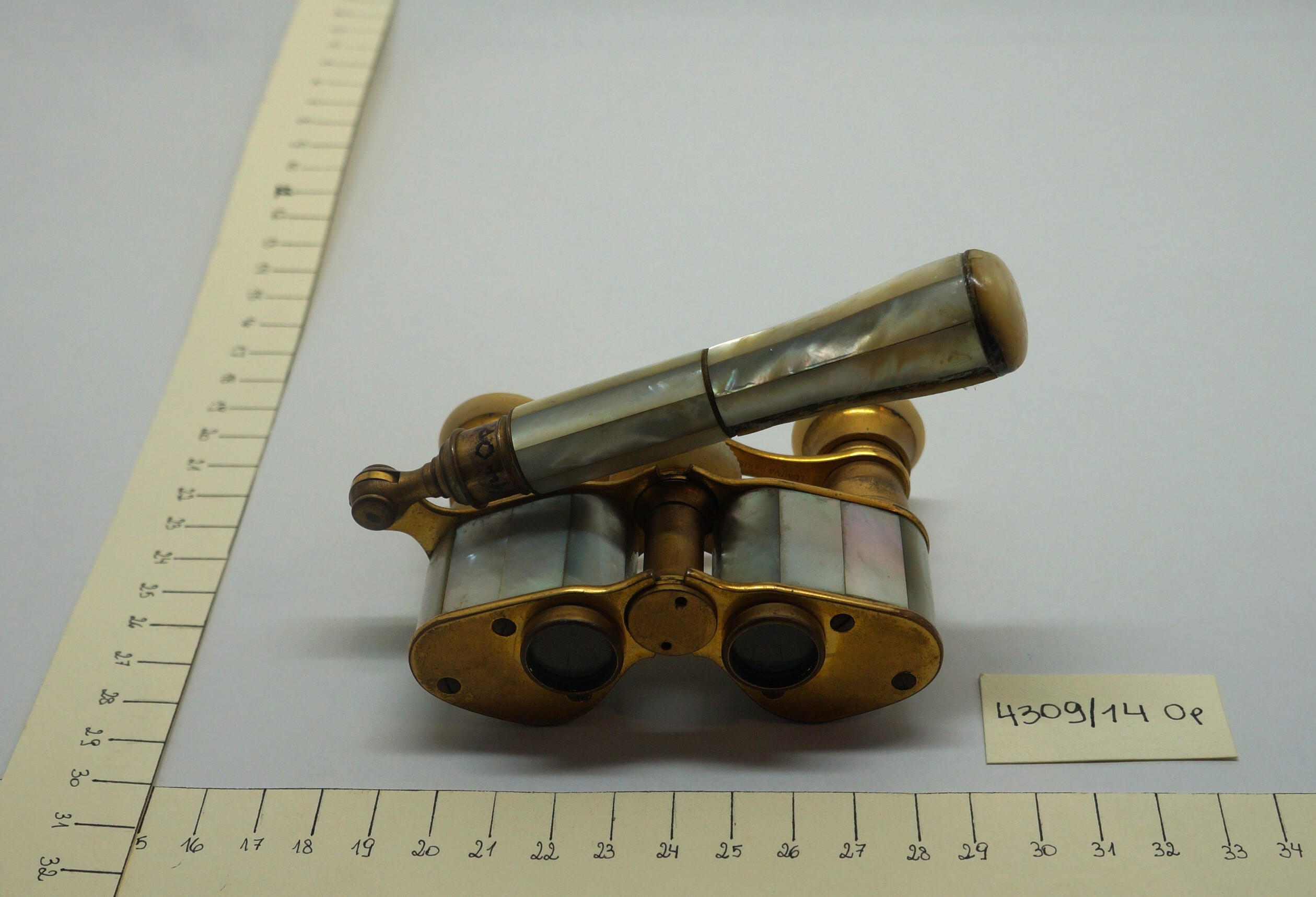 Haste, de formato cilíndrico que se alarga no sentido da extremidade, parte fixa do binóculo, peça que movimenta o foco das lentes e as que se ajustam aos olhos são revestidas de madrepérola. Onze pedaços de madrepérola furta-cor sobre cada lado da parte fixa do binóculo. Na parte superior, em metal dourado, onde as duas lunetas se unem, encontra-se gravado 3 1/2 X. Rodeando o parafuso central que une as duas partes do binóculo lê-se 60/70.