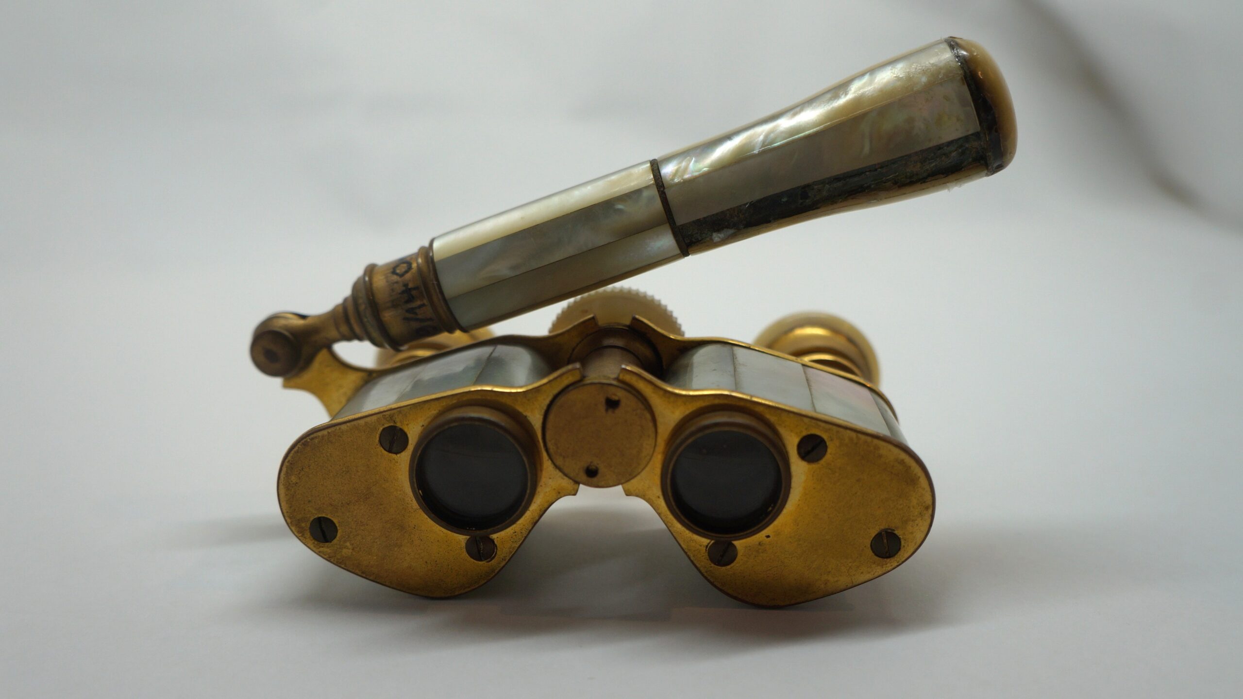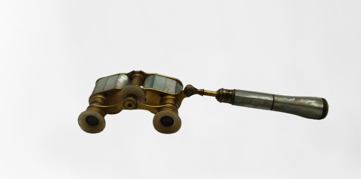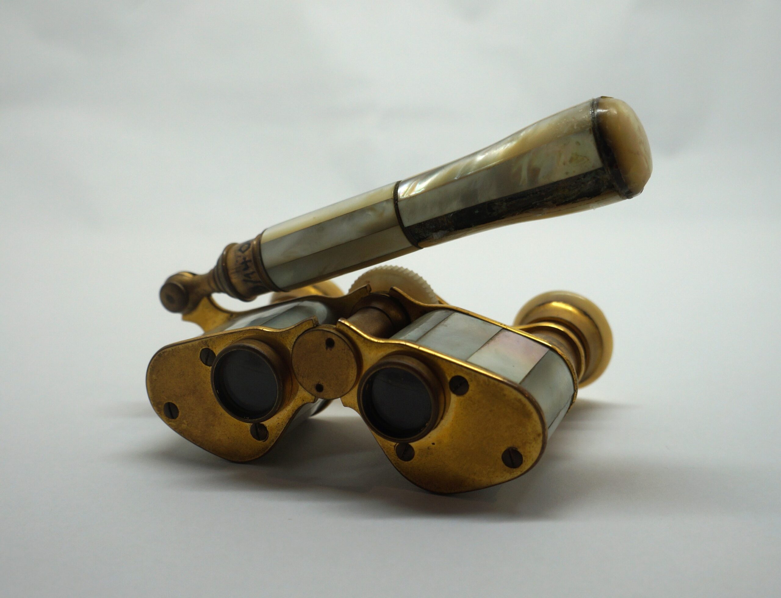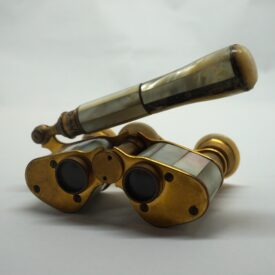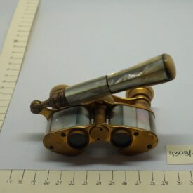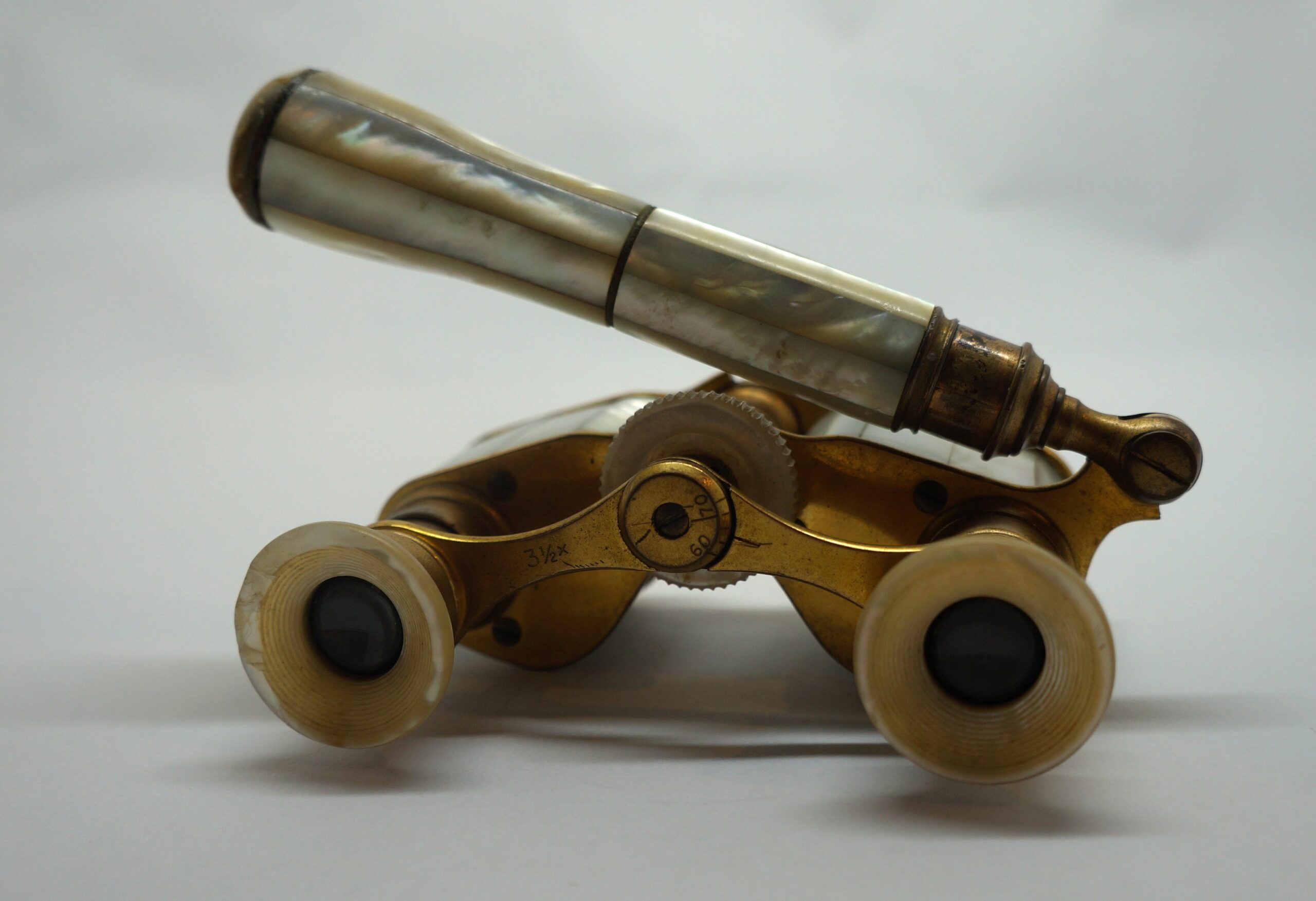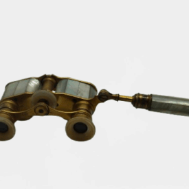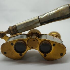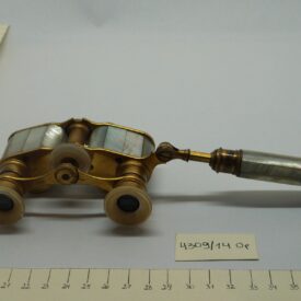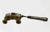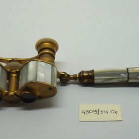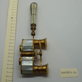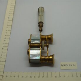 Haste, de formato cilíndrico que se alarga no sentido da extremidade, parte fixa do binóculo, peça que movimenta o foco das lentes e as que se ajustam aos olhos são revestidas de madrepérola. Onze pedaços de madrepérola furta-cor sobre cada lado da parte fixa do binóculo. Na parte superior, em metal dourado, onde as duas lunetas se unem, encontra-se gravado 3 1/2 X. Rodeando o parafuso central que une as duas partes do binóculo lê-se 60/70.
