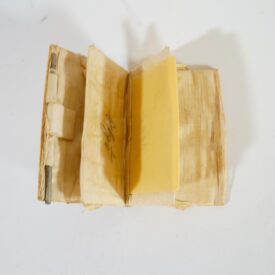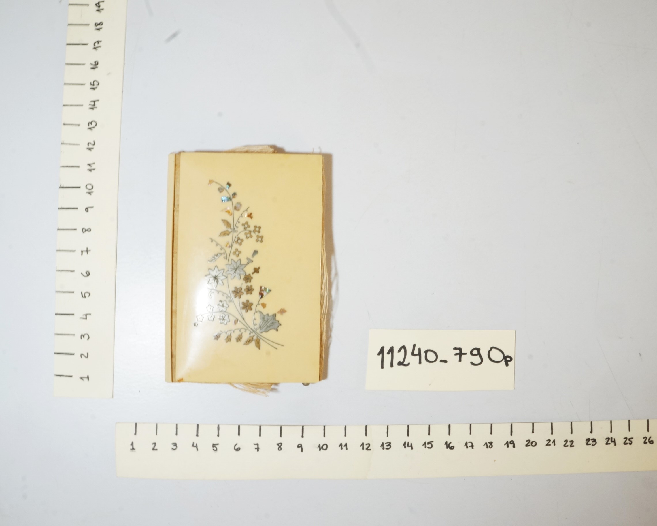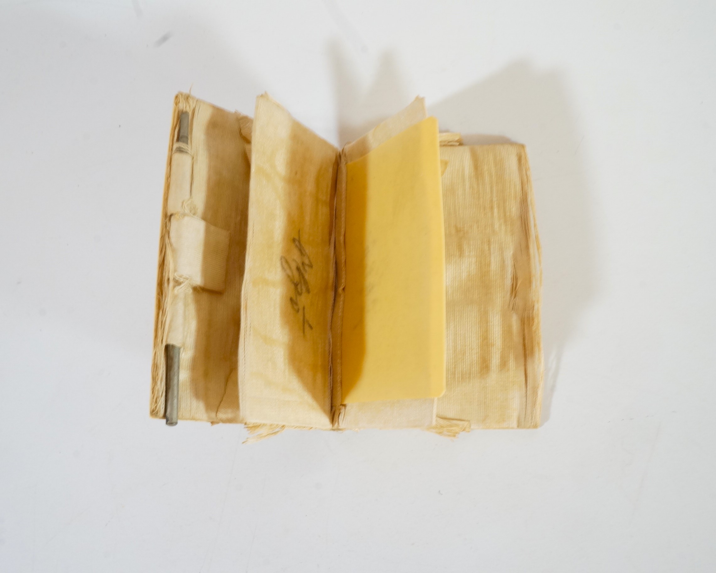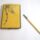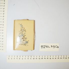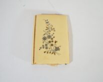 Caderneta floral feminina. Parte externa apresenta material duro opaco na cor amarela com desenhos florais prateados no centro, com detalhes em madrepérola. Internamente é revestida de tecido bege, possui três abas, duas revestidas com tecido e uma com plástico. Lapiseira em suporte de metal, sem grafite. Assinatura ilegível na primeira aba interna.