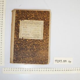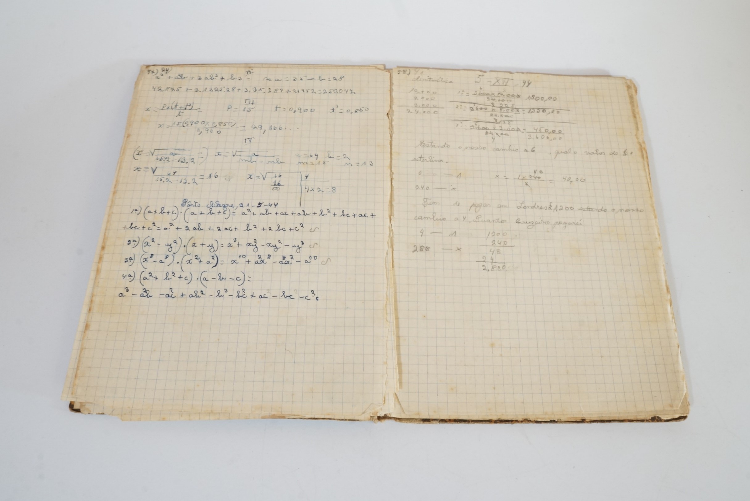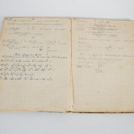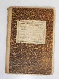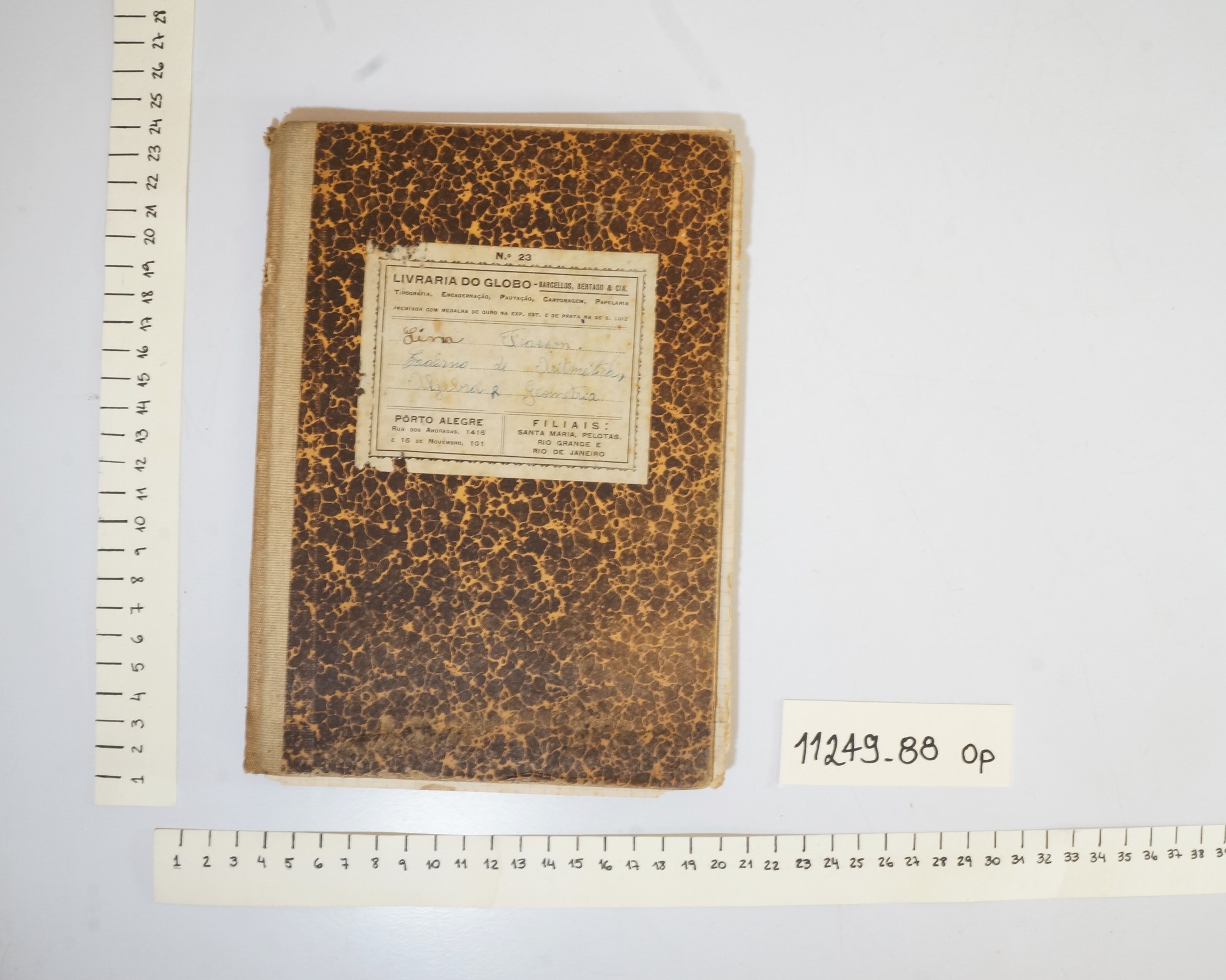 Caderno com a capa de fundo laranja claro praticamente coberto por desenhos de manchas pretas, com a etiqueta da Livraria do Globo, na qual consta os dados da usuária: ”Lina Frasson, Caderno de Aritmética, Algebra e Geometria”, escrito de caneta azul, com exceção de Lina, escrito de caneta preta. As folhas internas são quadriculadas, com os quadriculados feitos em cor azul.