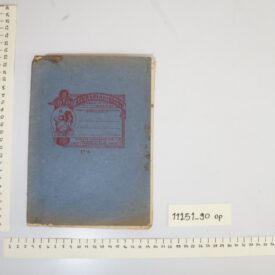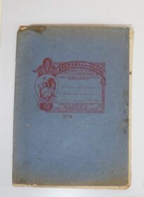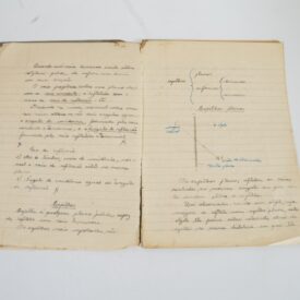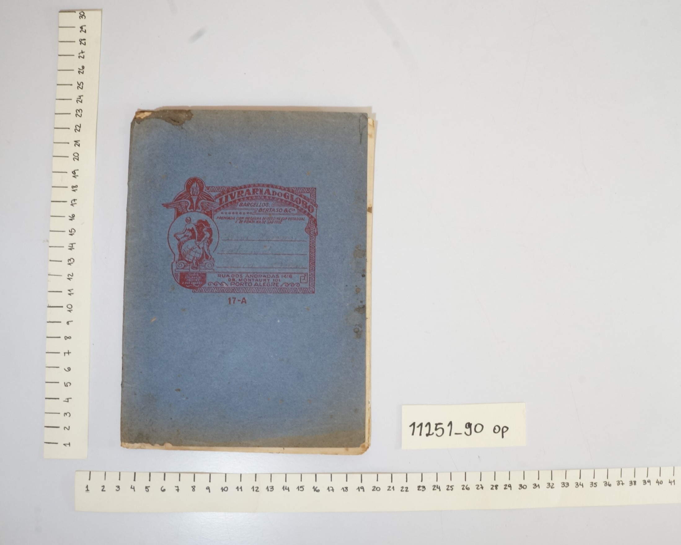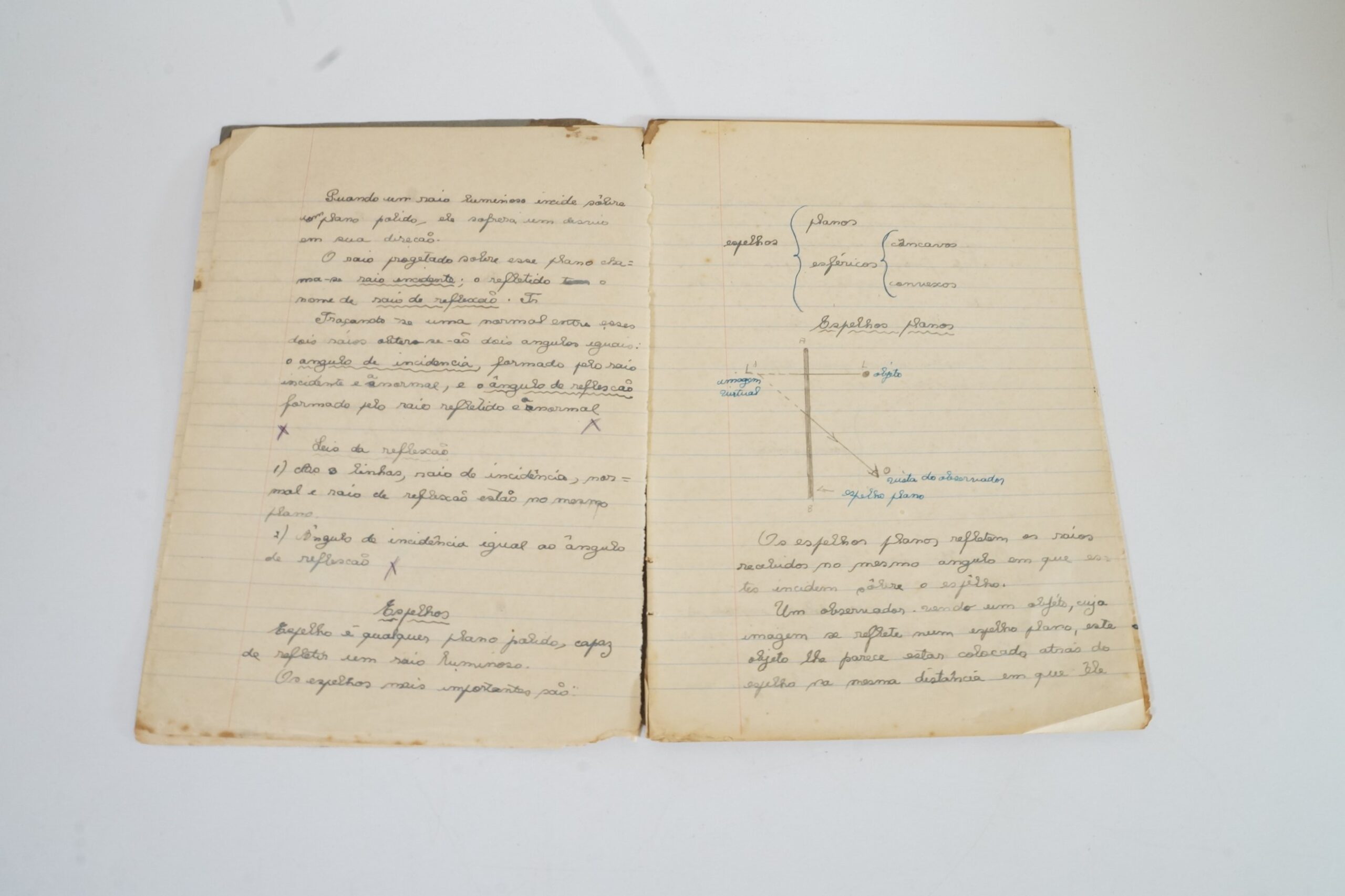 Caderno com a capa da cor azul com a etiqueta da Livraria do Globo, na qual constam os dados da usuária: ”Lina Frasson, Caderno de Física (palavra apagada)”escritos a lápis. As folhas internas possuem pauta em cor azul.