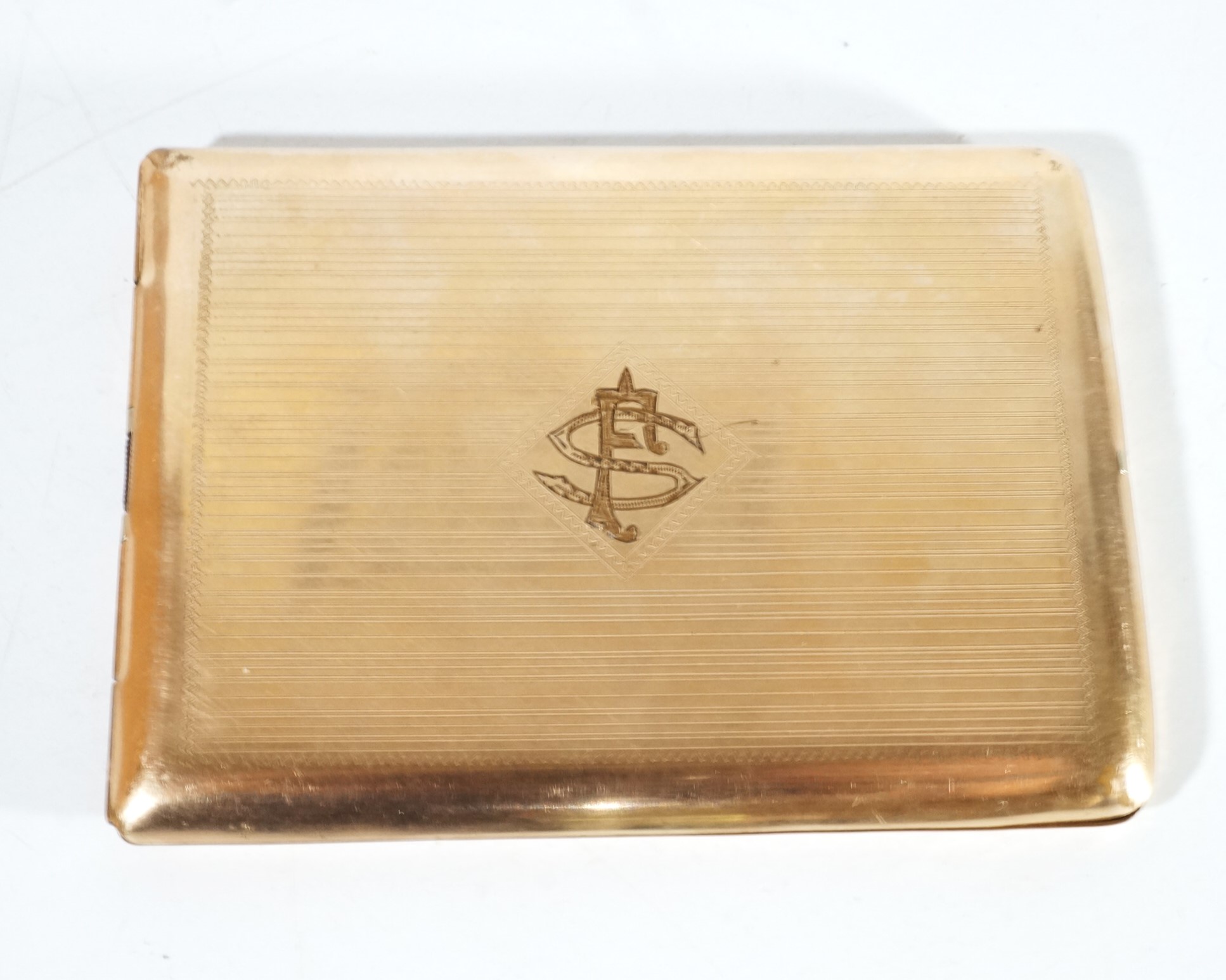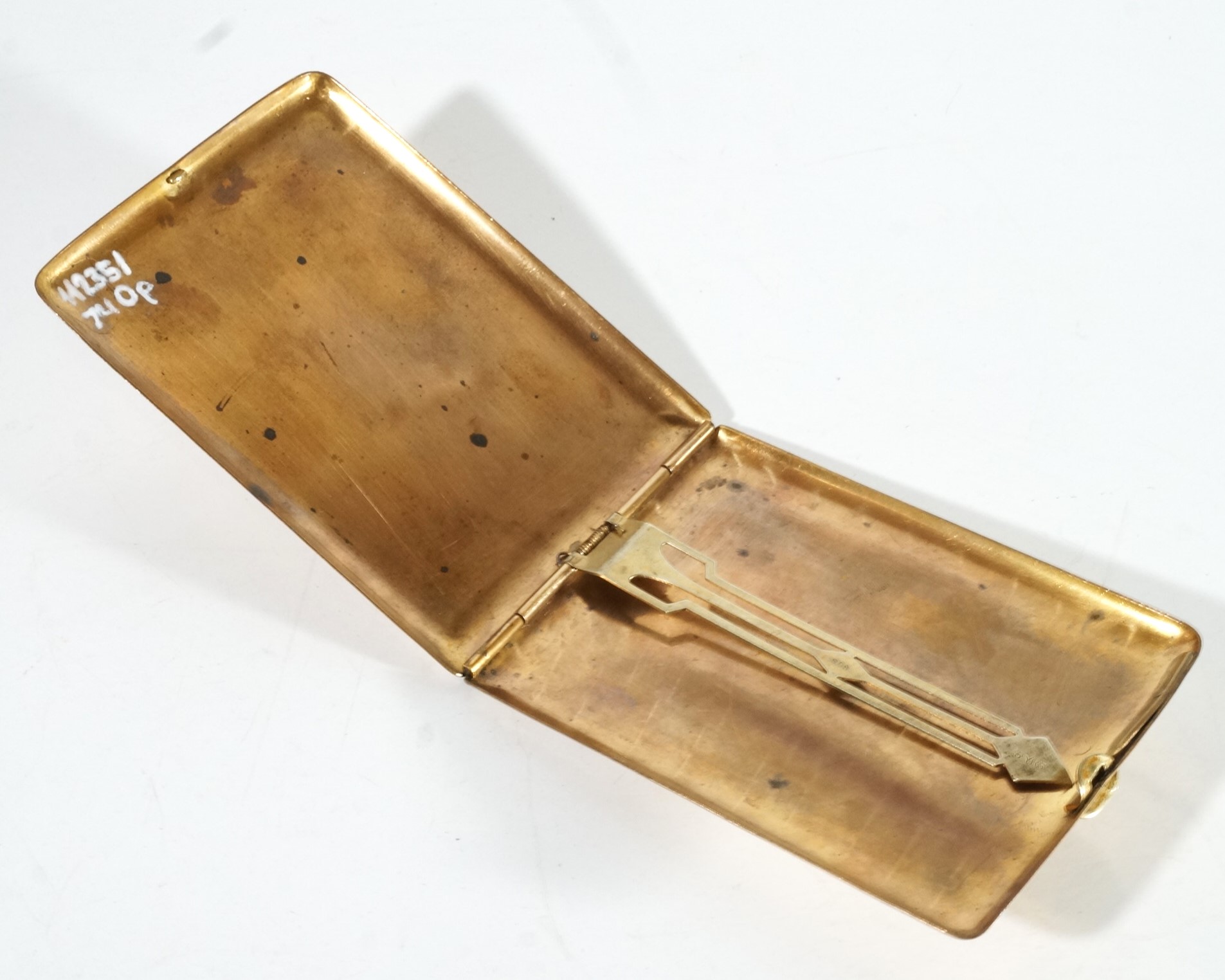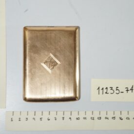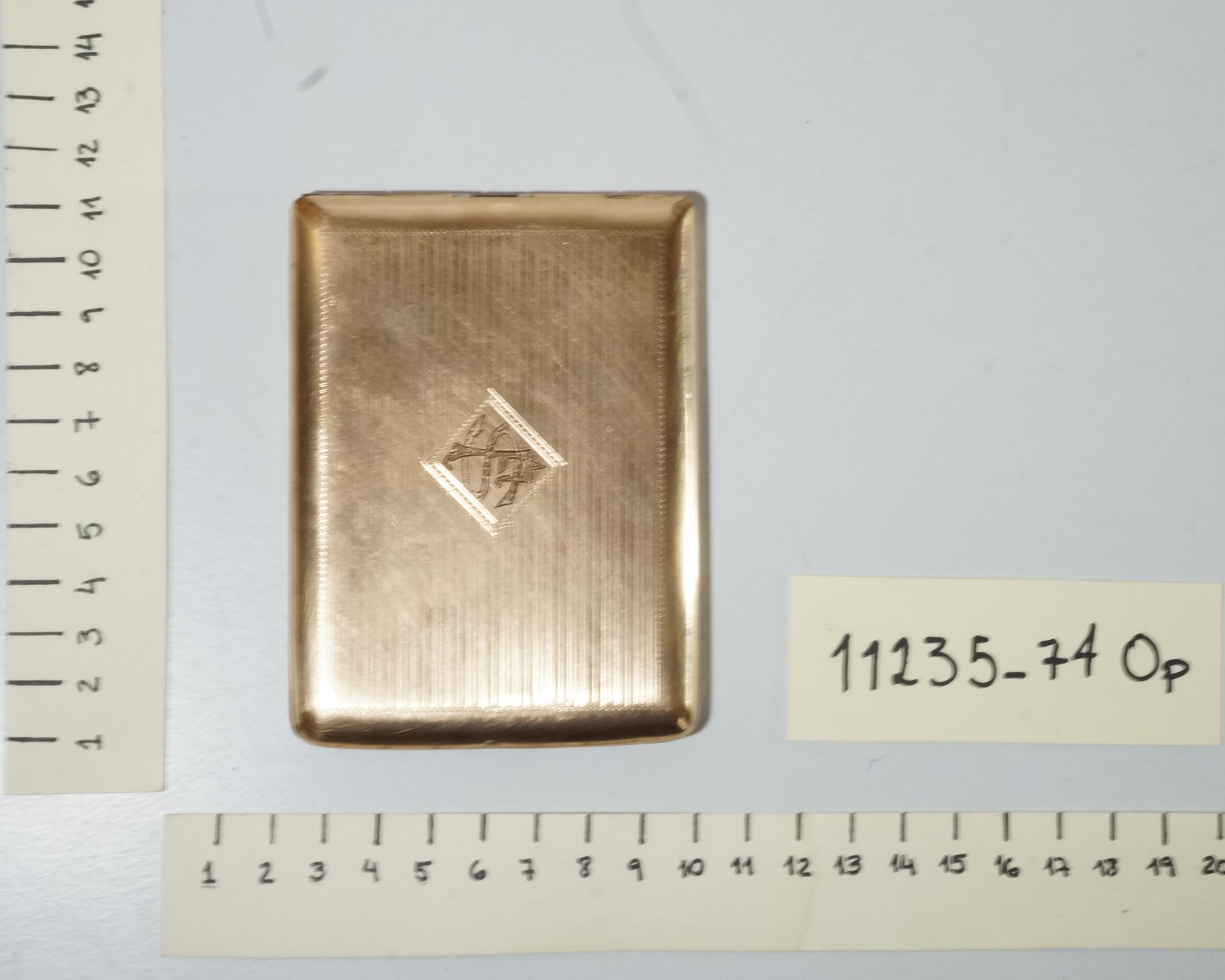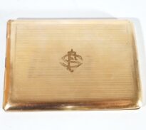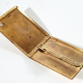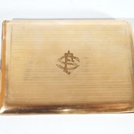 Cigarreira de metal dourado, com abertura por meio de fecho de pressão, tendo na tampa as iniciais “FFS” gravadas. Internamente, possui um dispositivo para segurar os cigarros enfileirados.