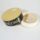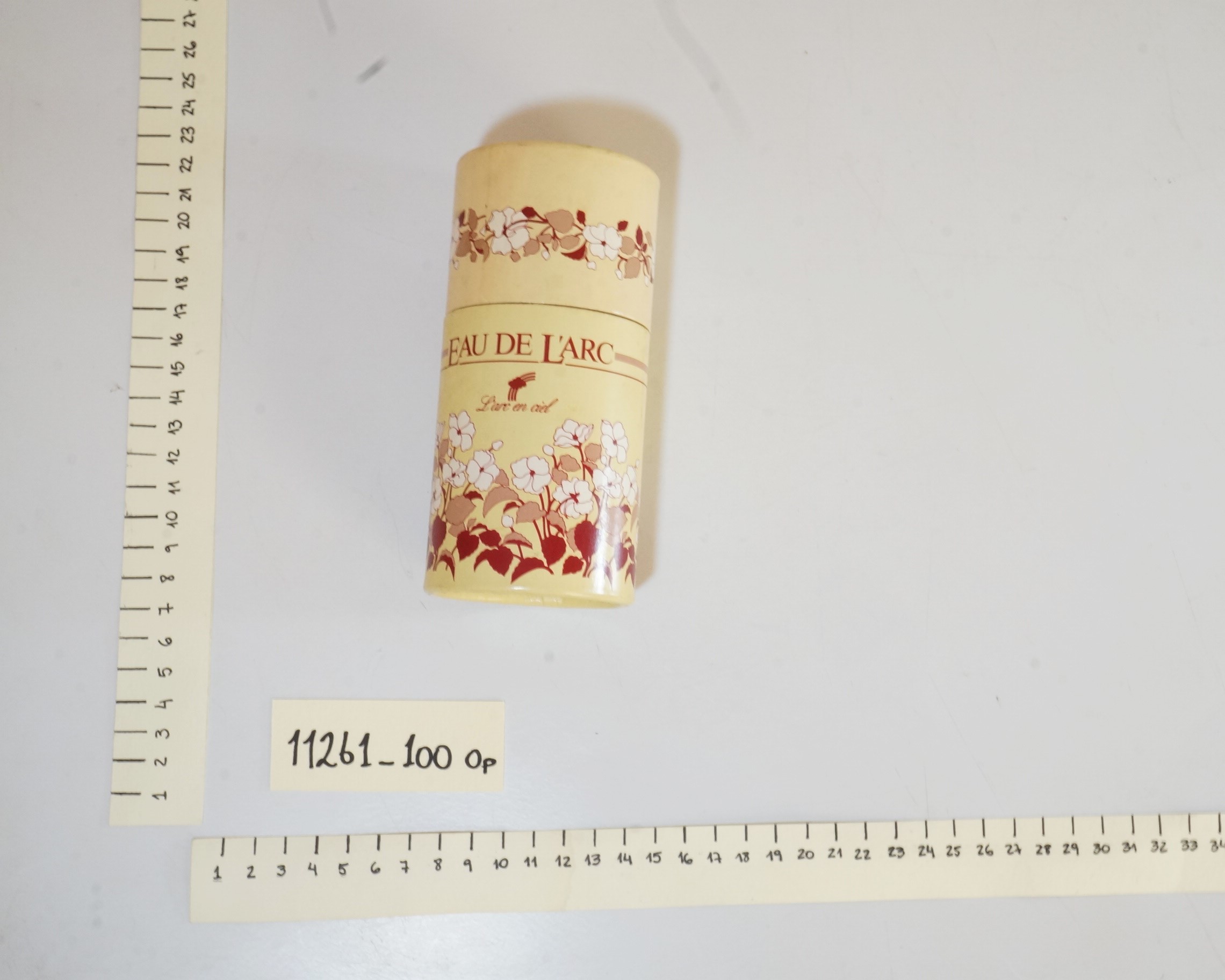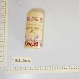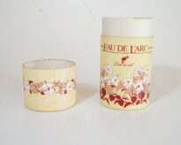 Embalagem antiga de desodorizante da marca “L’arc em ciel, produzido em São Paulo”. Embalagem em formato cilíndrico, de cor bege, decorada com desenhos de flores em tons brancos, cinzas e bordô. Também na cor bordô está escrito “EAU DE L’ARC – Larc em ciel”.