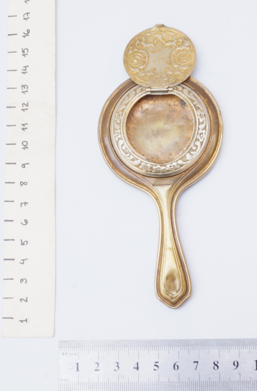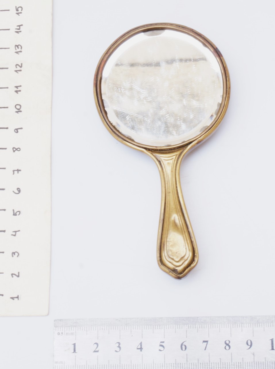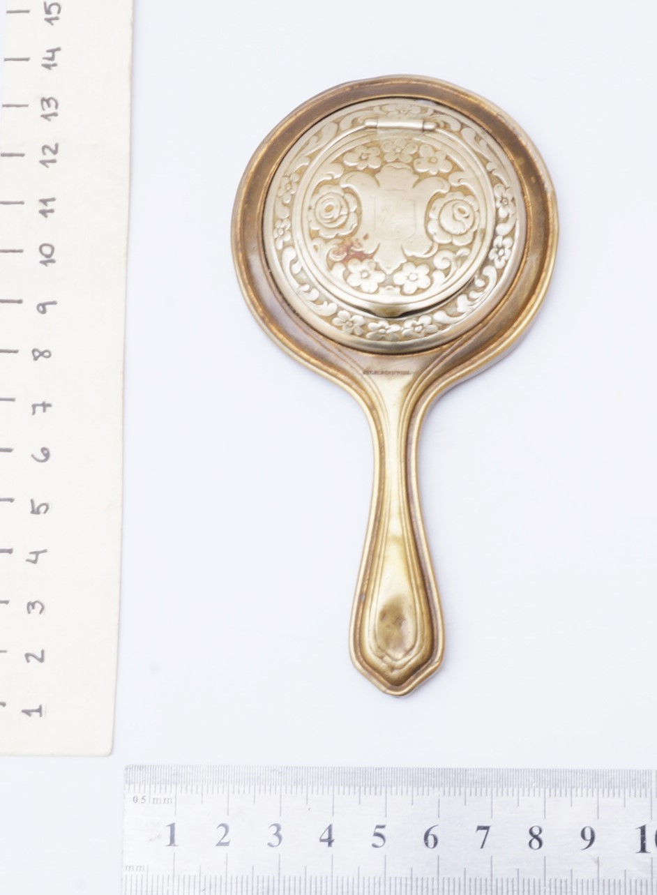 Espelho de mão de latão cor de cobre, com cabeça de formato circular e cabo. O espelho de vidro é bisotado/bisotê. Parte de trás da cabeça possui adornos impressos em alto relevo. Nela encontra-se um compartimento redondo com tampa, a qual está presa ao corpo do objeto por uma dobradiça na parte superior. Abaixo deste compartimento foi impresso em baixo relevo os dados do fabricante, mas o tamanho reduzido do texto dificulta sua leitura. Pertenceu a Iná Amaral da Silva Maciel.