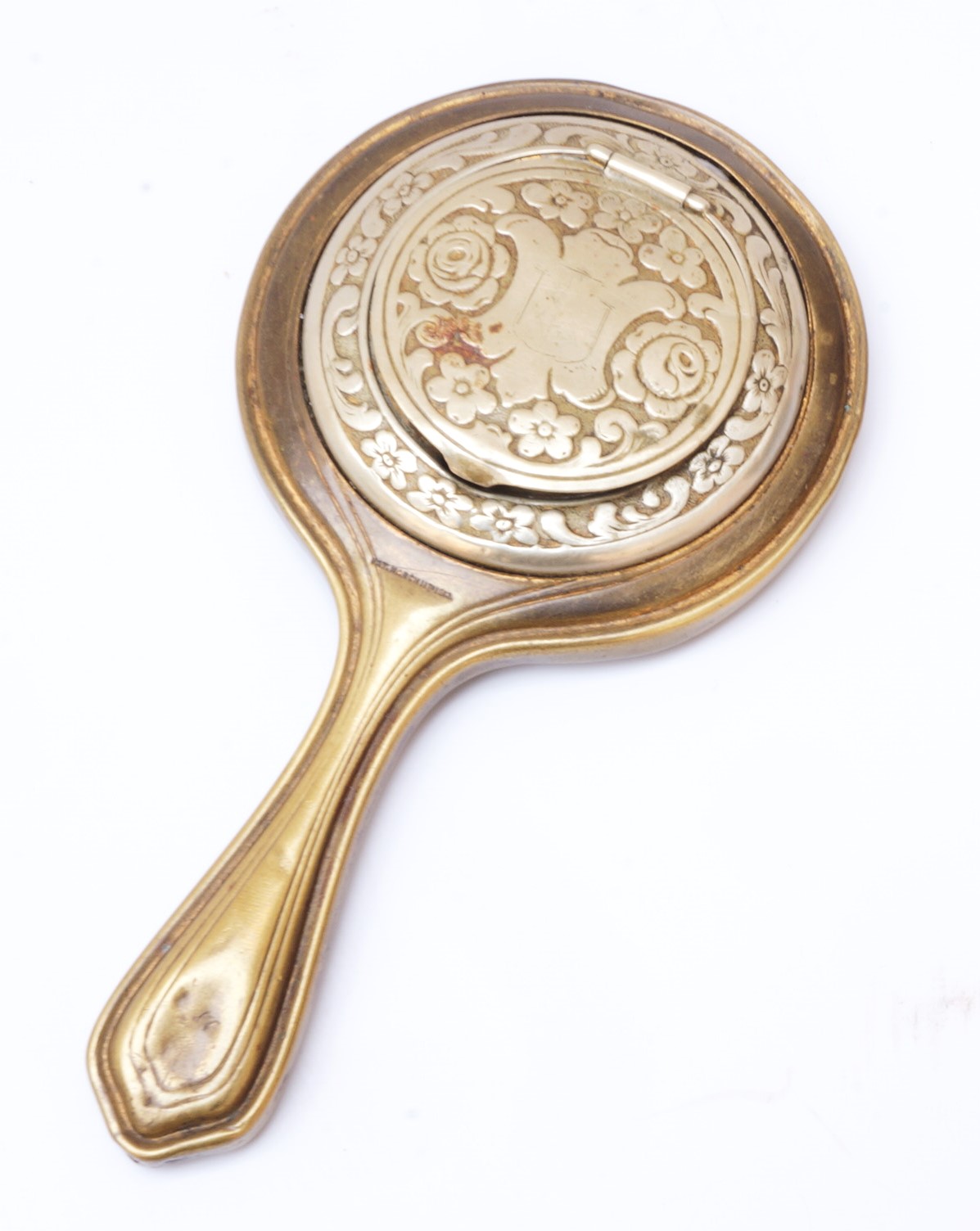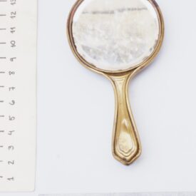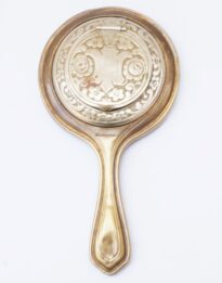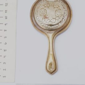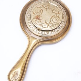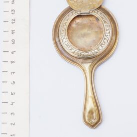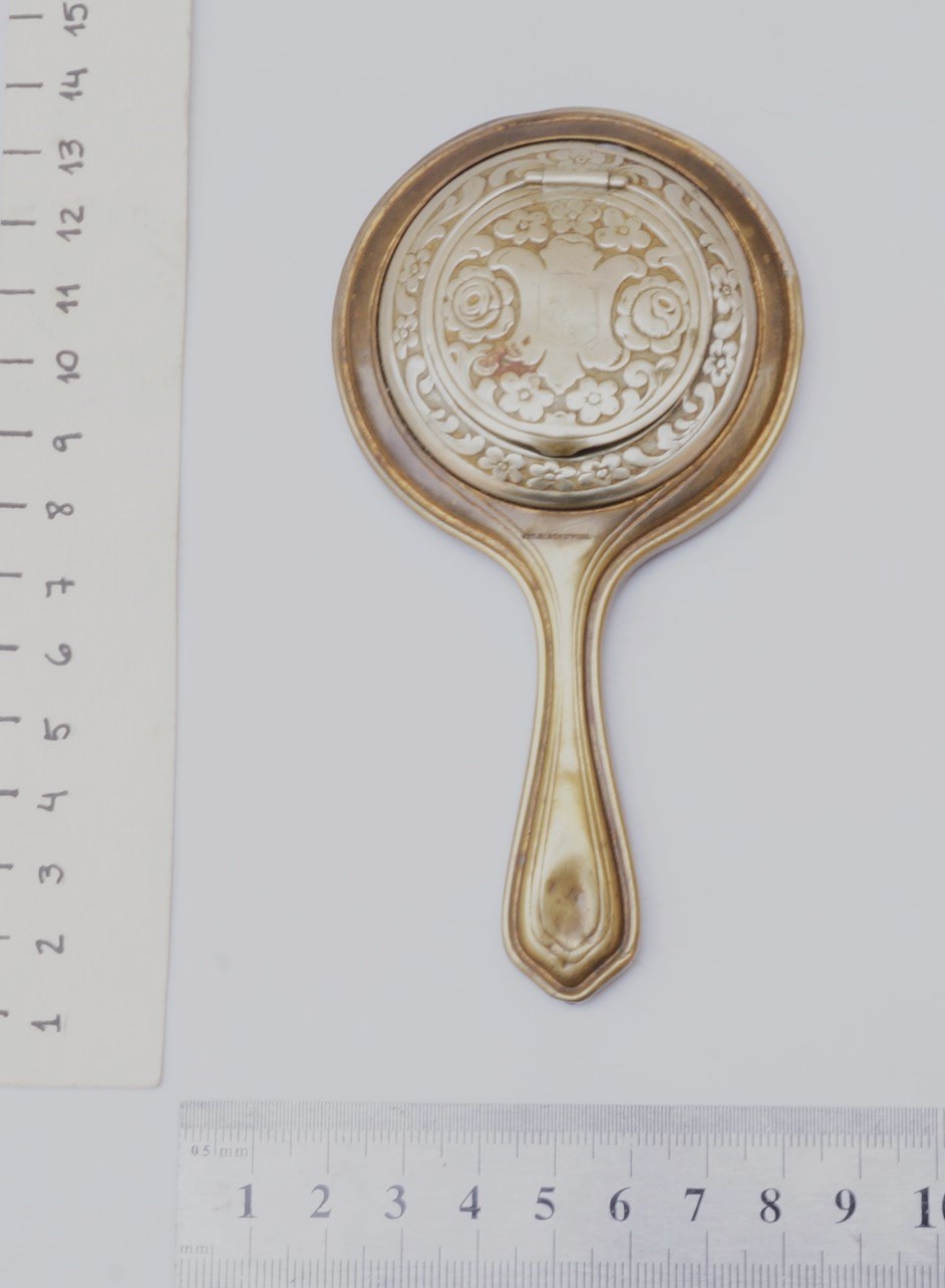 Espelho de mão de latão cor de cobre, com cabeça de formato circular e cabo. O espelho de vidro é bisotado/bisotê. Parte de trás da cabeça possui adornos impressos em alto relevo. Nela encontra-se um compartimento redondo com tampa, a qual está presa ao corpo do objeto por uma dobradiça na parte superior. Abaixo deste compartimento foi impresso em baixo relevo os dados do fabricante, mas o tamanho reduzido do texto dificulta sua leitura. Pertenceu a Iná Amaral da Silva Maciel.