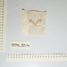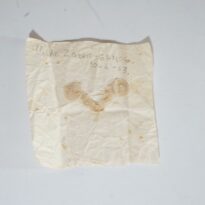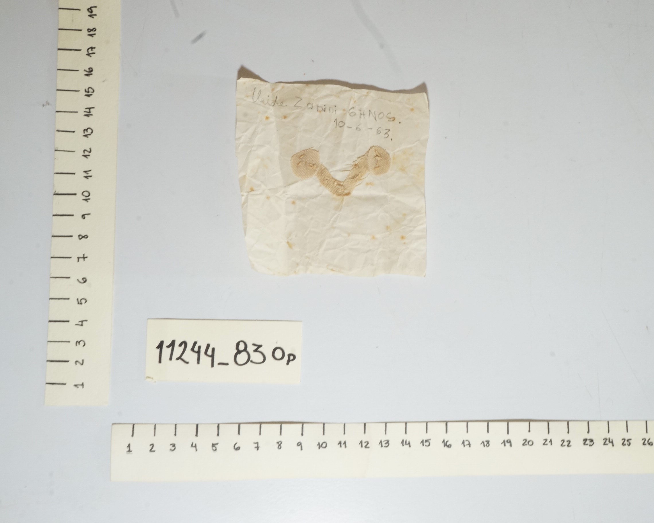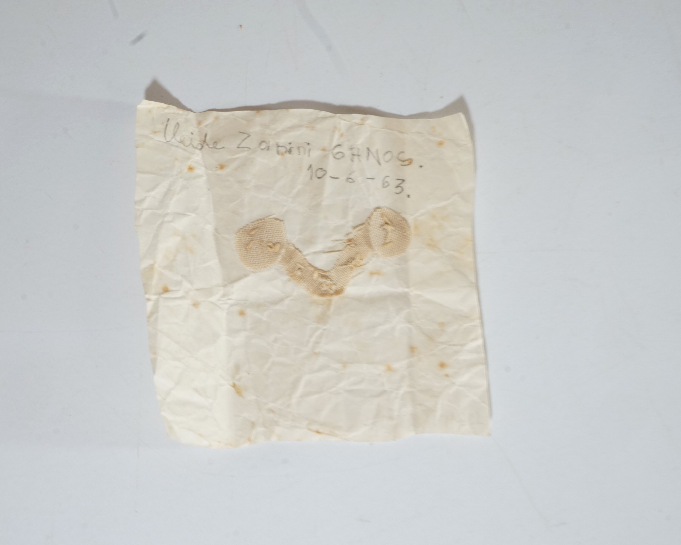 Pedaço de papel já envelhecido pelo tempo, com um registro em lápis de escrever na parte superior do papel dizendo “Cleide Zanini – 6 anos. 10 – 6 – 63”. Abaixo do registro escrito há um exercício de bordado na forma de V. Tecido e linhas são de cor bege.