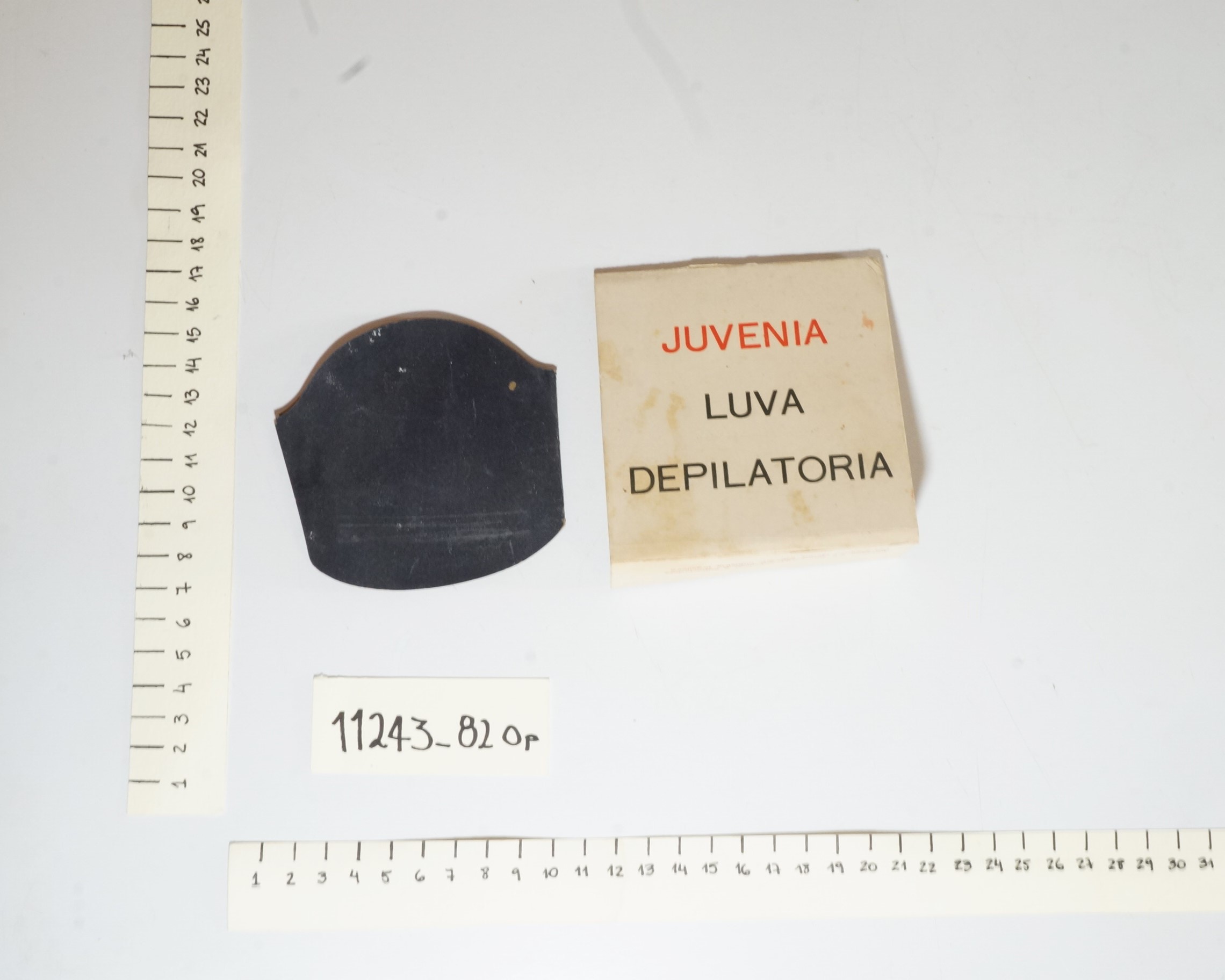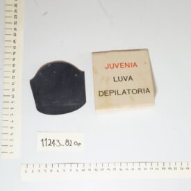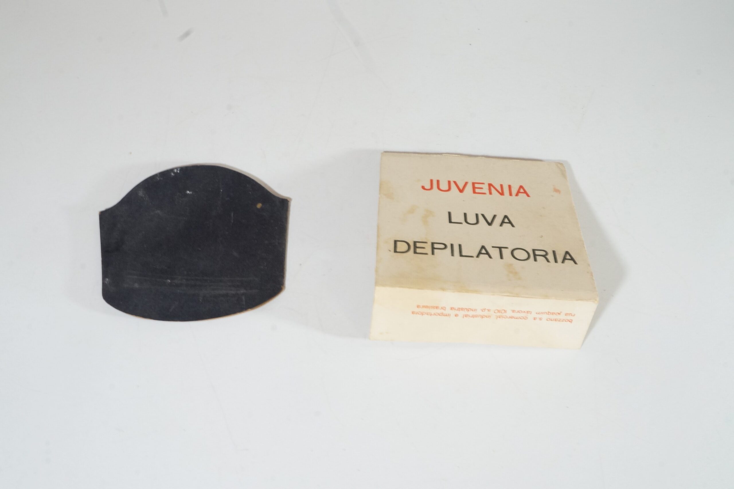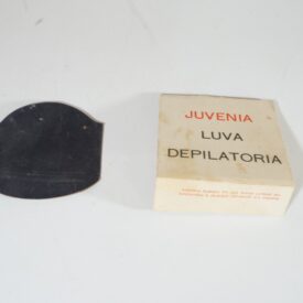 Luva depilatória Juvenia da marca “Bozzano S.A”, acondicionada no envelope original. A luva é da cor preta e possui a textura semelhante a uma lixa. O envelope é da cor branca, tendo na frente a palavra “Juvenia” escrita de vermelho e Luva Depilatória escrita de preto. No verso do envelope constam informações sobre o produto, seu uso e empresa fabricante.