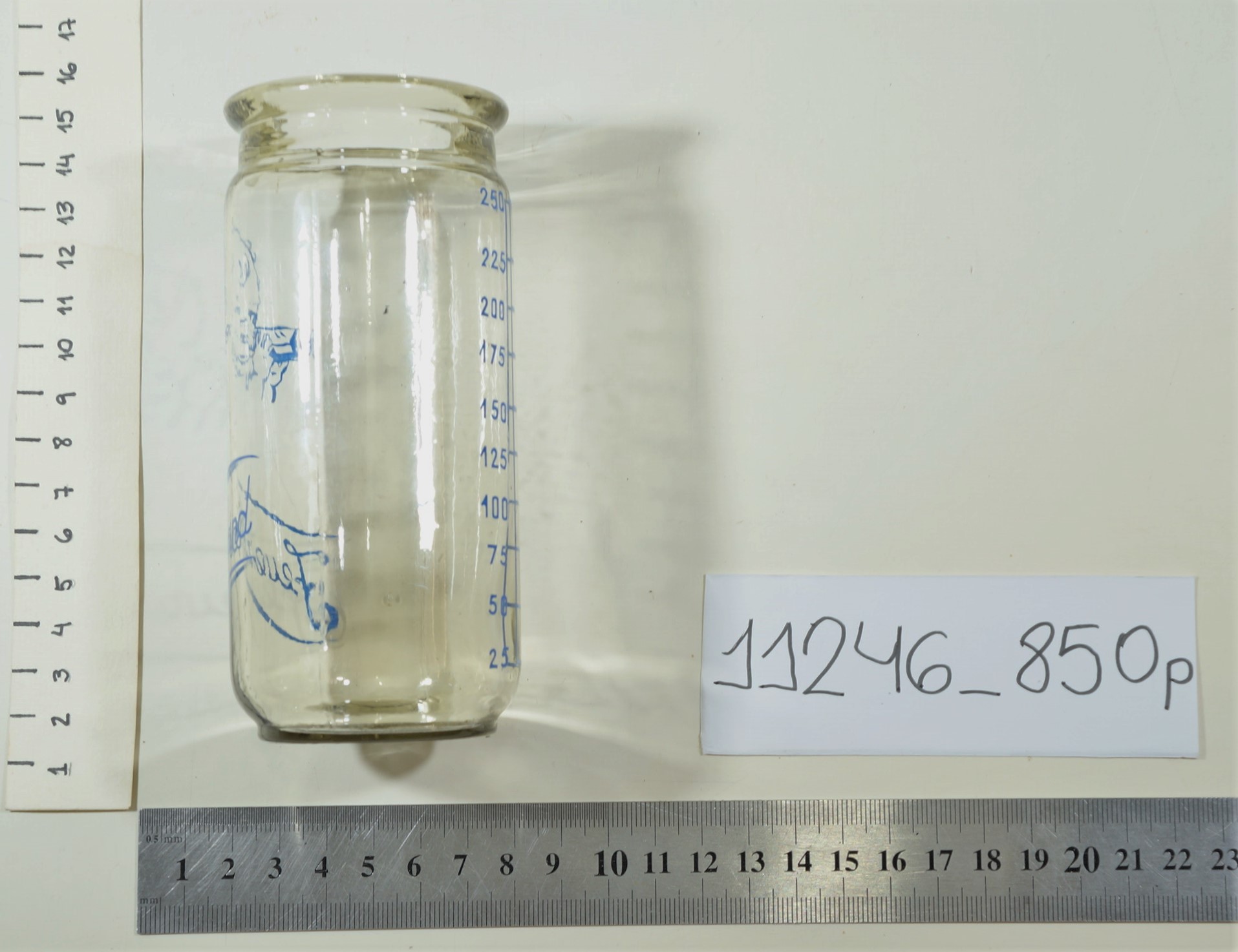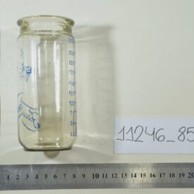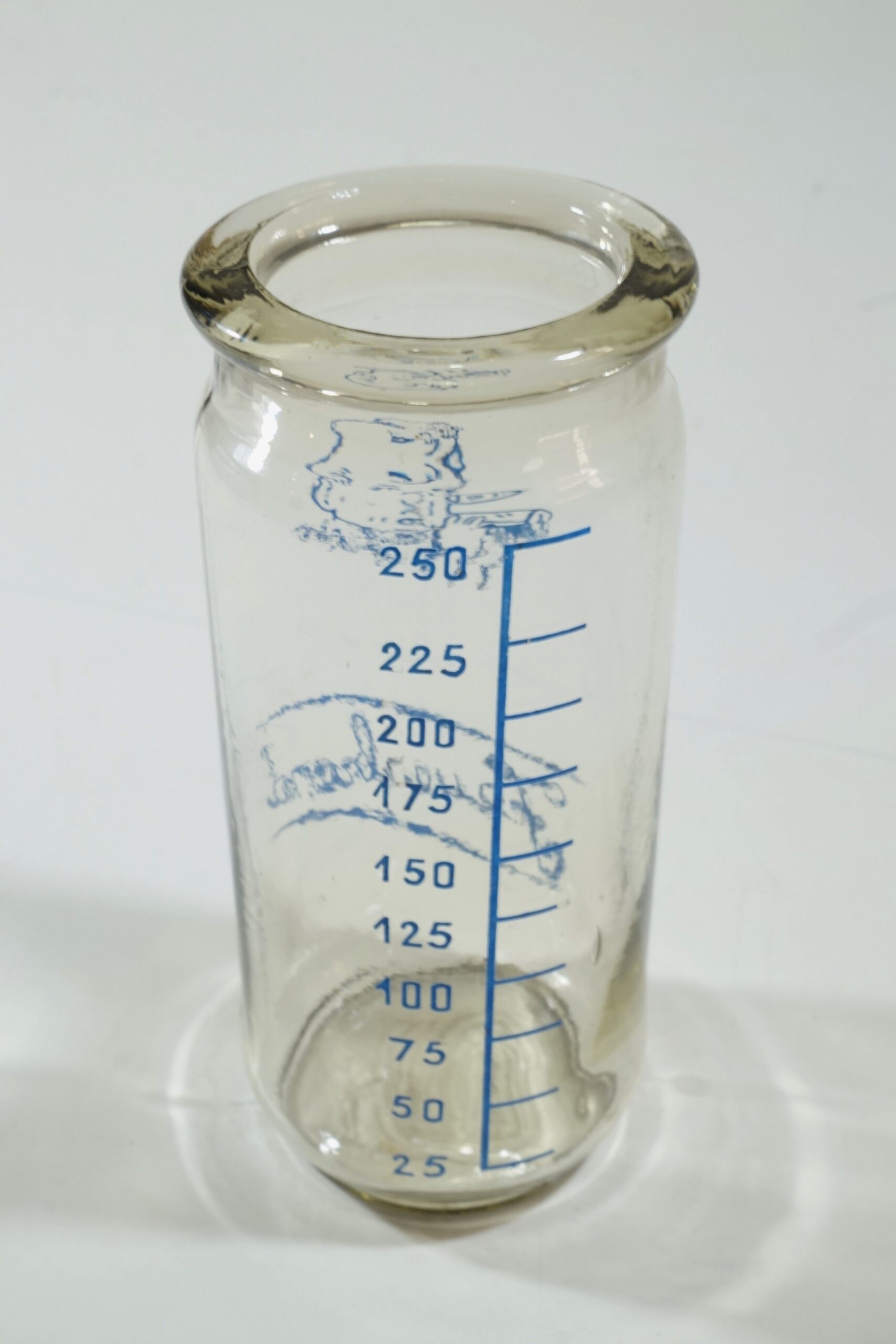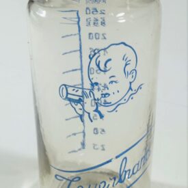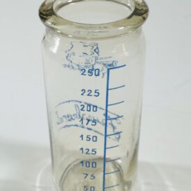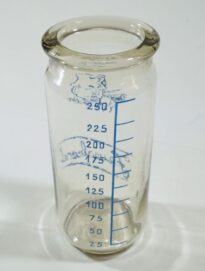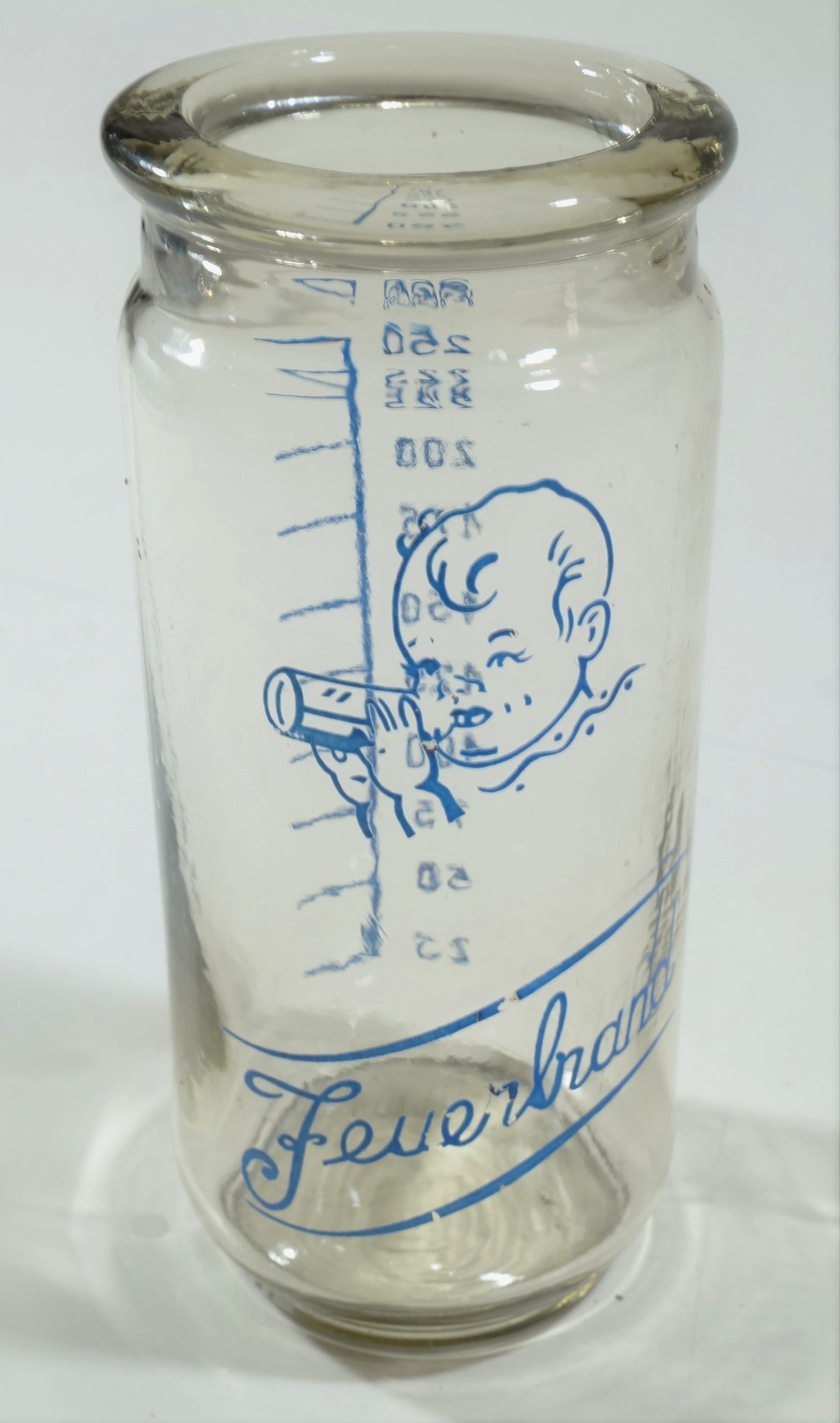Mamadeira de vidro com as marcas de medição em mililitros (ml) na cor azul, variando de 25 ml a 200 ml. Não possui encaixe para bico. Próxima ao topo, ilustração de um bebê segurando uma mamadeira e abaixo da ilustração a palavra "Feuerbrand".