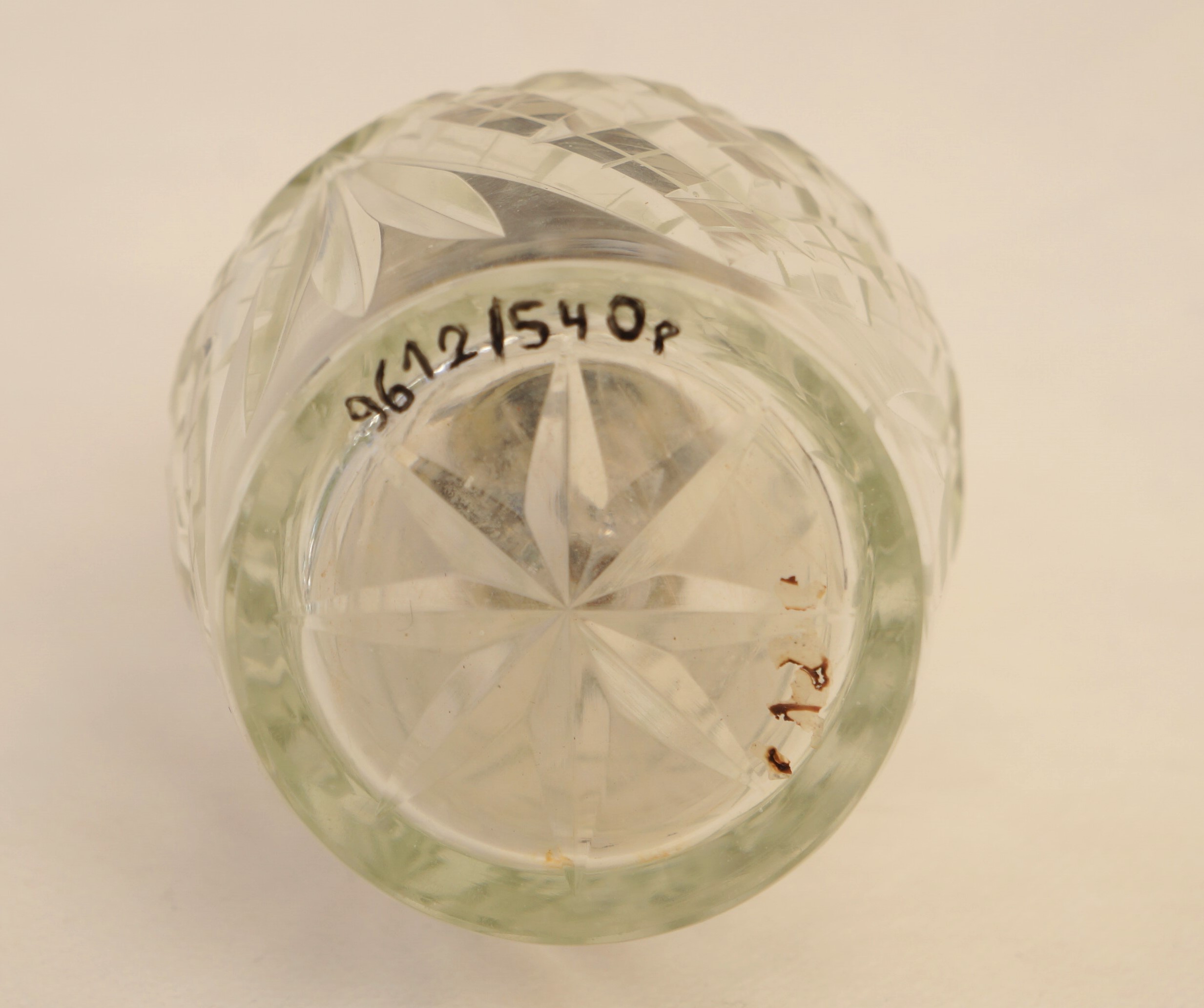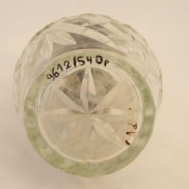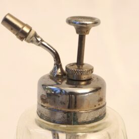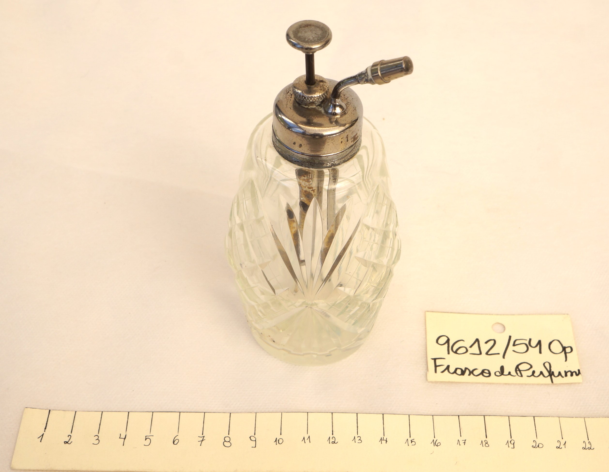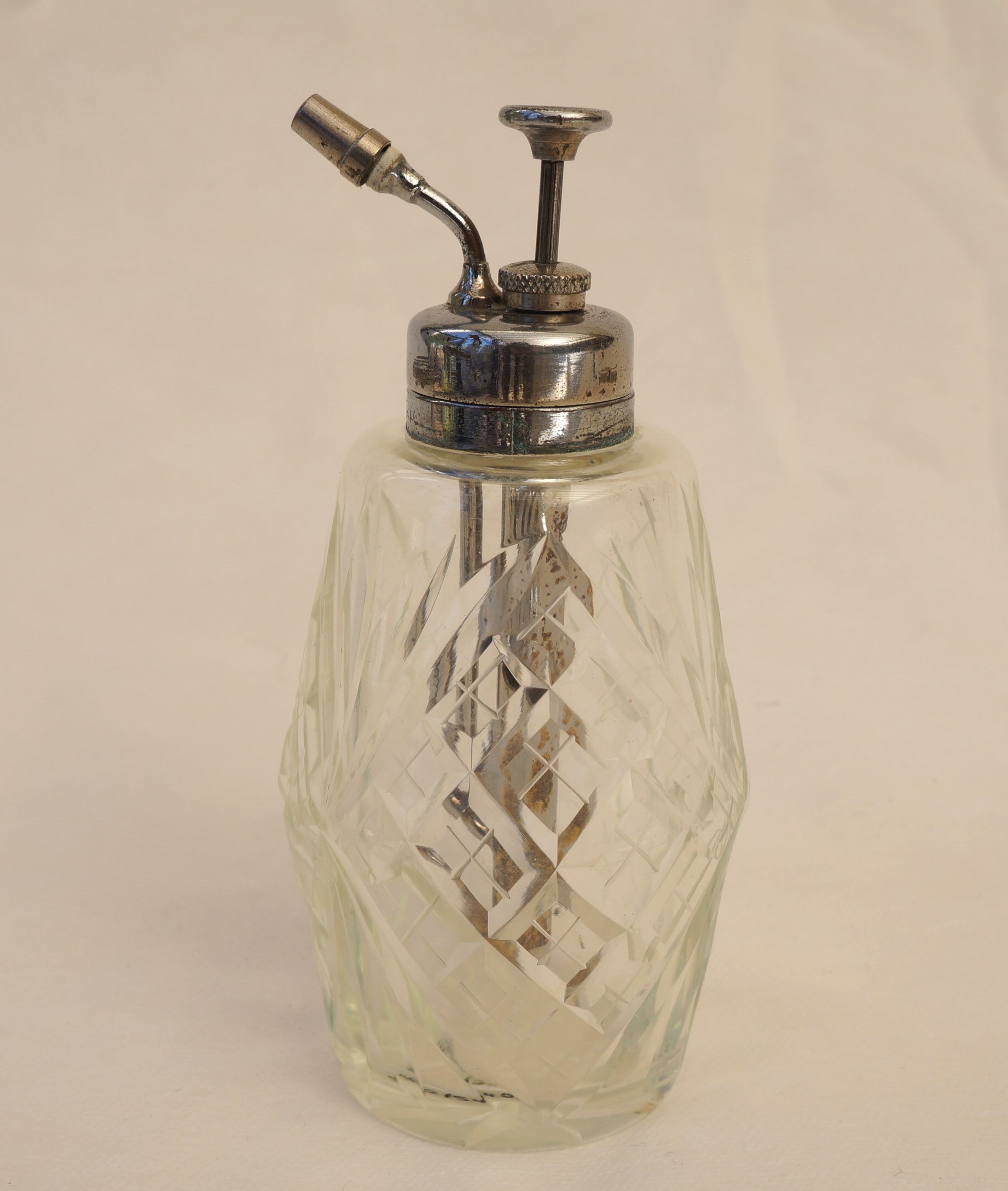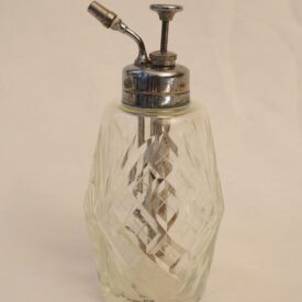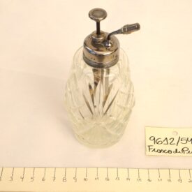 Frasco de perfume em cristal lapidado, de forma cilíndrica, com boca metálica rosqueável. A tampa, em metal prateado e formato circular, possui um cilindro interno que se encaixa no corpo do frasco, conectado a uma haste vertical que se projeta acima da tampa. No topo da haste, encontra-se uma pequena tampa rosqueável. Sobre a tampa principal, há uma válvula de pressão destinada à dispersão do conteúdo líquido em forma de vapor. O conjunto se fixa ao frasco por meio de rosca, compondo um sistema funcional de vaporização.