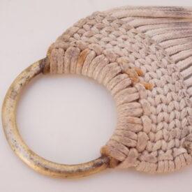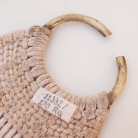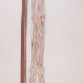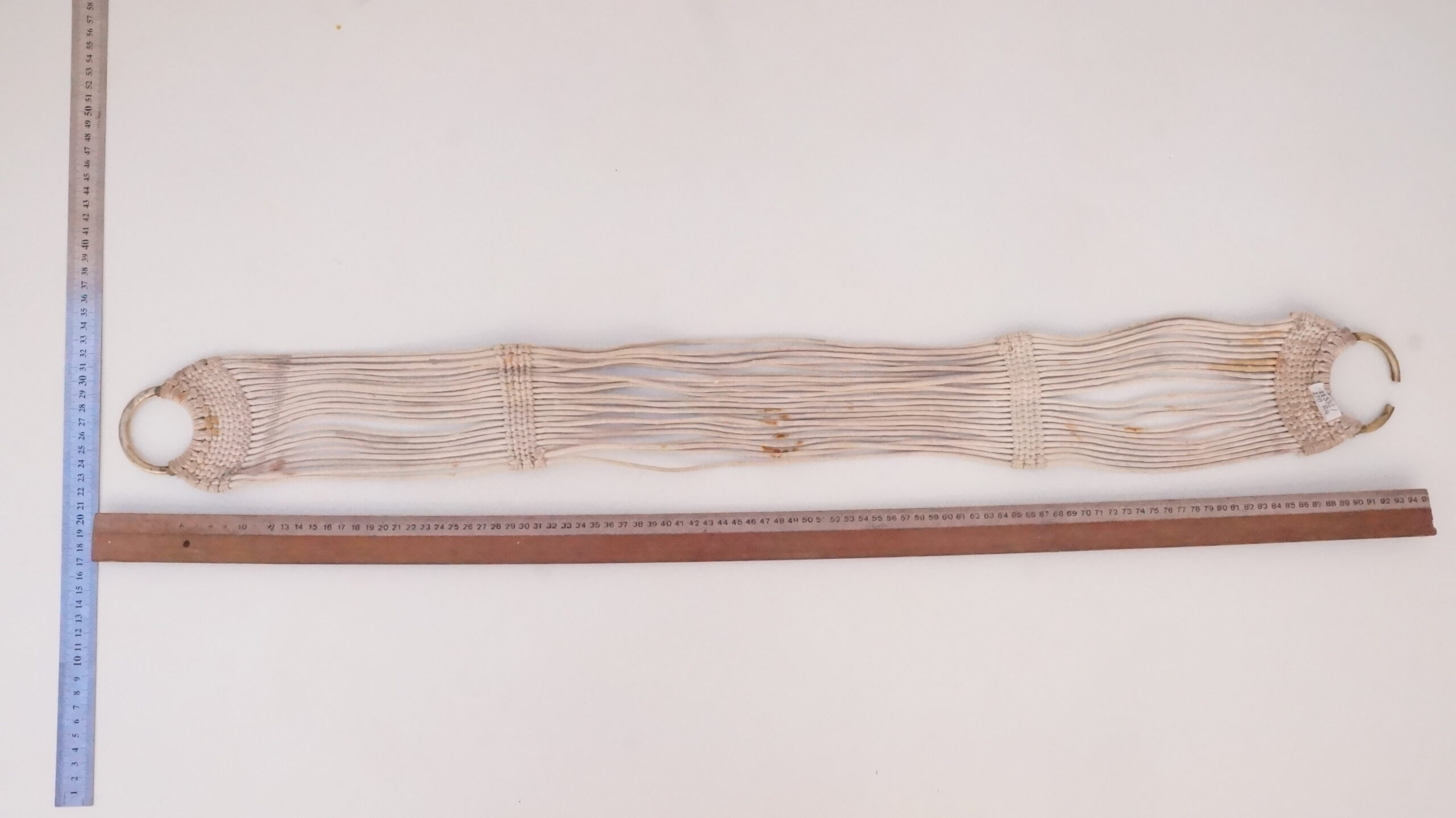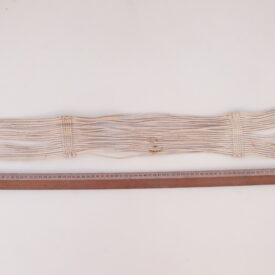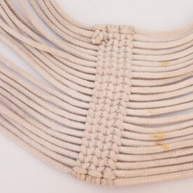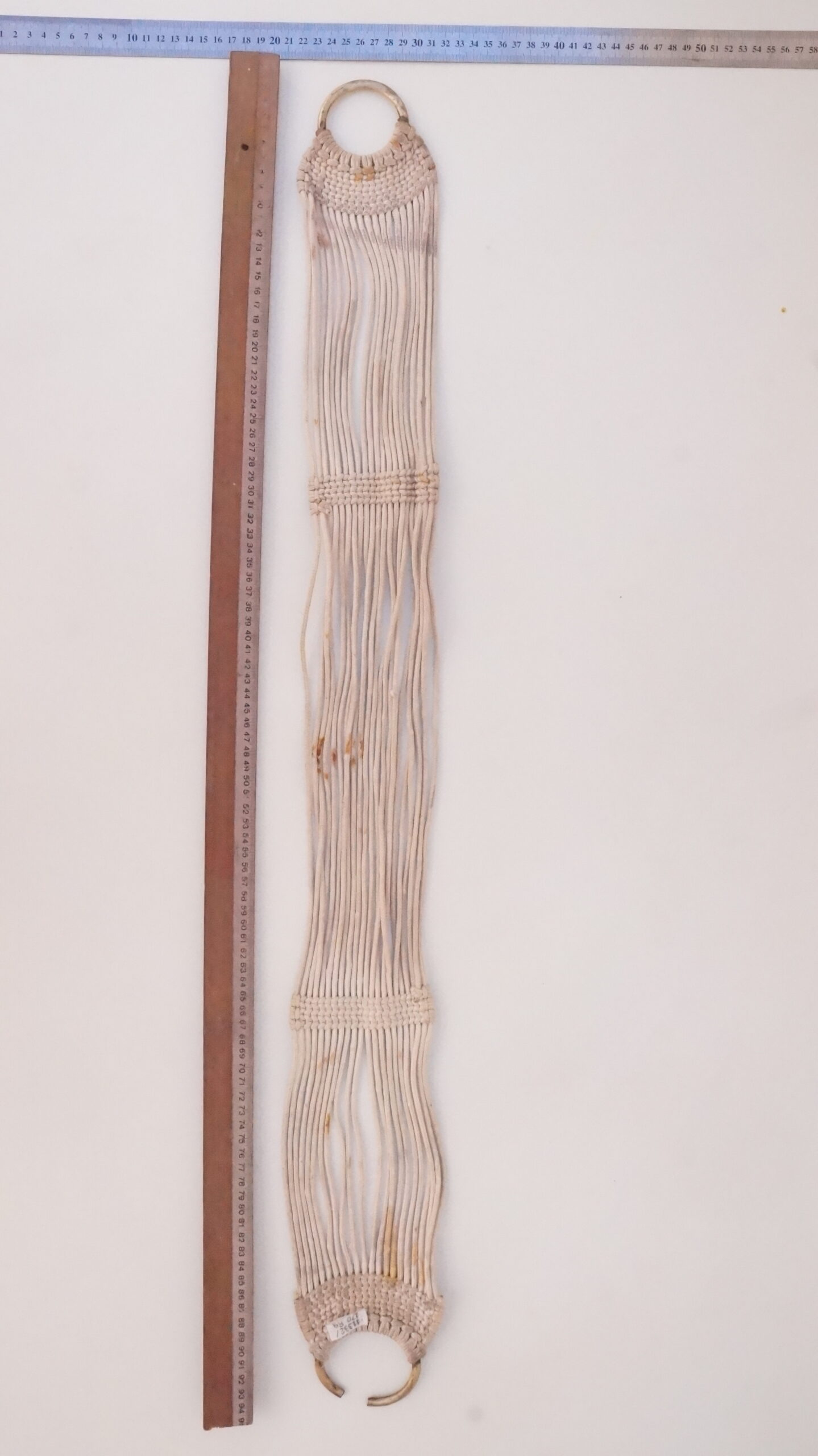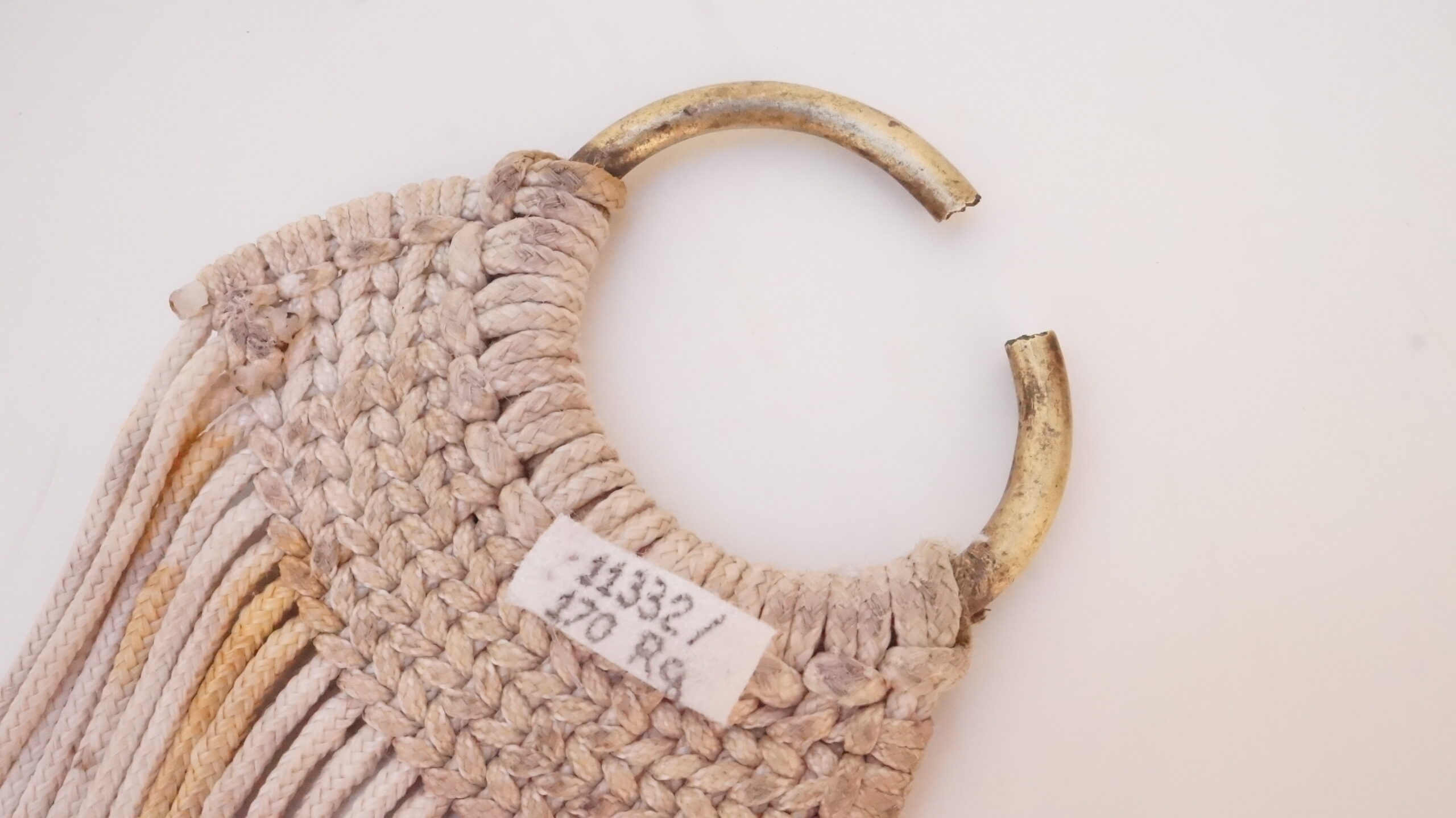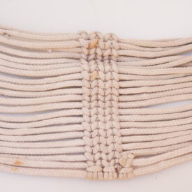 Barrigueira artesanal composta por dois elos de metal dourado e cordões de algodão branco. Os elos se encontram nas extremidades do objeto. Cada um é preso a uma trama firme, da qual saem 22 cordões de algodão. Na extensão da barrigueira, há duas faixas trançadas que garantem a resistência do material.