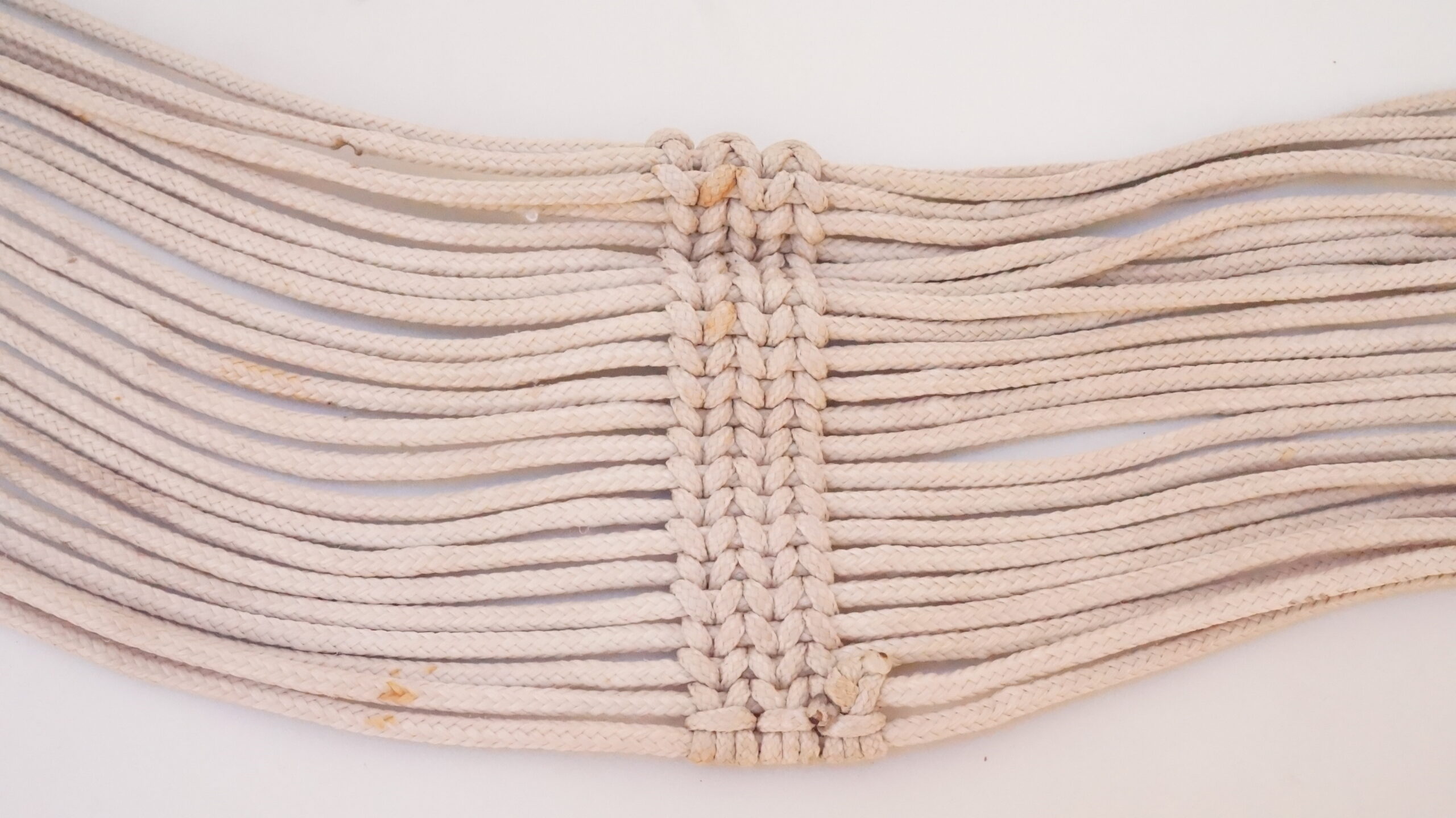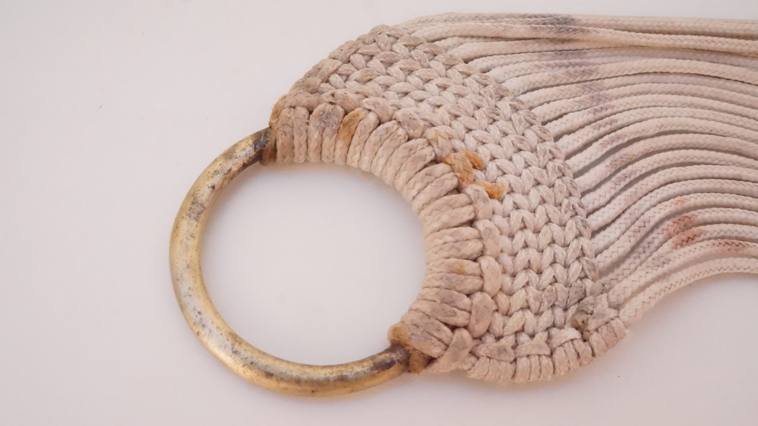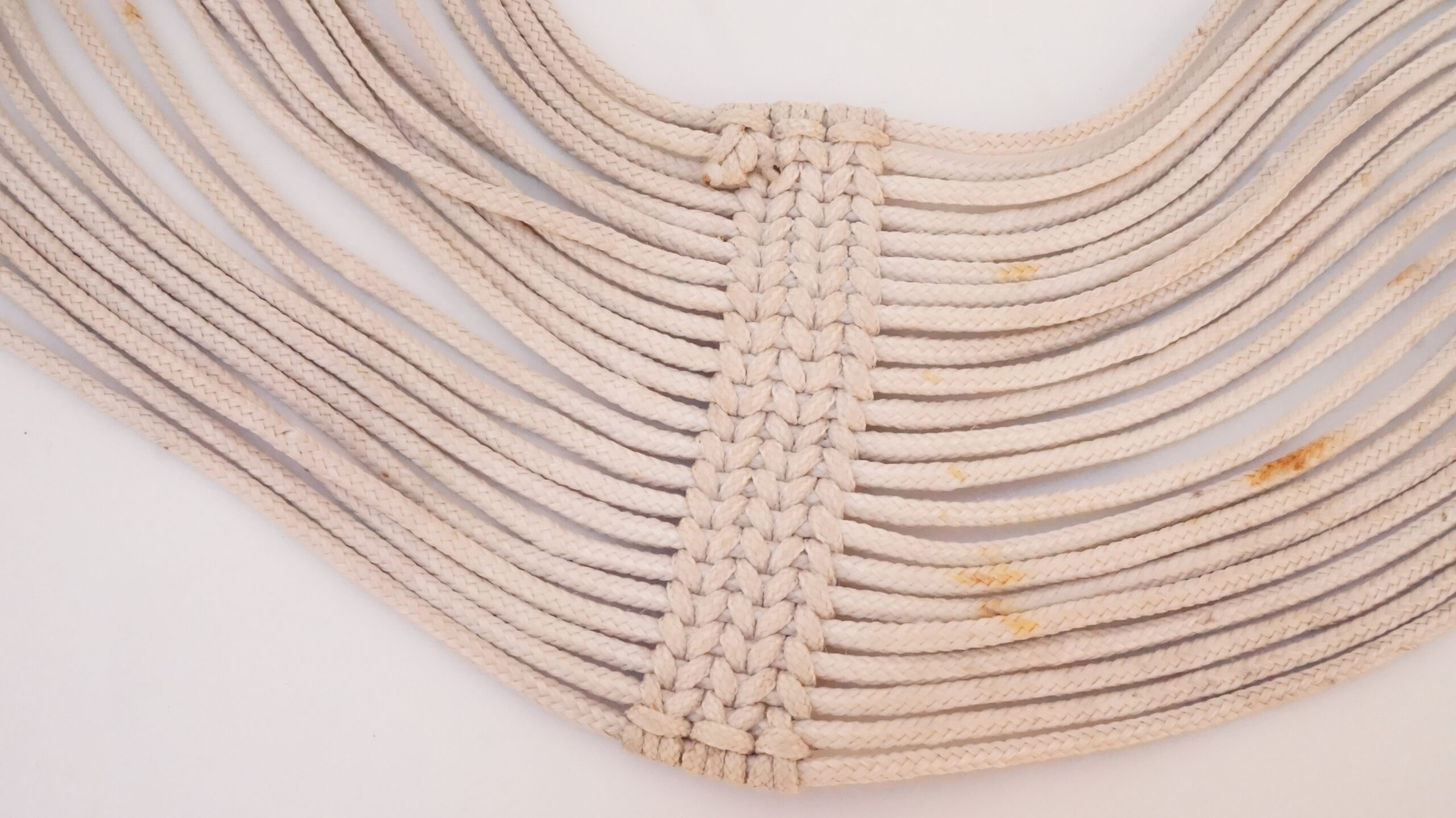 Cordões brancos estão com manchas de ferrugem e de sujidades. Metal dos elos tem tendência a escurecer. A trama está firme.
