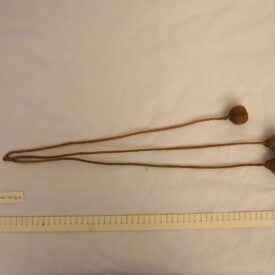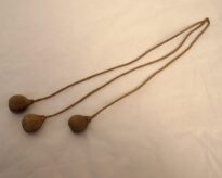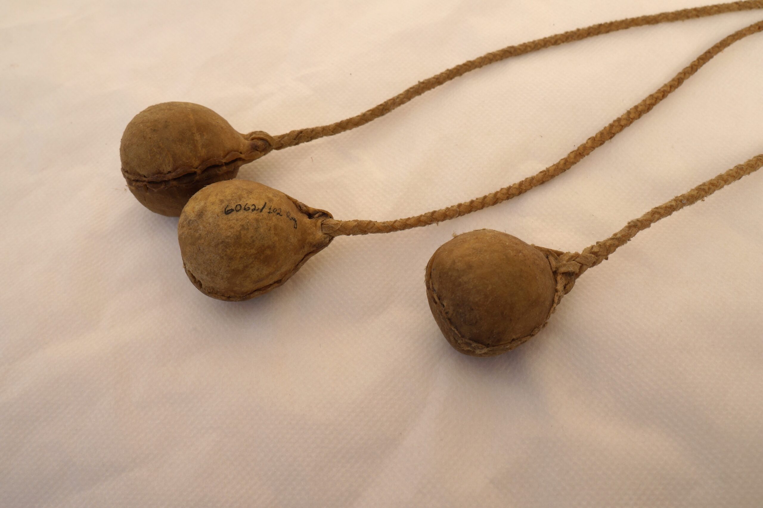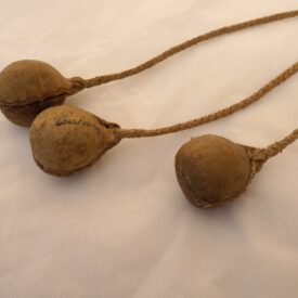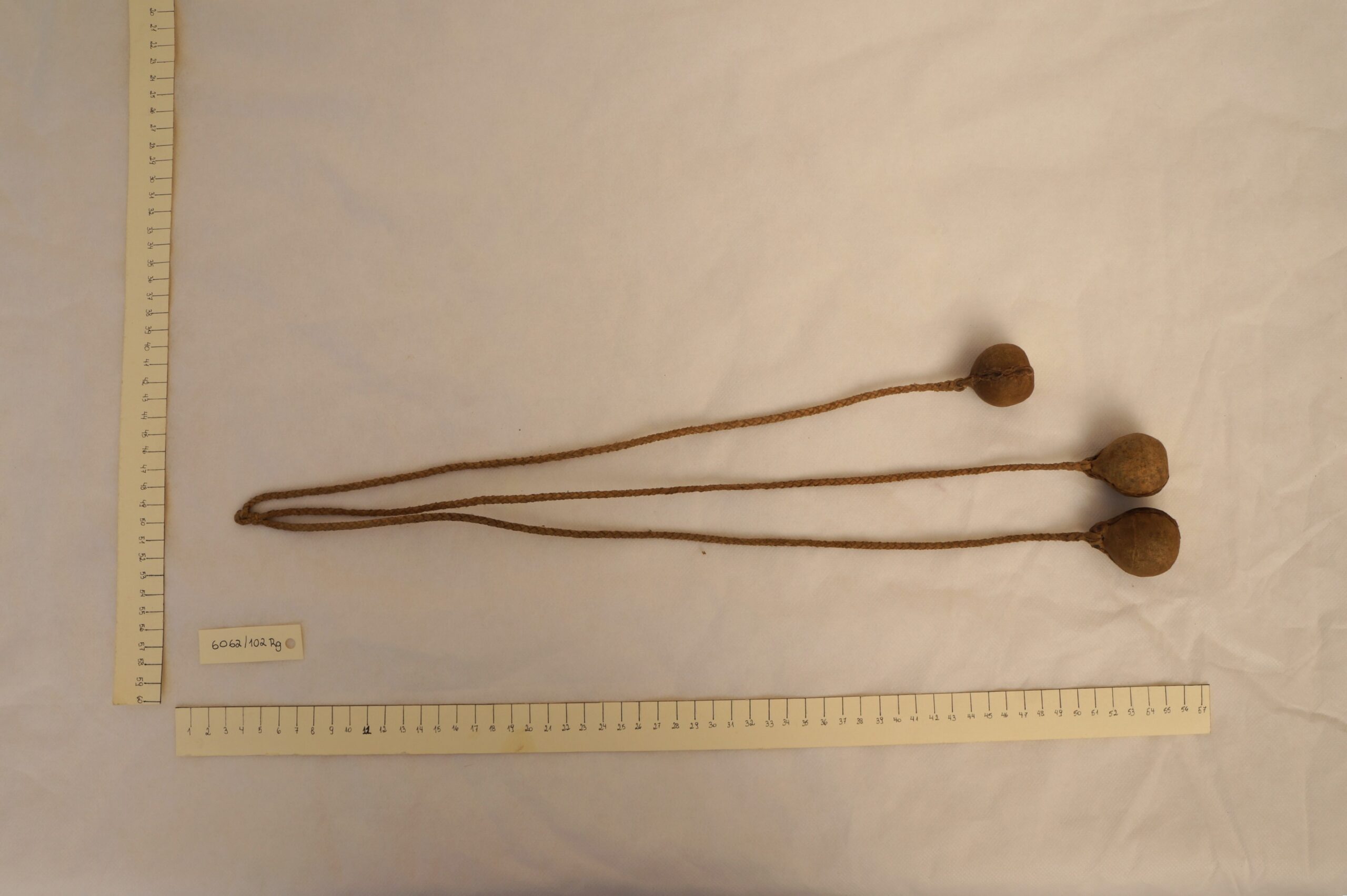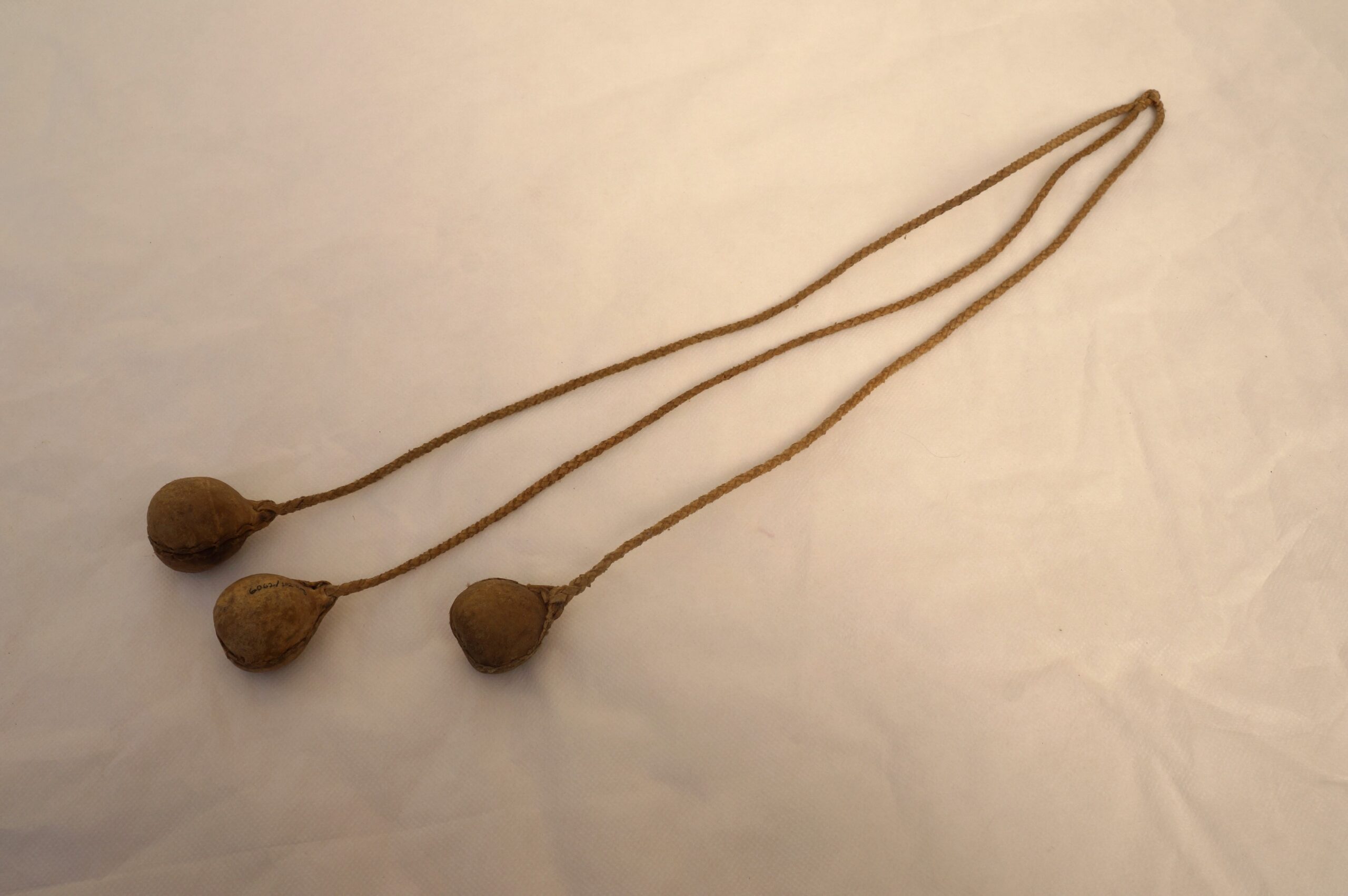 Arma de arremesso constituida de três esferas de madeira revestidas com couro. As esferas, uma em tamanho menor, são presas à extremidade de cordas trançadas de couro, unidas por um anel de tento também trançado.