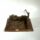 Três gaúchos, o da esquerda e o do centro calçam alpargatas, o da direita calça botas e veste paletó, os três usam chapéu. Espeto com carne no fogo de chão, o do centro segura uma chaleira e o da esquerda segura a cuia do chimarrão.