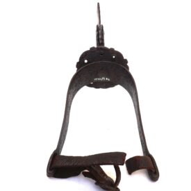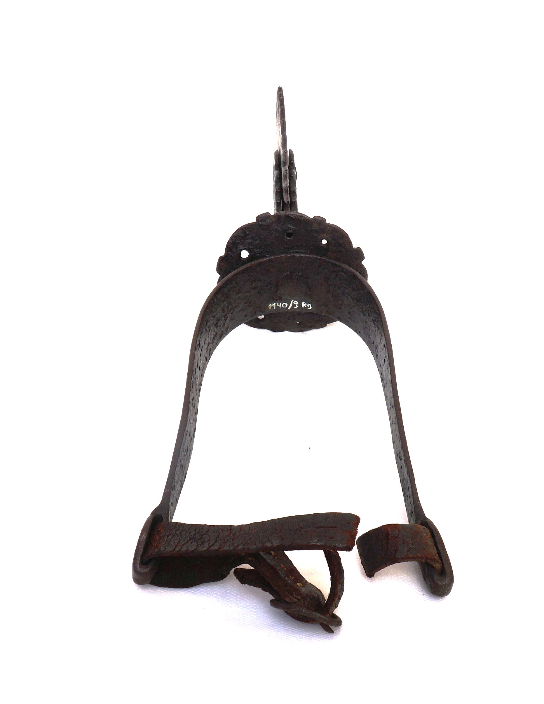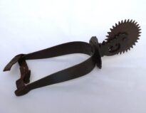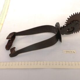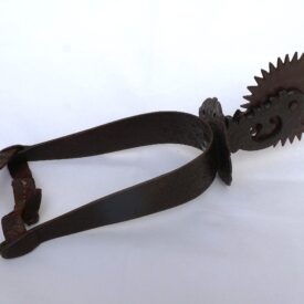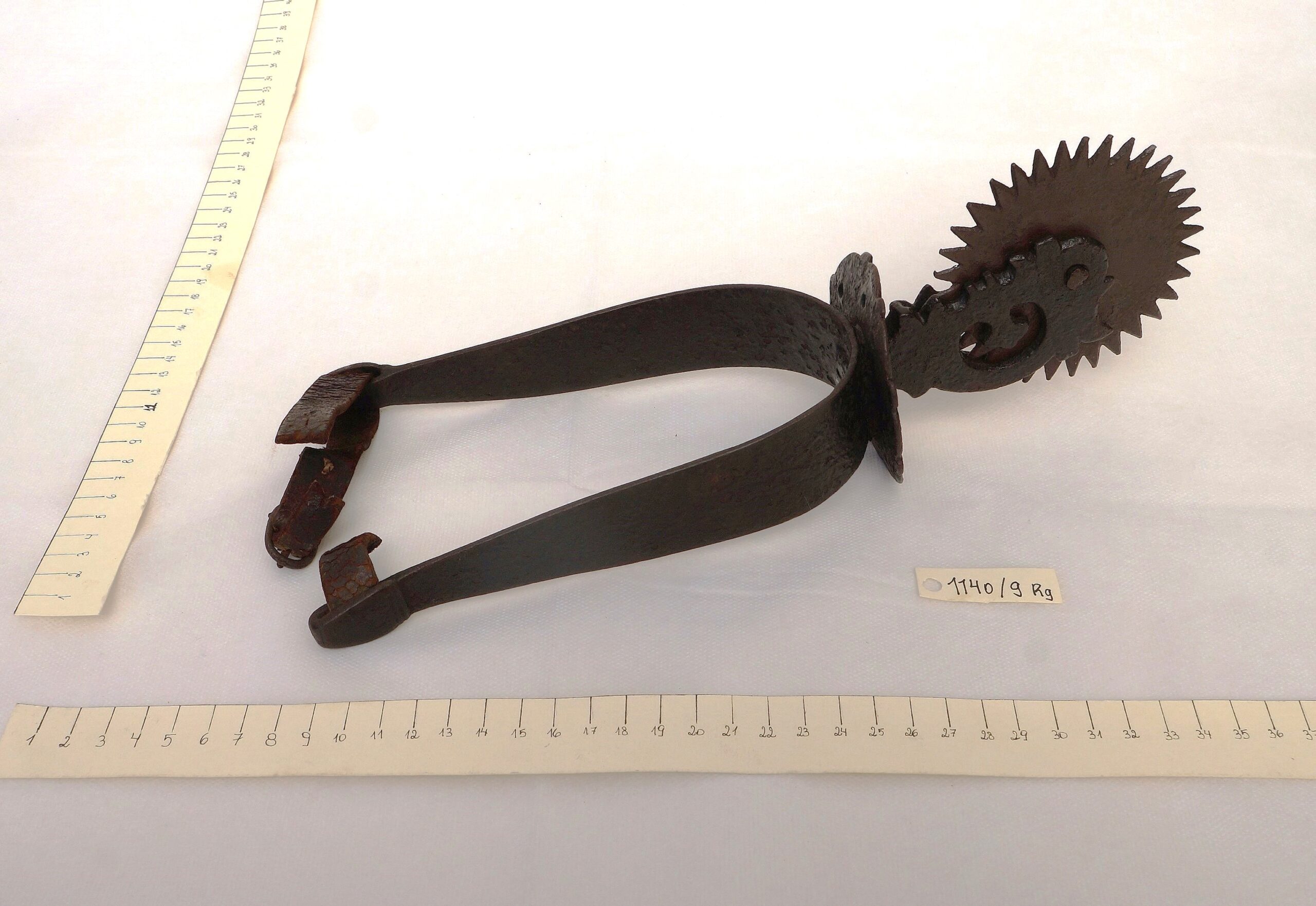 Espora com grande roseta lisa, papagaio e rodete trabalhados. Aro comprido, largo e liso. Instrumento metálico formado por arco adaptado ao salto da bota ou sapato, do qual se projeta haste terminada em roseta ponteada móvel ou ponta aguda, utilizada para estimular o movimento do cavalo.