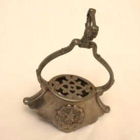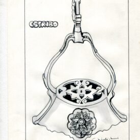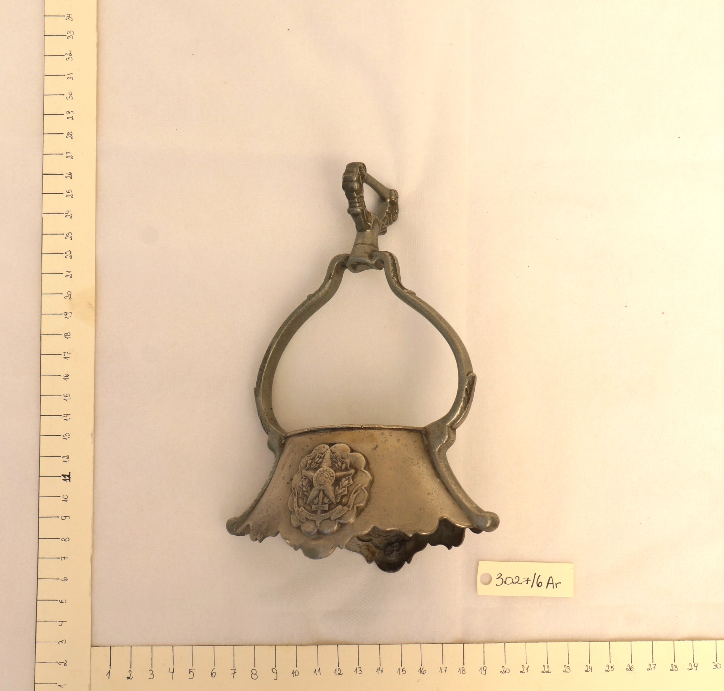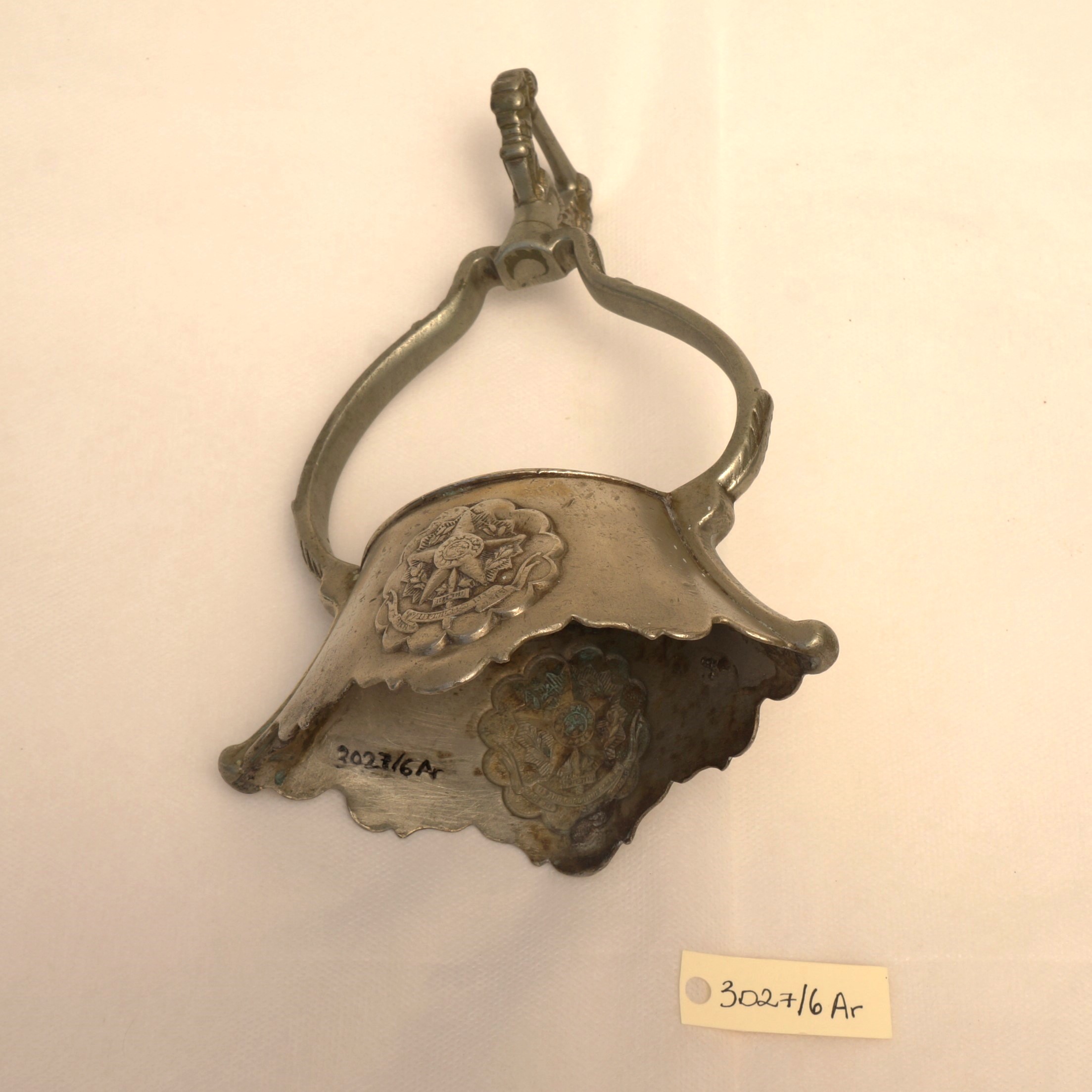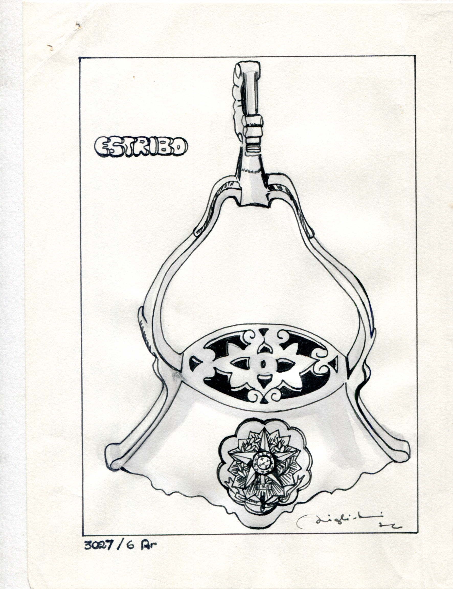 Estribo "de coroa", com as Armas Nacionais em ambos os lados. A base apresenta motivo vazado. As hastes são curvas e unidas na parte superior, de onde se projeta um semicírculo destinado à fixação do estribo ao loro.