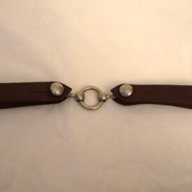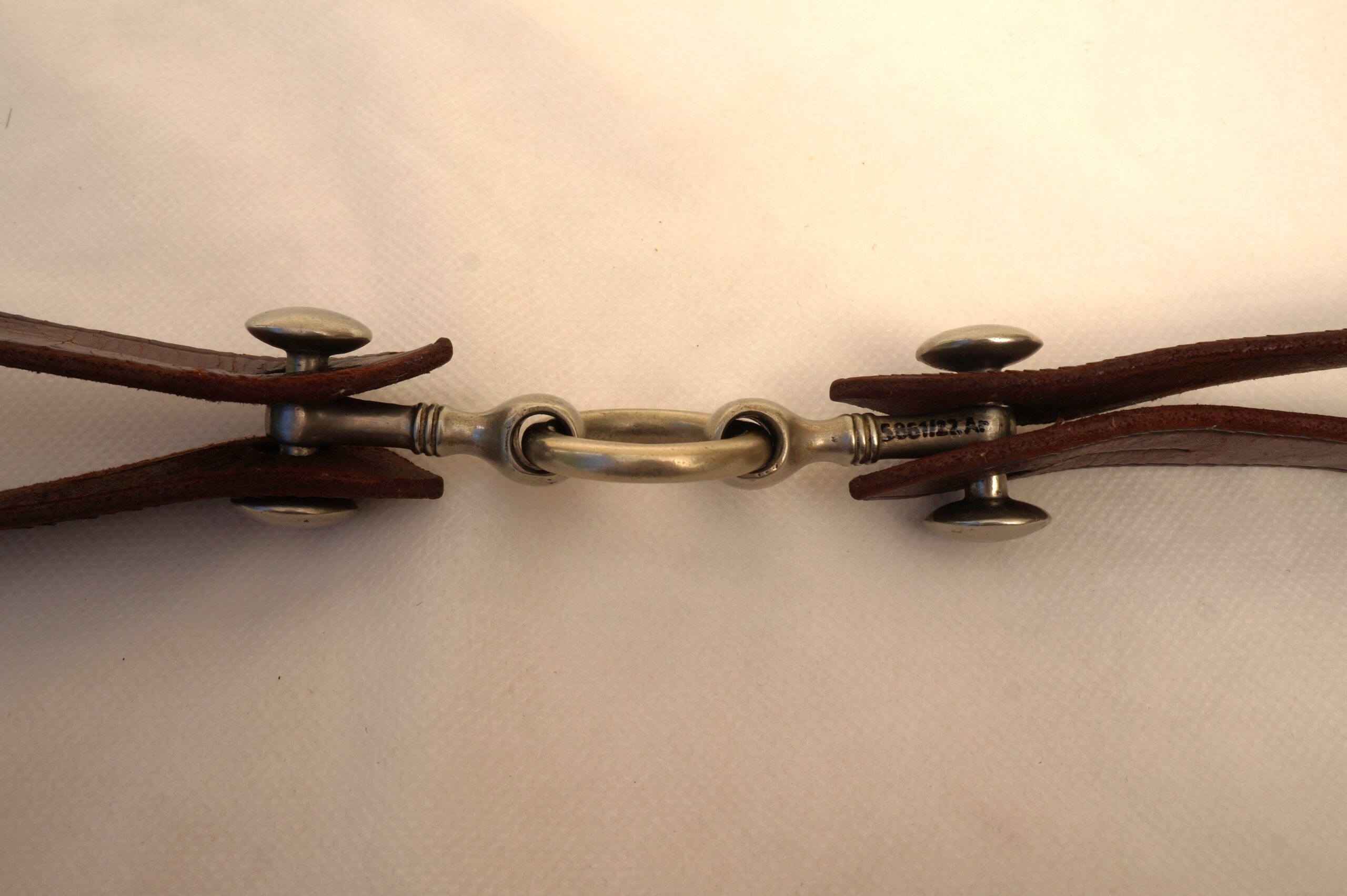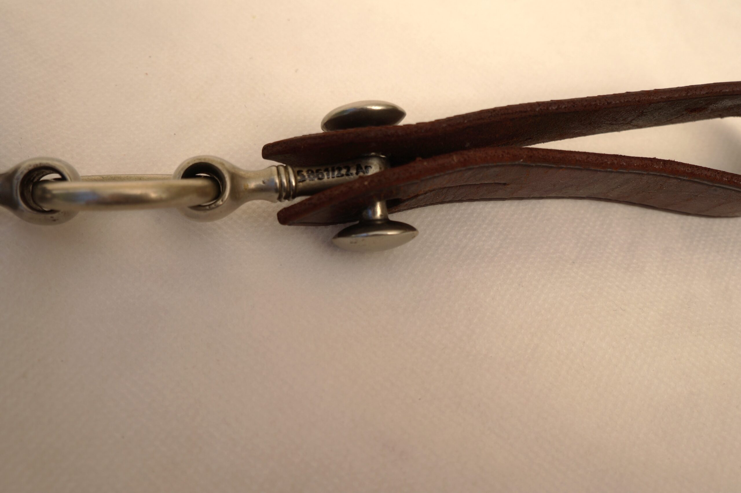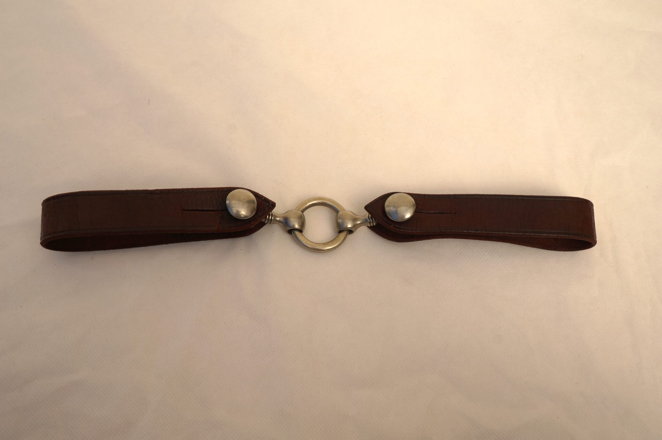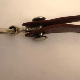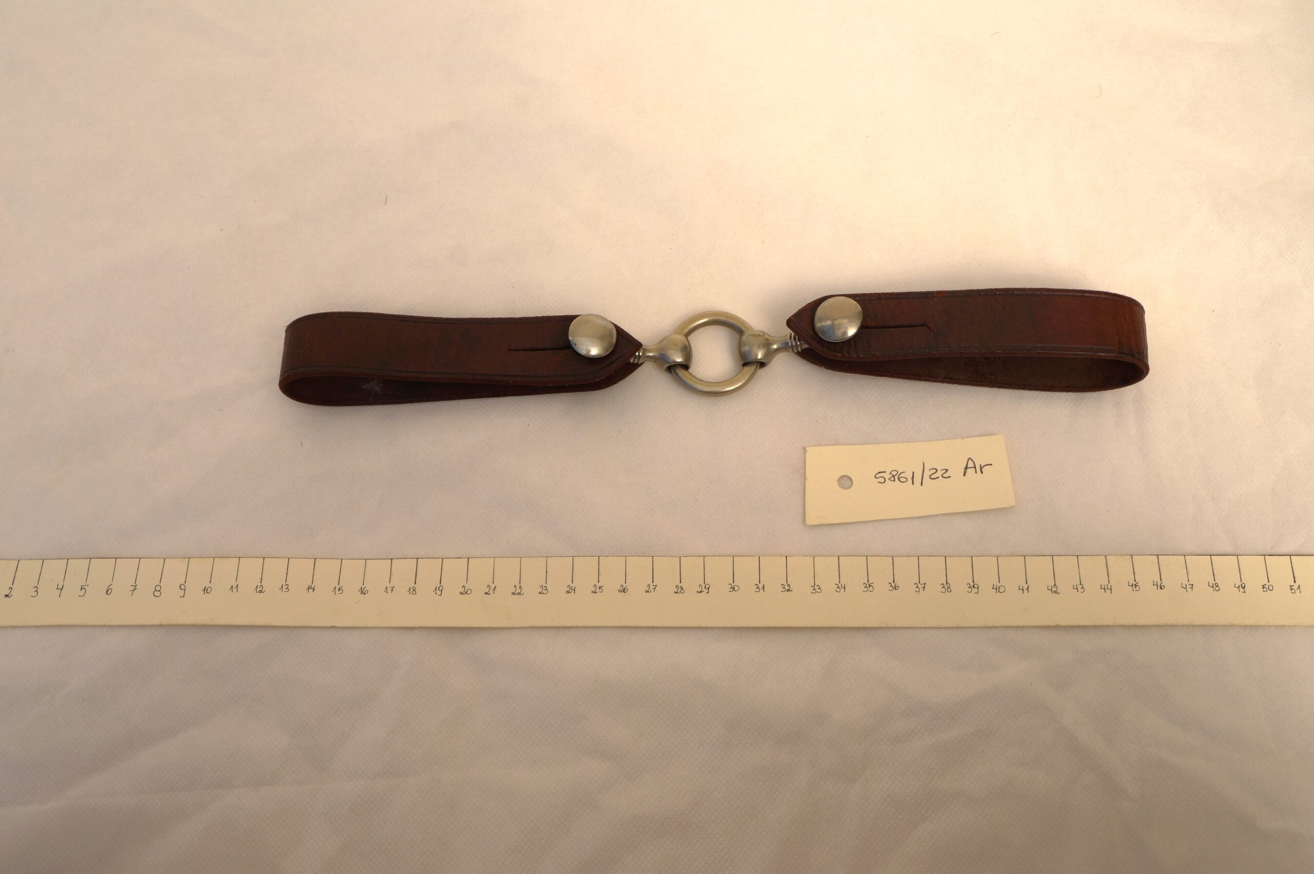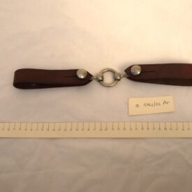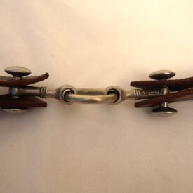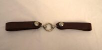 Duas tiras de couro curtido marrom, com um furo em cada extremidade que se encaixa a dois pinos travadores em formato T unidos por uma argola de prata utilizada como trava central.
