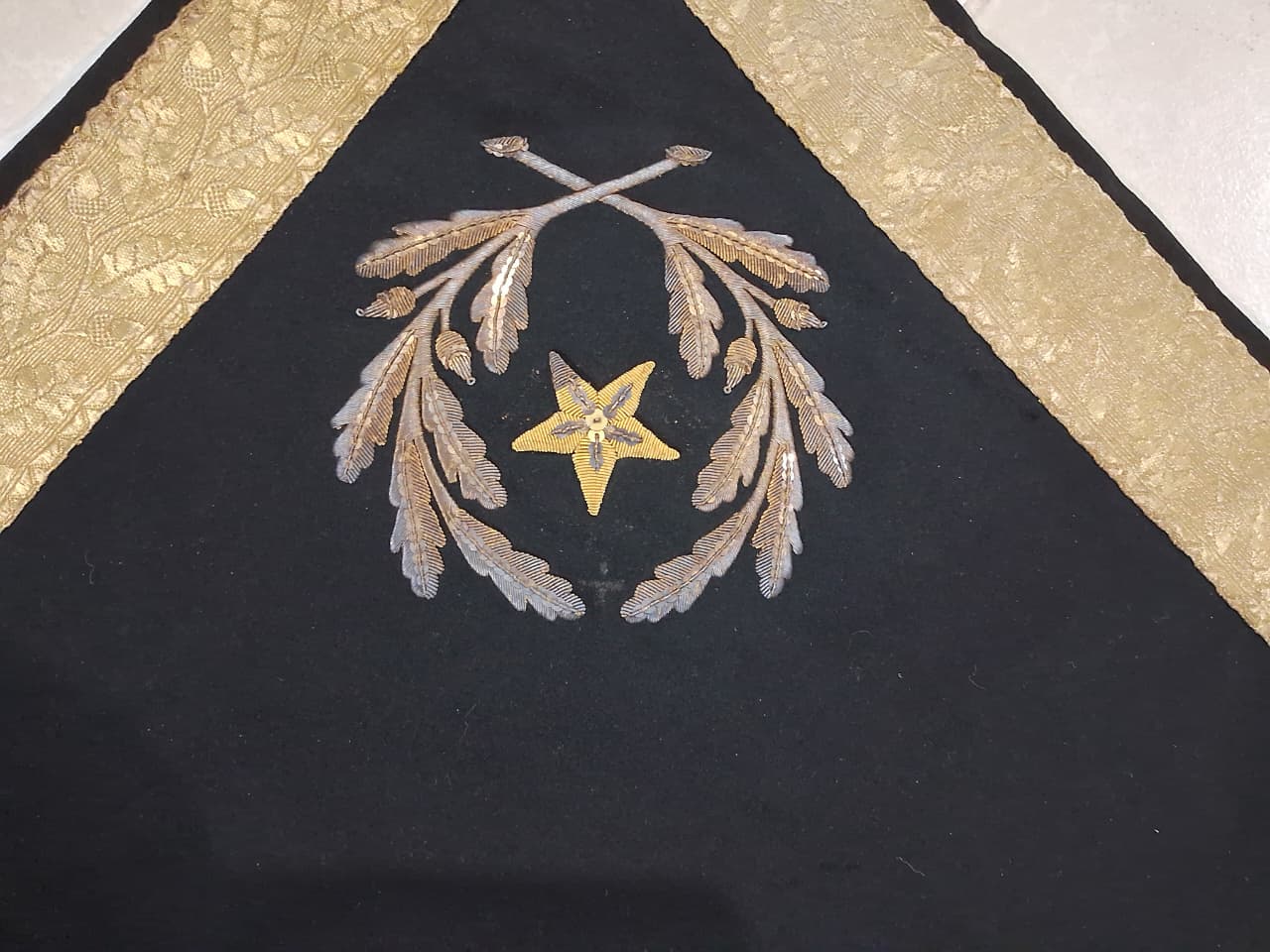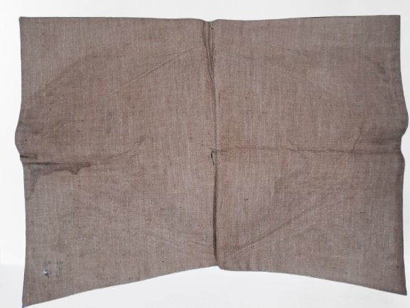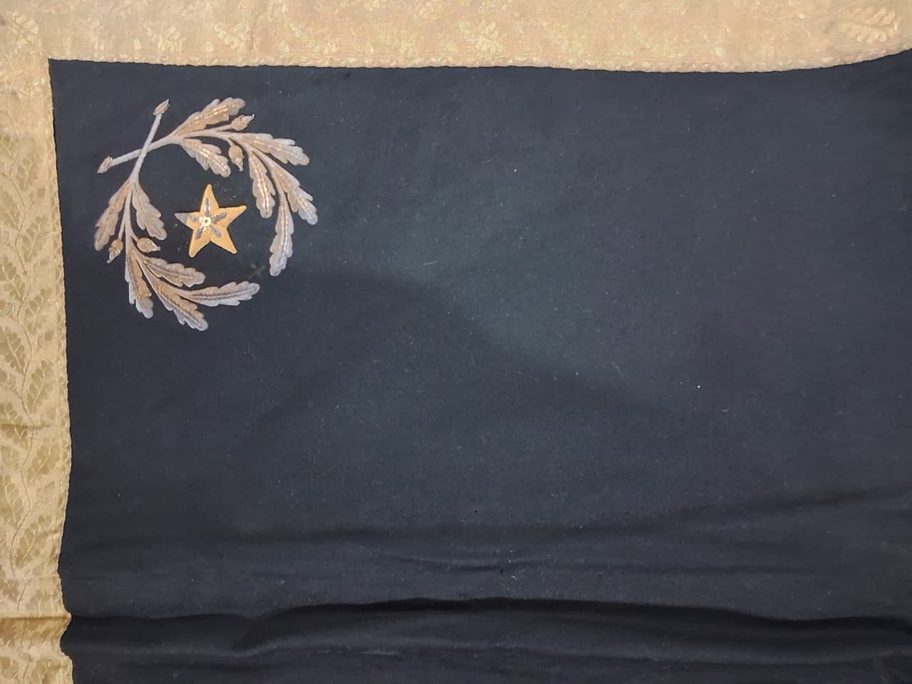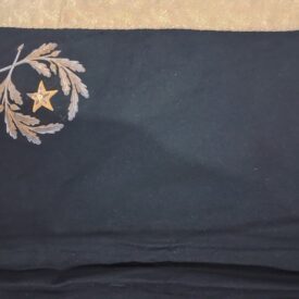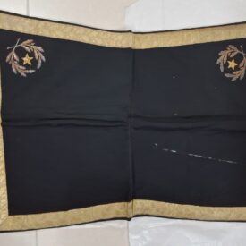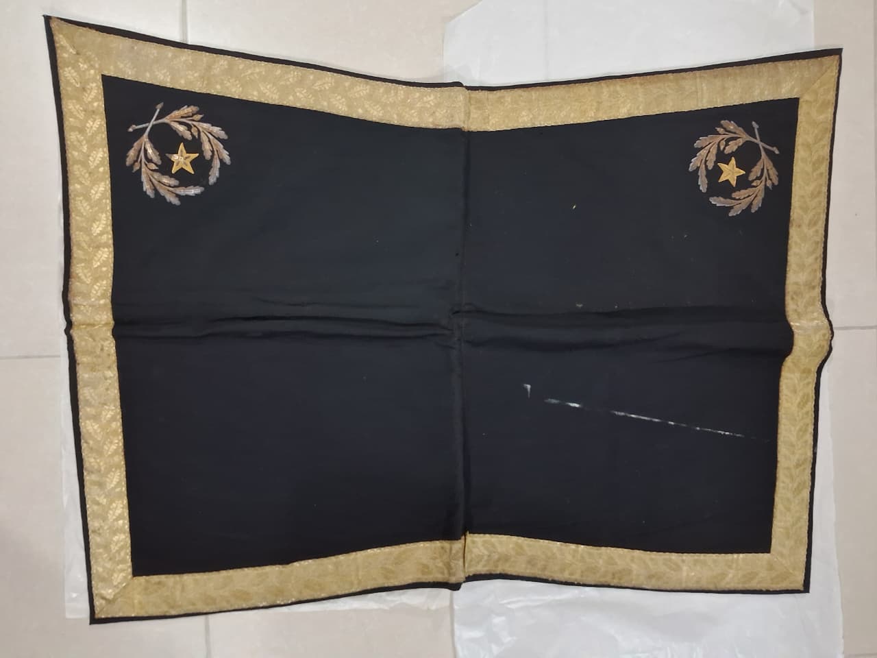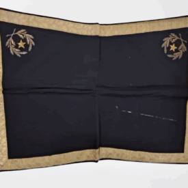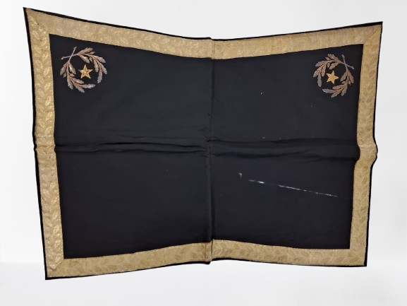 Manta quadrilátera em tecido de lã preta costurada ao meio; contornada por uma grega dourada com ramos de carvalho alinhados; forrada com tecido de linho amarelado com uma costura preta dupla e rachaduras na dobra. Possui, nos cantos trazeiros, um distintivo de oficial-general, composto por dois ramos de carvalhos com frutos cercando uma estrela bordados com fios e lantejoulas dourados. A costura que prende a grega está se soltando. O tecido possui uma mancha de tinta branca.