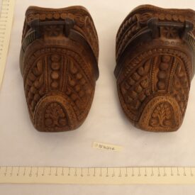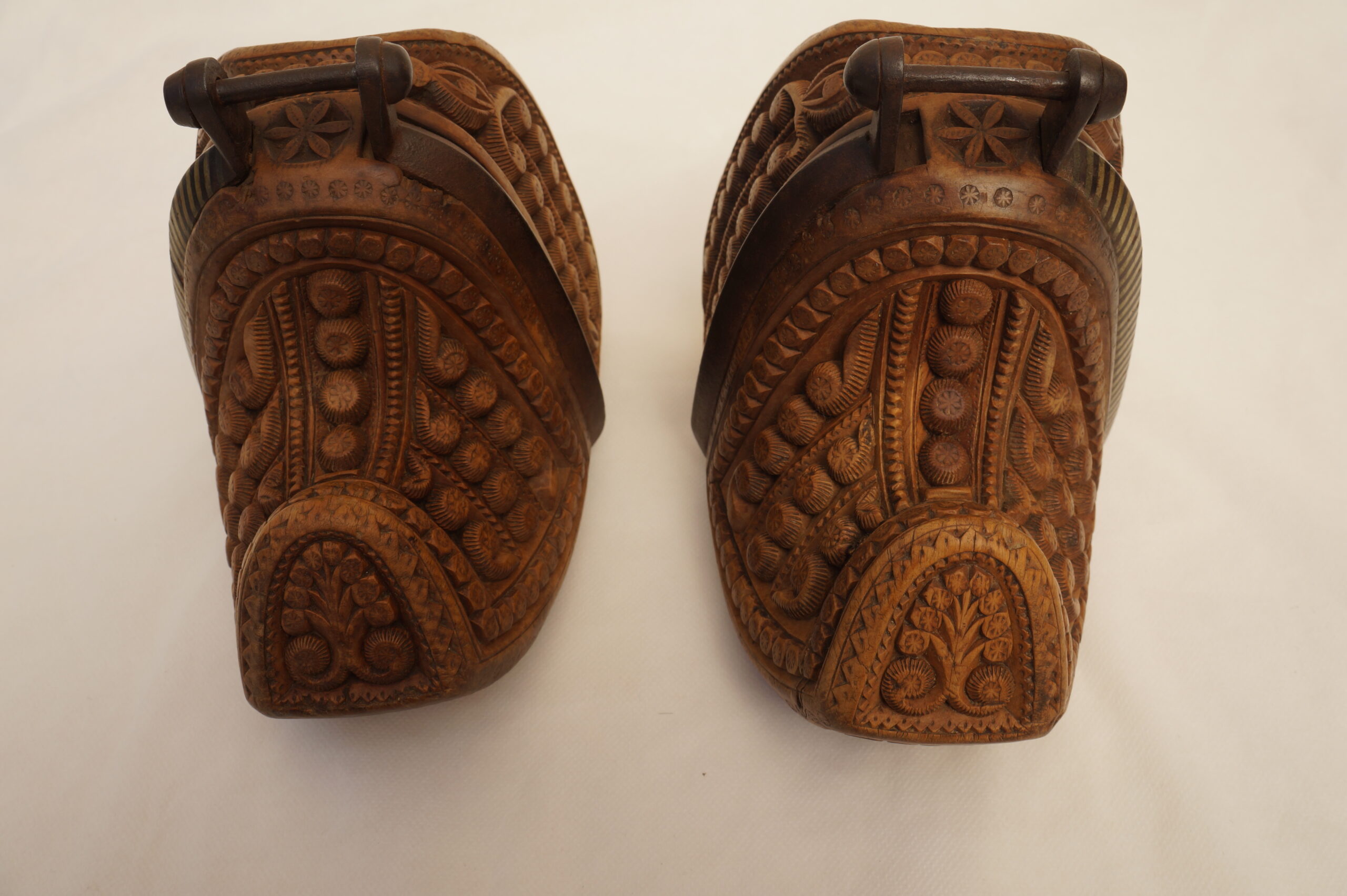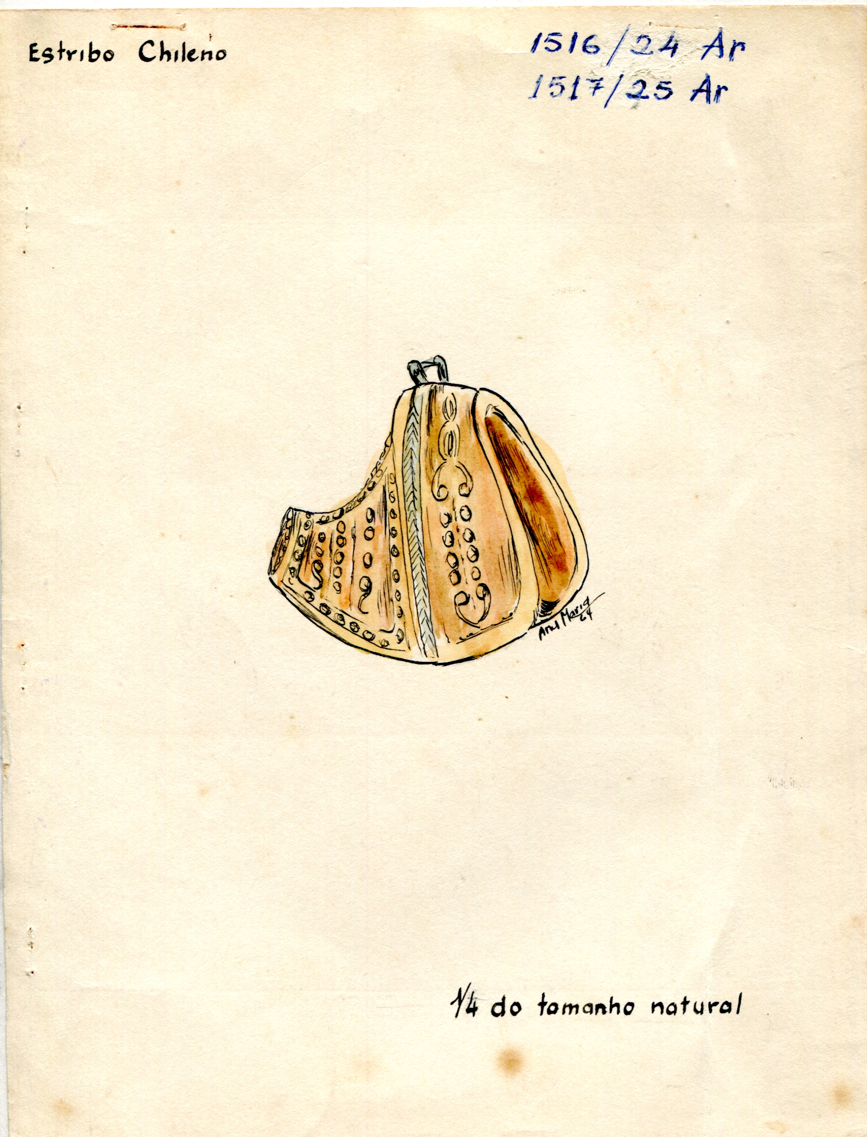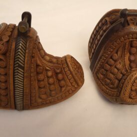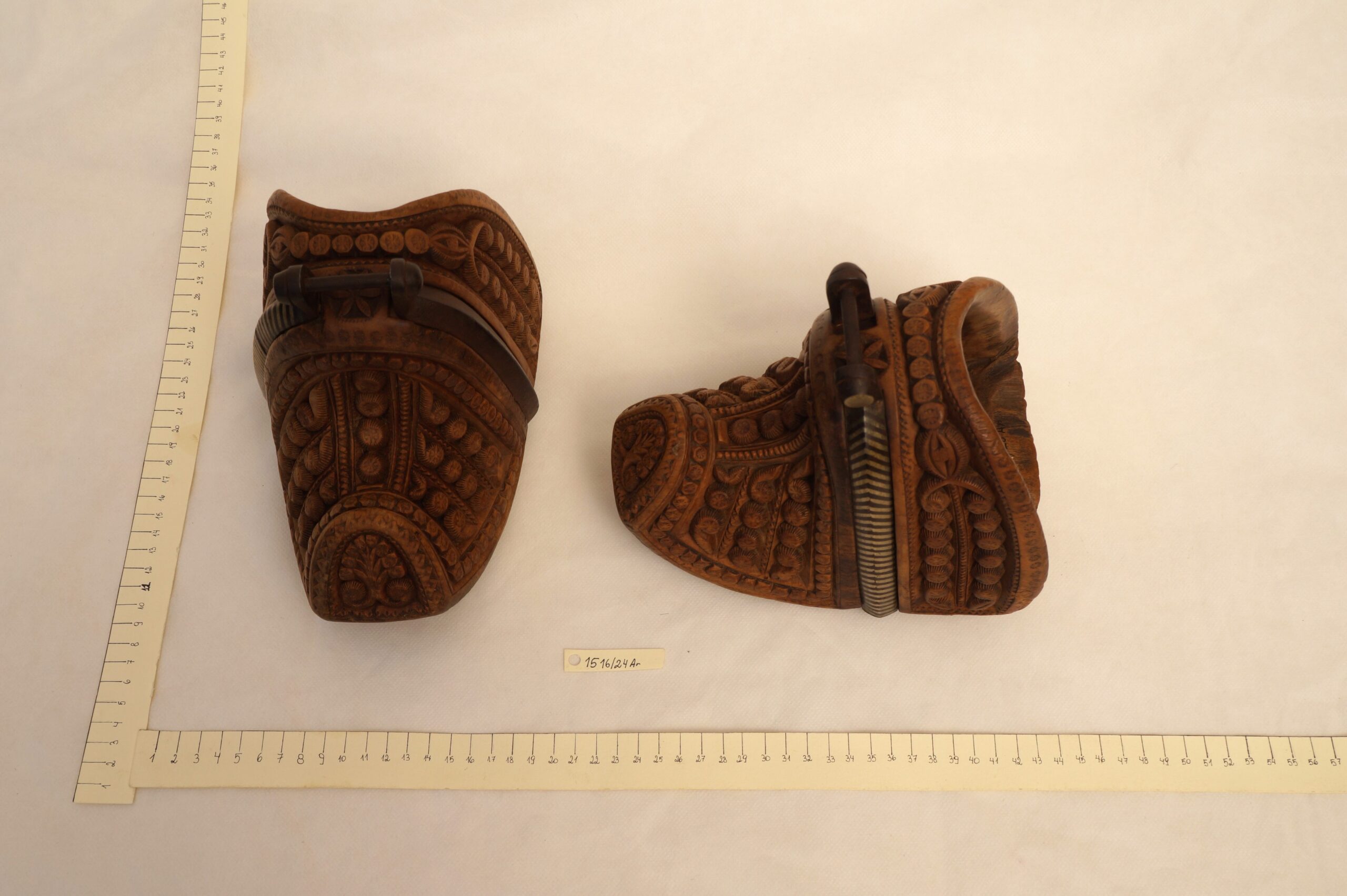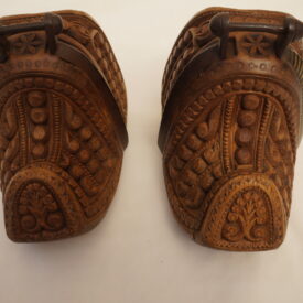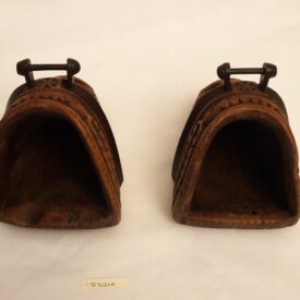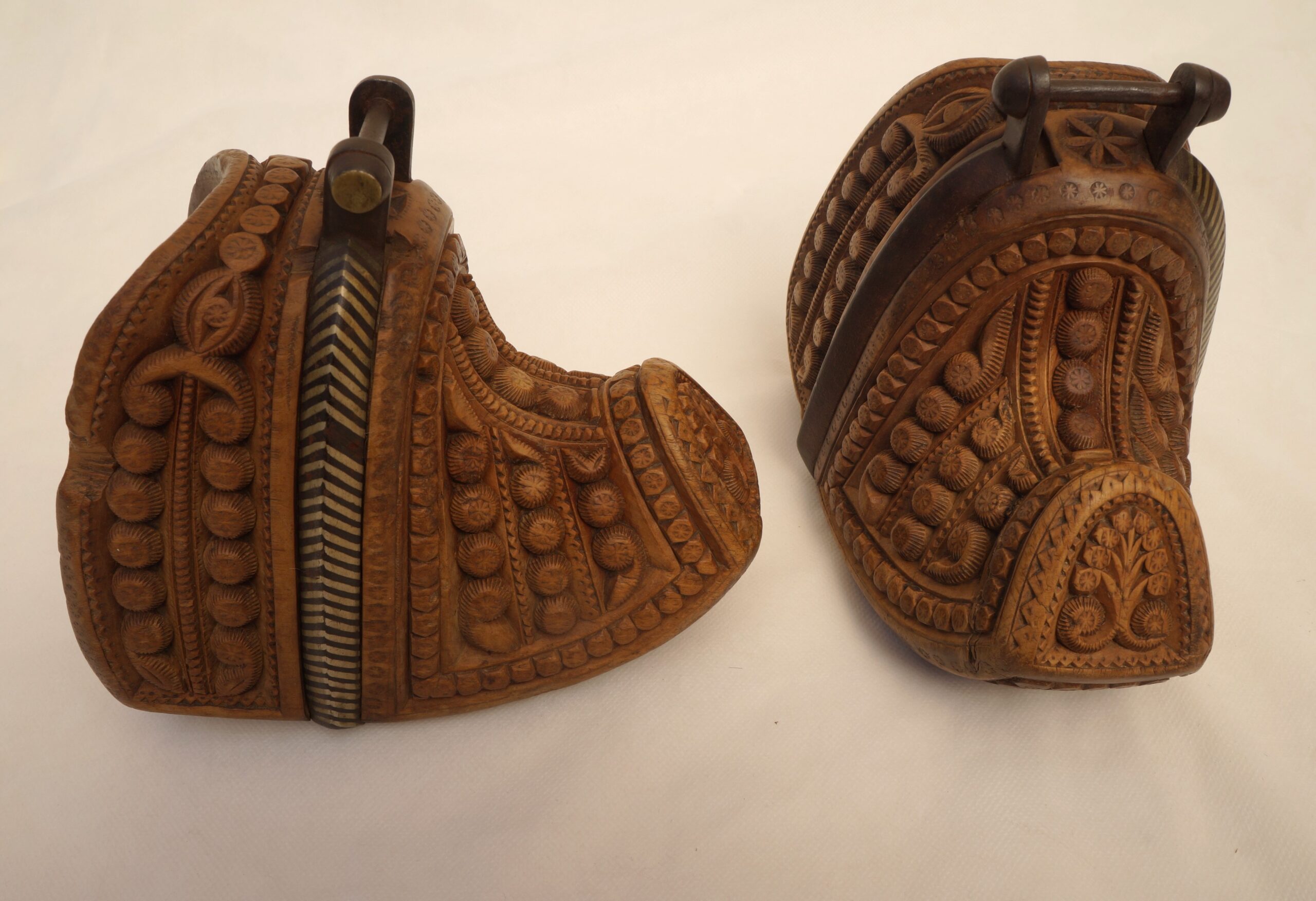 Par de estribos simétricos, superfície entalhada em toda a extensão, alça superior para fixação, base plana para apoio do pé. Peça de madeira maciça, entalhada manualmente com detalhes ornamentais que incluem padrões geométricos e motivos florais. De cor marrom-escuro e acabamento envernizado, possui formato tradicional com base plana para apoio do pé e alça superior para fixação à sela.