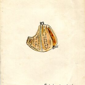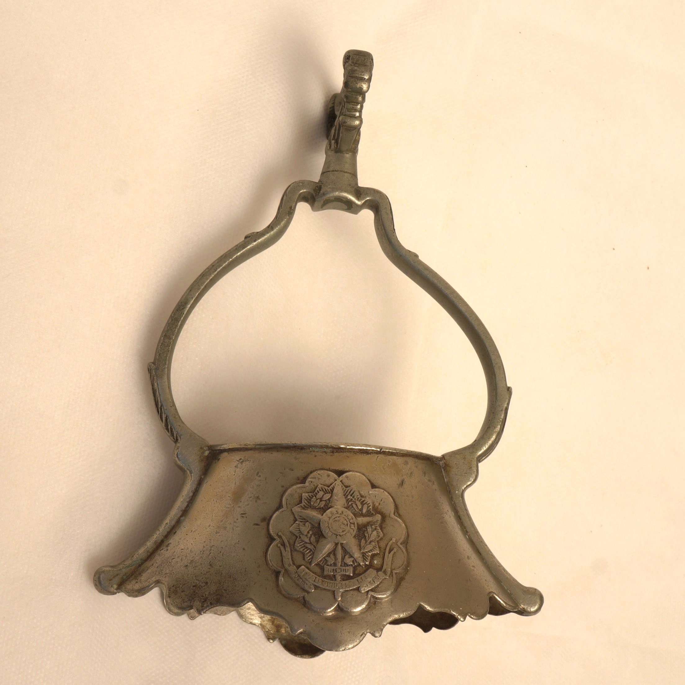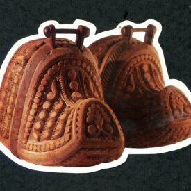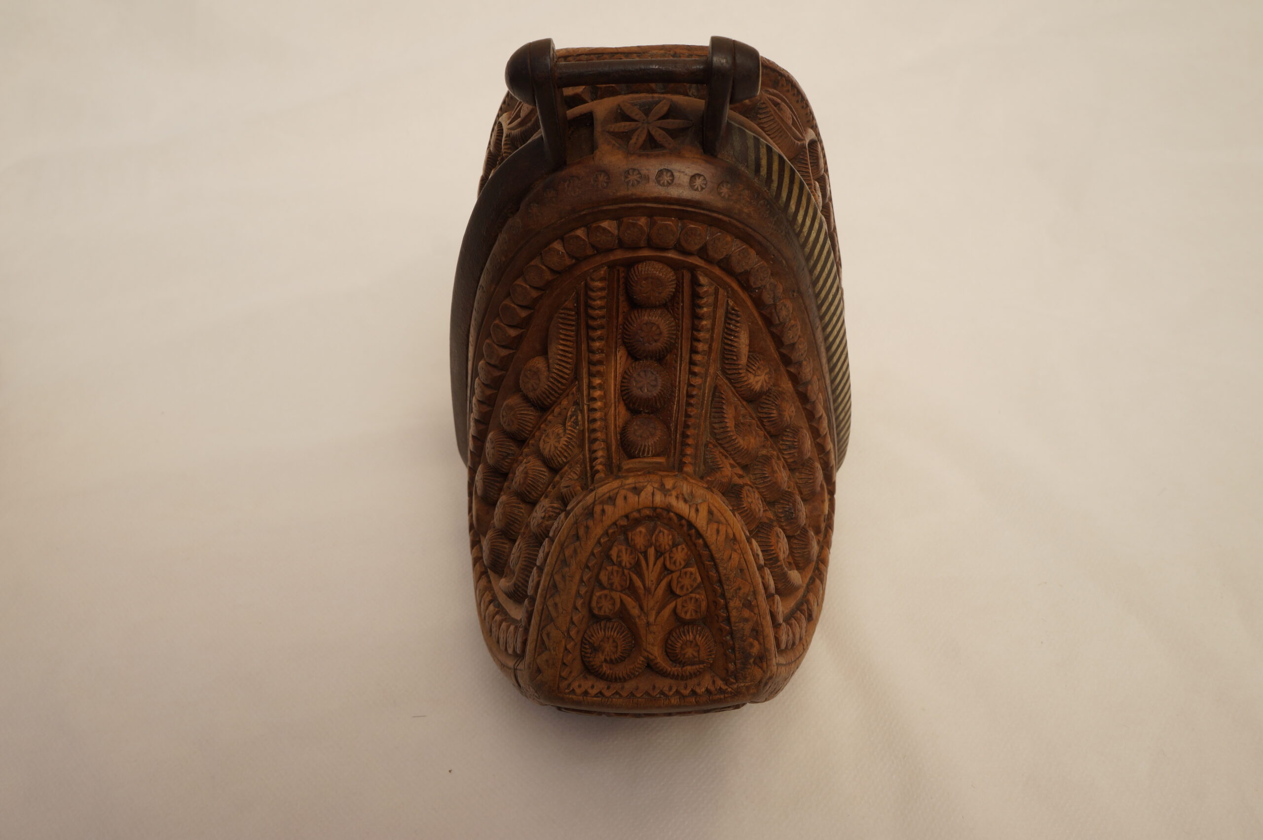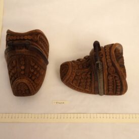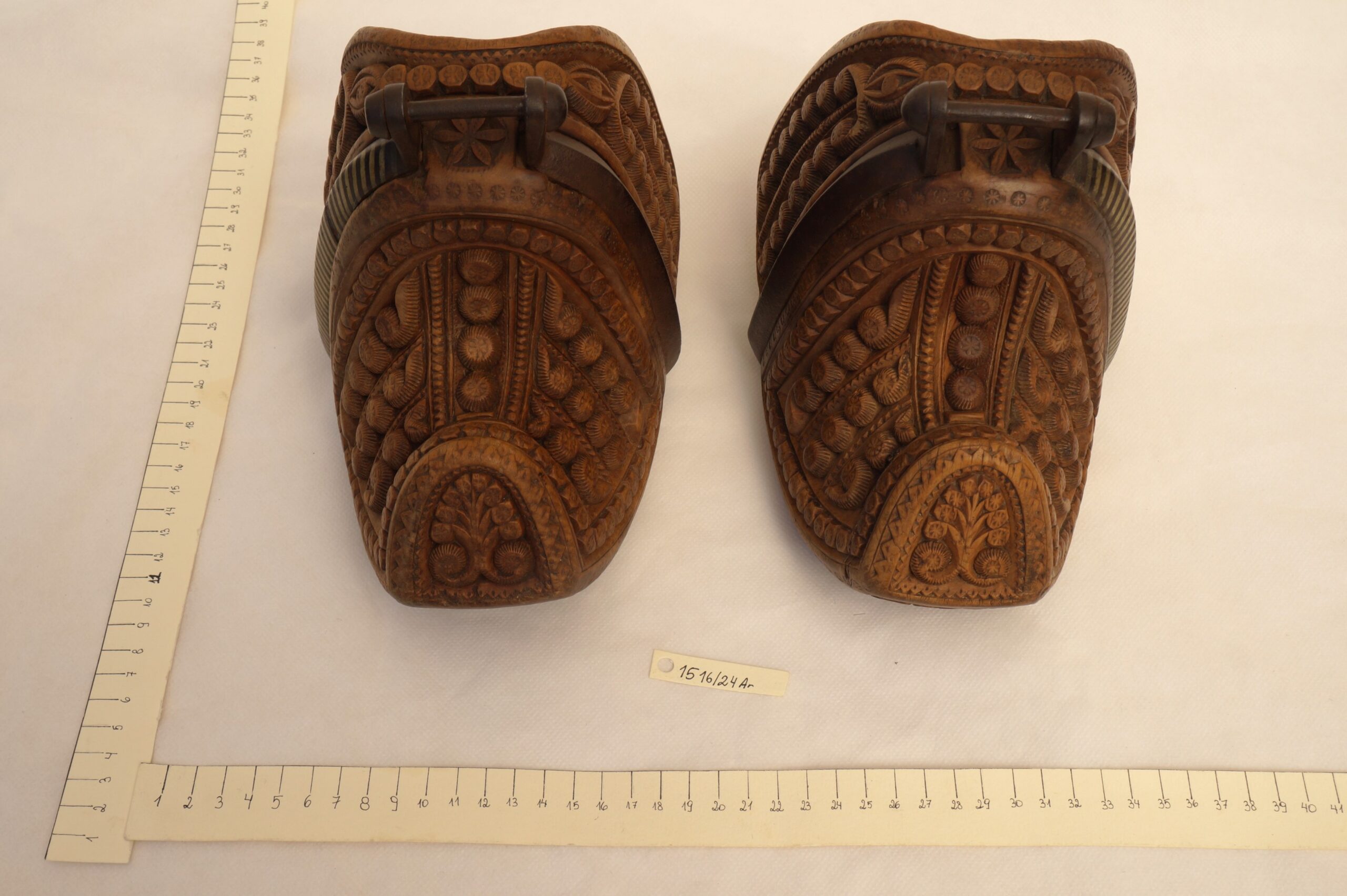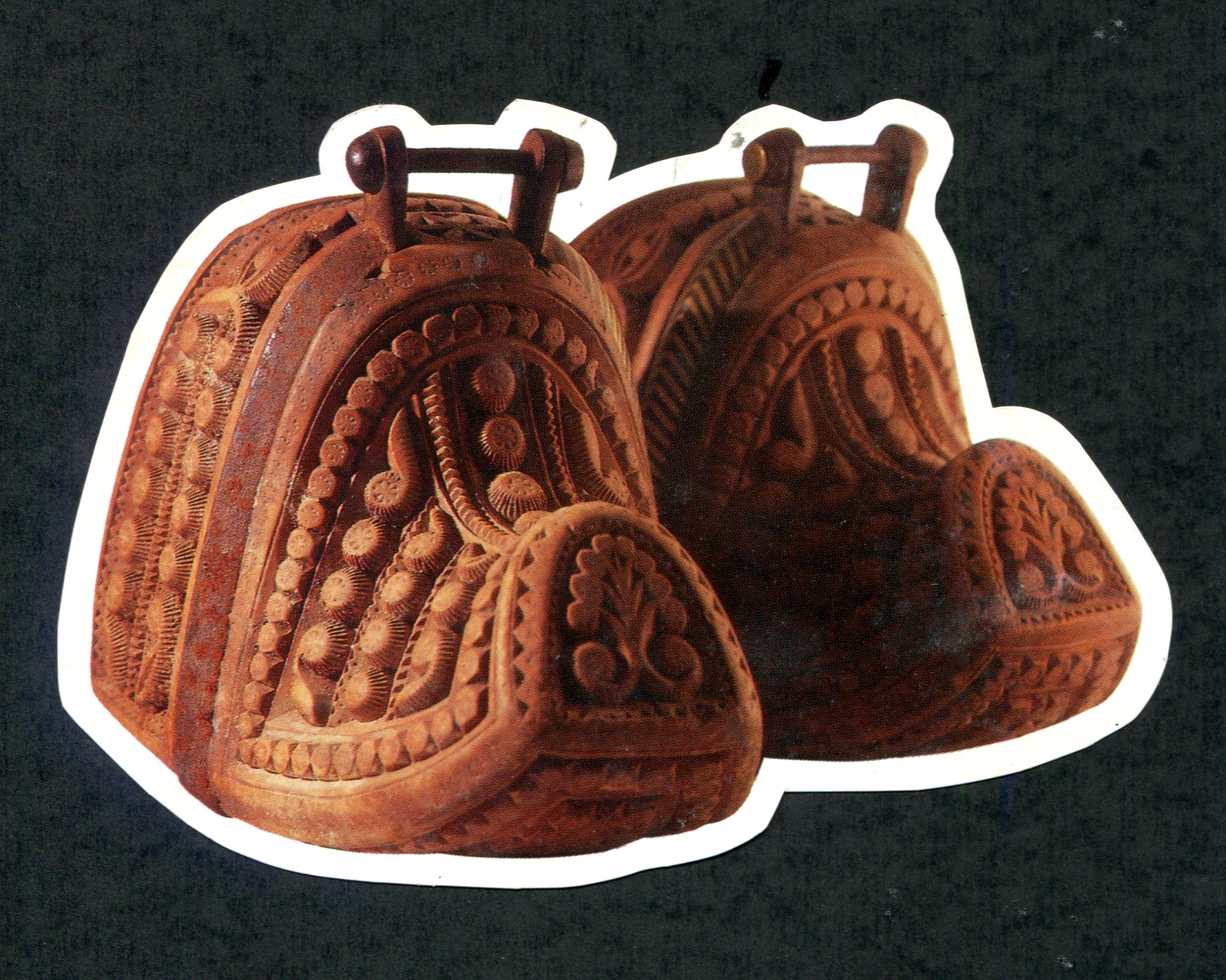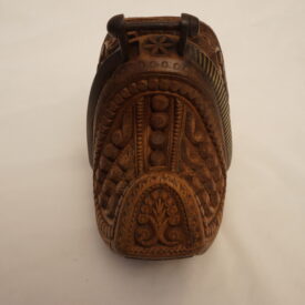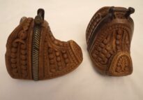 Par de estribos simétricos, superfície entalhada em toda a extensão, alça superior para fixação, base plana para apoio do pé. Peça de madeira maciça, entalhada manualmente com detalhes ornamentais que incluem padrões geométricos e motivos florais. De cor marrom-escuro e acabamento envernizado, possui formato tradicional com base plana para apoio do pé e alça superior para fixação à sela.
