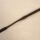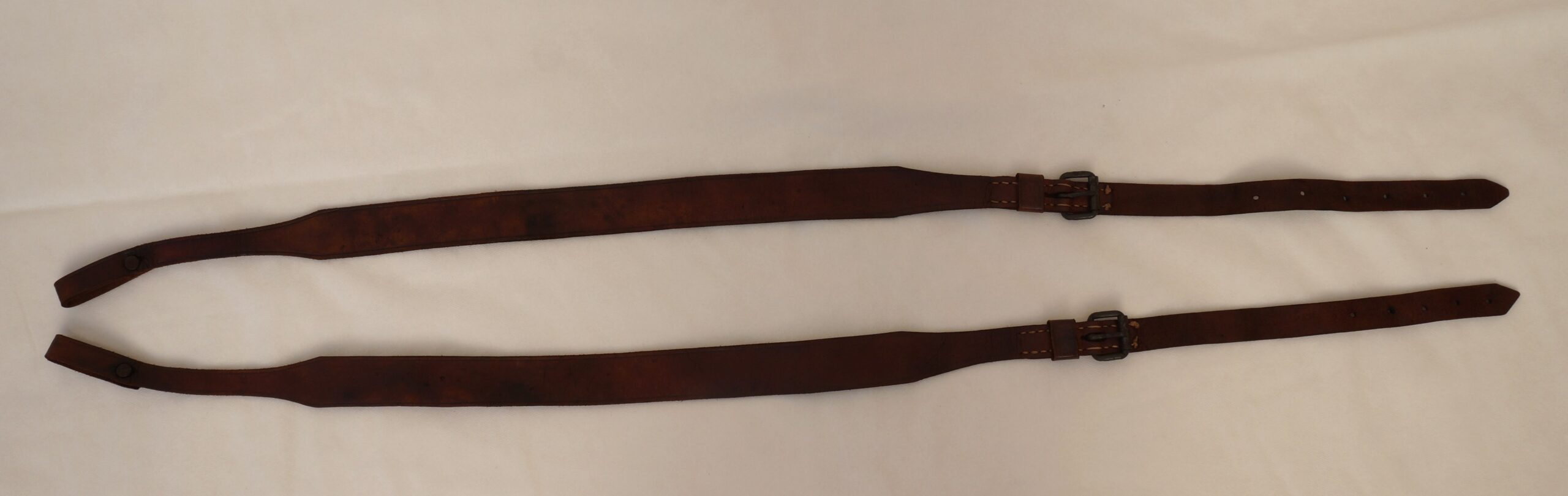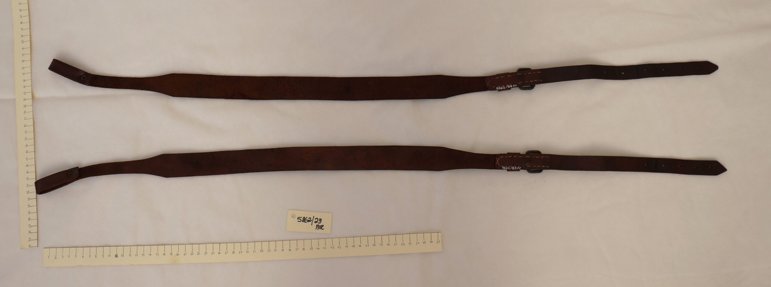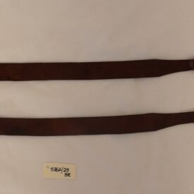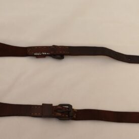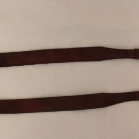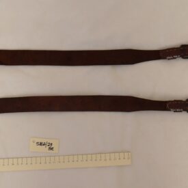 Duas tiras em couro marrom, de formato retangular, estreitando-se nas pontas, uma delas dobrada e fixada com rebite e a outra com fivela de metal, com um passador e pespontos em linha.