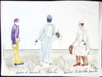 Três homens de pé. O vendedor de jornais leva um maço de jornais debaixo do braço. Bataclan tem na mão direita uma bengala e na esquerda uma bandeja com uma cabeça de porco assada. O vendedor de cachorro-quente leva no braço esquerdo uma cesta coberta e na mão direita um fogareiro.