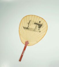 Leque de papel da marca Singer, com cabo de madeira. Em um dos lados tem a palavra SINGER escrita em vermelho, do outro lado há a estampa de uma máquina de costura da Singer.