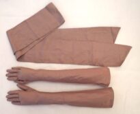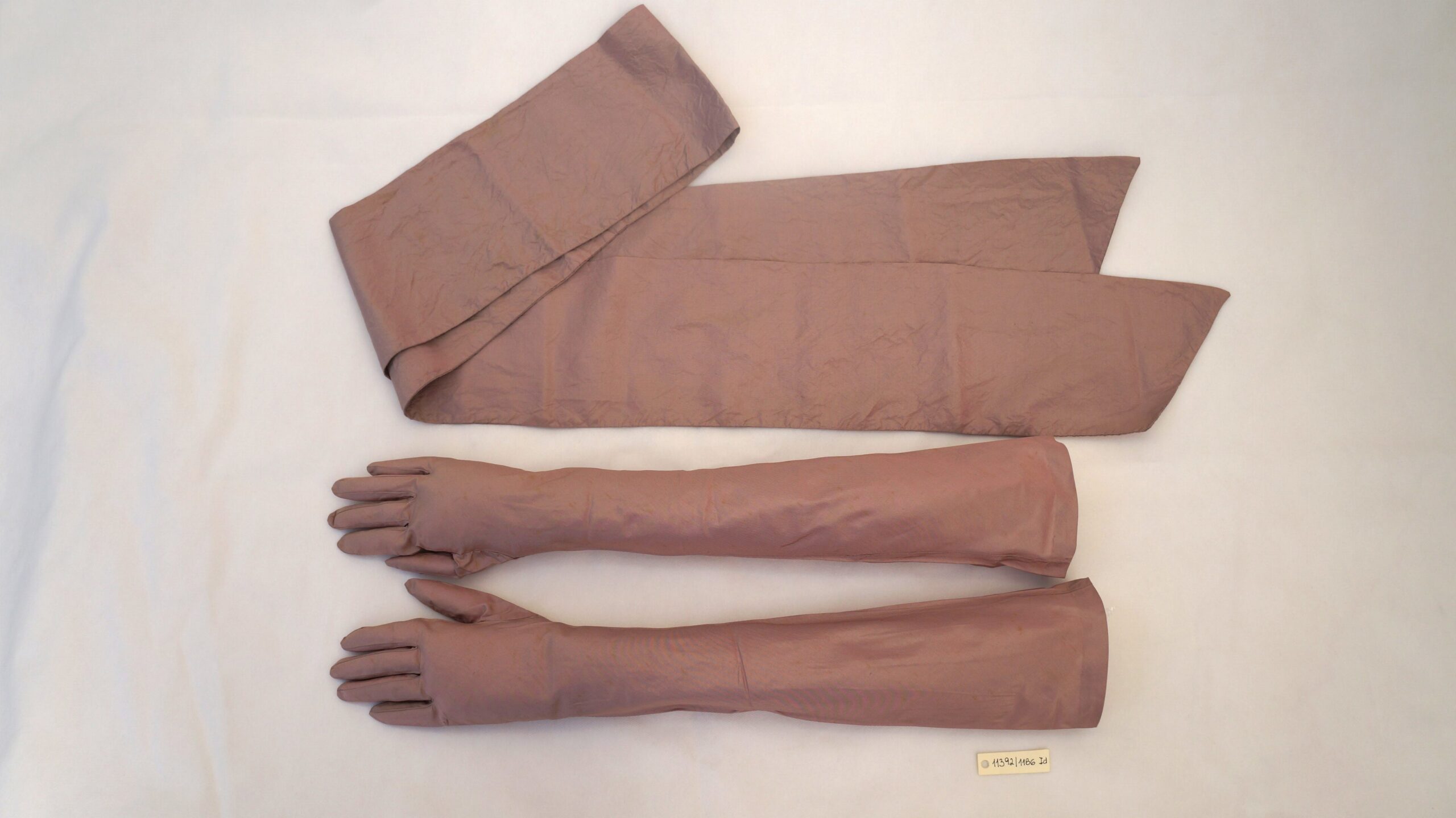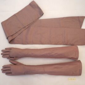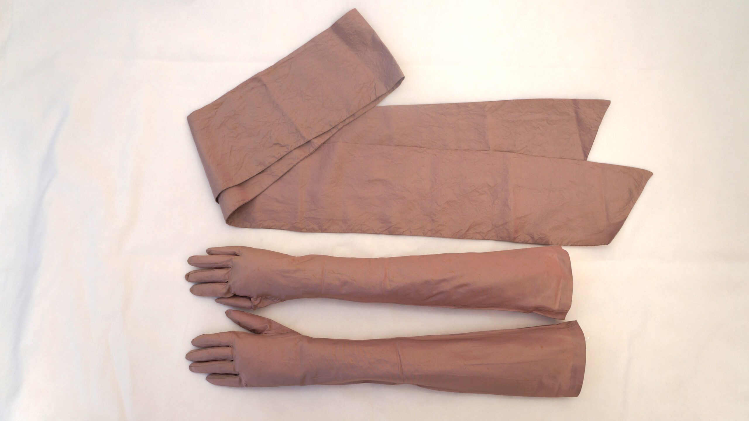 Conjunto de faixa de cintura e par de luvas longas de organza rosa antigo brilhante. A faixa possui as pontas em corte diagonal. As luvas possuem um furo na parte interna dos punhos, com duas pérolas de miçanga cada para fechamento.