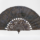 Leque com cabo de marfim trabalhado em recortes e incrustações de folha dourada. Folha de papel pintada a guache representando no centro um rei e uma rainha, tendo aos pés um cavalheiro ajoelhado, ladeados por fidalgos e damas. Orla e folhagem douradas. Nas varetas mestras, pequenos espelhos de forma oval emoldurados de metal amarelo. No verso, cabo liso e folha de papel pintada a guache com folhagens douradas, representando cena romântica campestre. Orla dourada. Alça de metal amarelo e pingente de linha de seda branca e canutões dourados. Leque usado em meados do século XIX, pertenceu a Dona Matilde Levis de Oliveira. No século XVIII, surgiram leques com pequenos espelhos nas varetas mestras, nos quais suas donas podiam ver sem serem vistas.