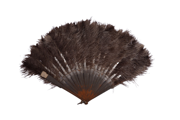 Leque de plumas de avestruz, penas de cor natural, mescladas nos matizes do castanho ao branco. Armação de madeira com pequenas varetas pintadas de prateado, ligadas entre si por um fio de linha branca. Varetas mestras mais largas e reforçadas, sendo a da face anterior ornamentada com quatro nódulos. Alça de metal branco com duas contas brancas, formando as cabeças do eixo. Leque pertenceu à Dona Belarmina da Silva, em 1858.