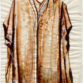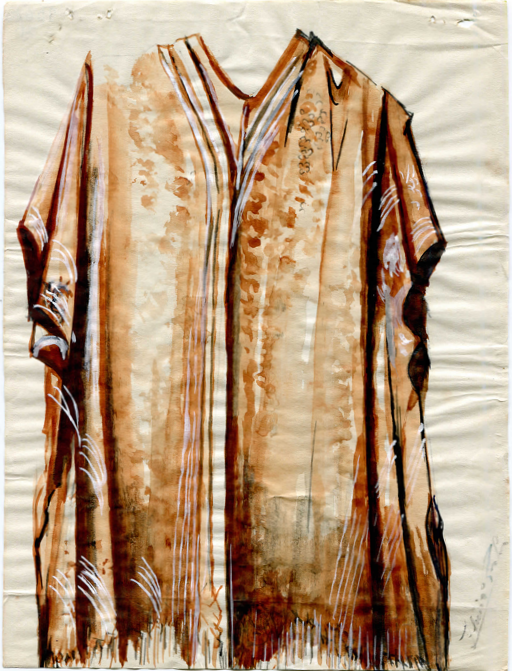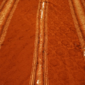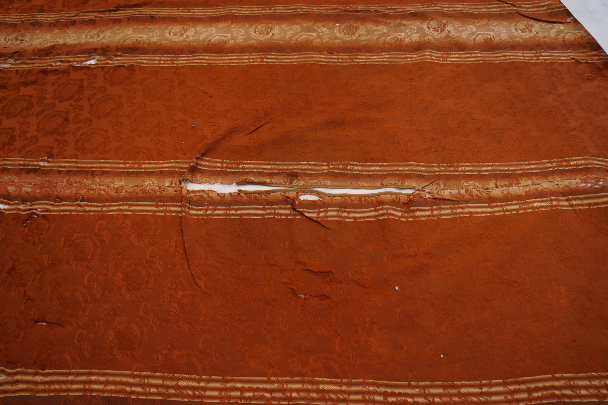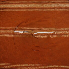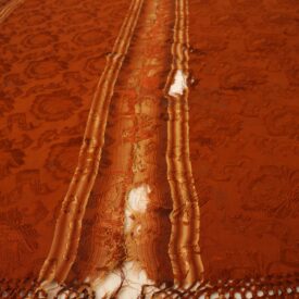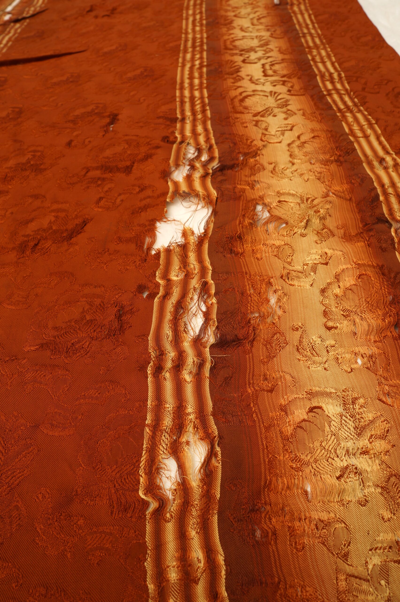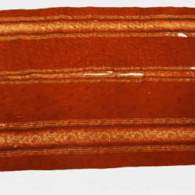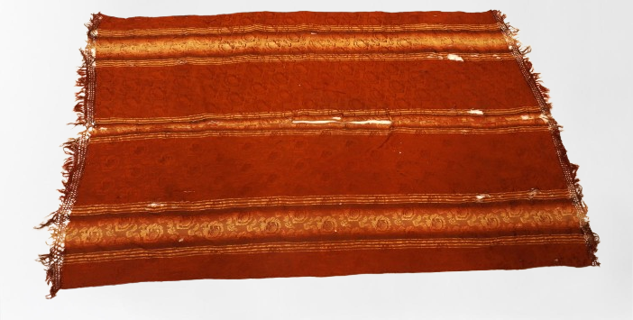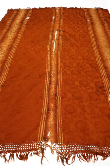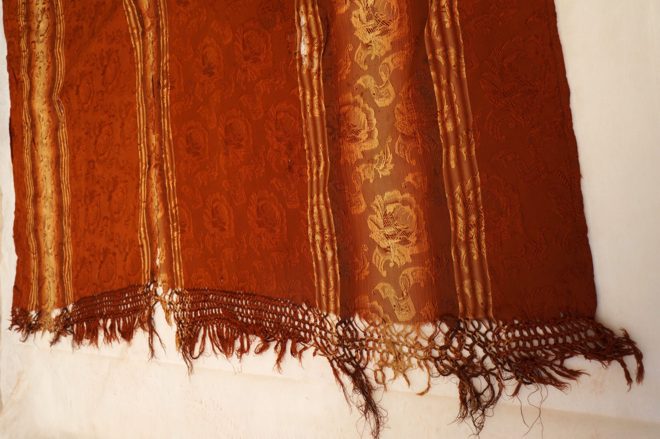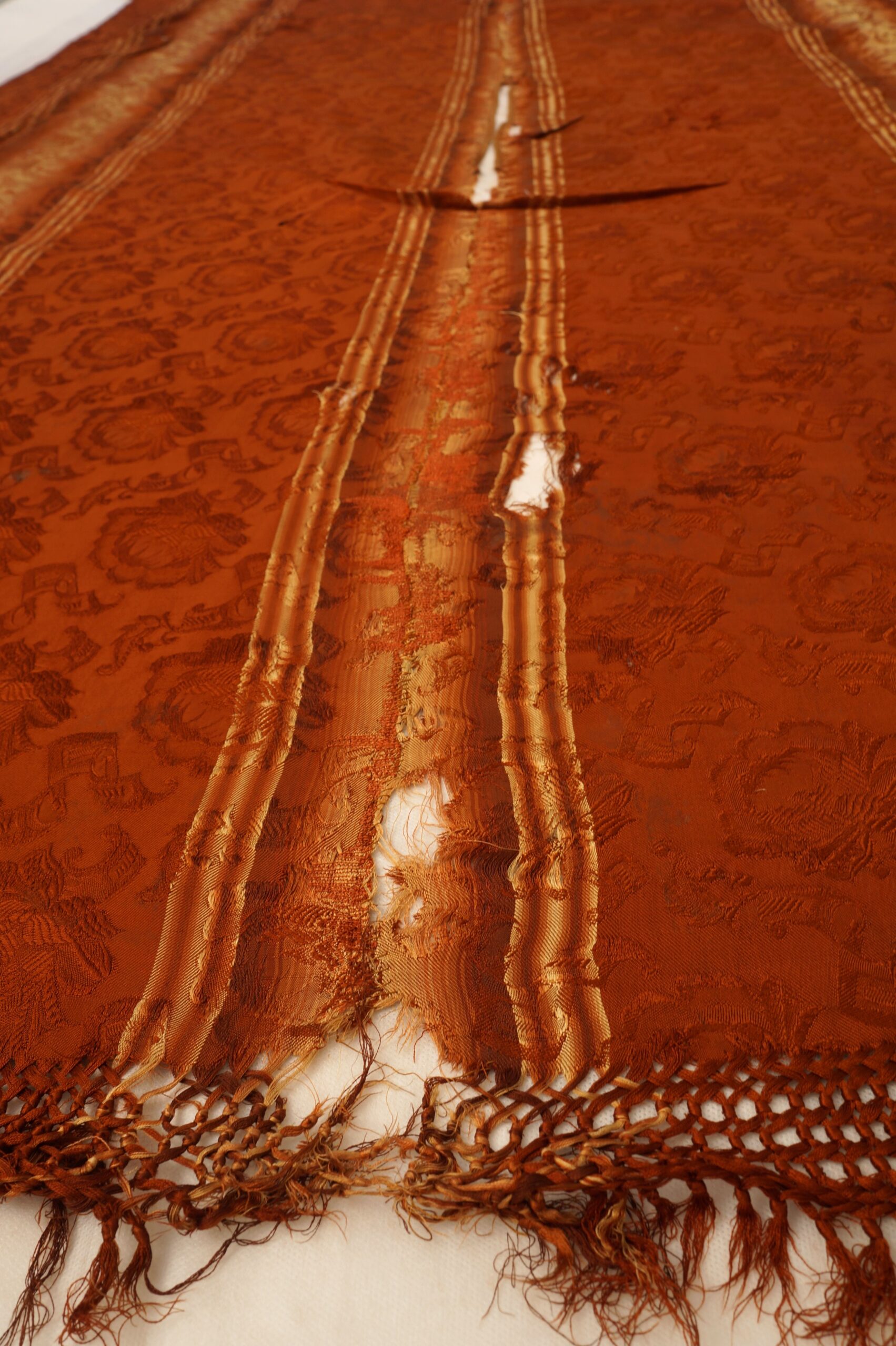 Pala de seda retangular em tons terrosos, com faixa central vertical em degradê dourado e doze listras dispostas no sentido vertical. O tecido apresenta brilho suave e textura elaborada com padrões florais em relevo. Nas extremidades, destacam-se franjas trançadas que reforçam seu caráter artesanal. A peça exibe sinais de desgaste, com áreas esgarçadas e fios soltos, especialmente na faixa central, indicando envelhecimento.