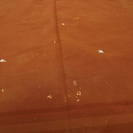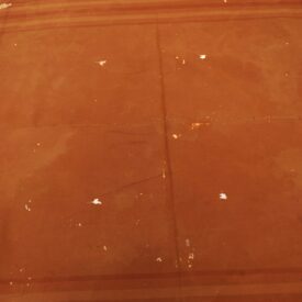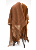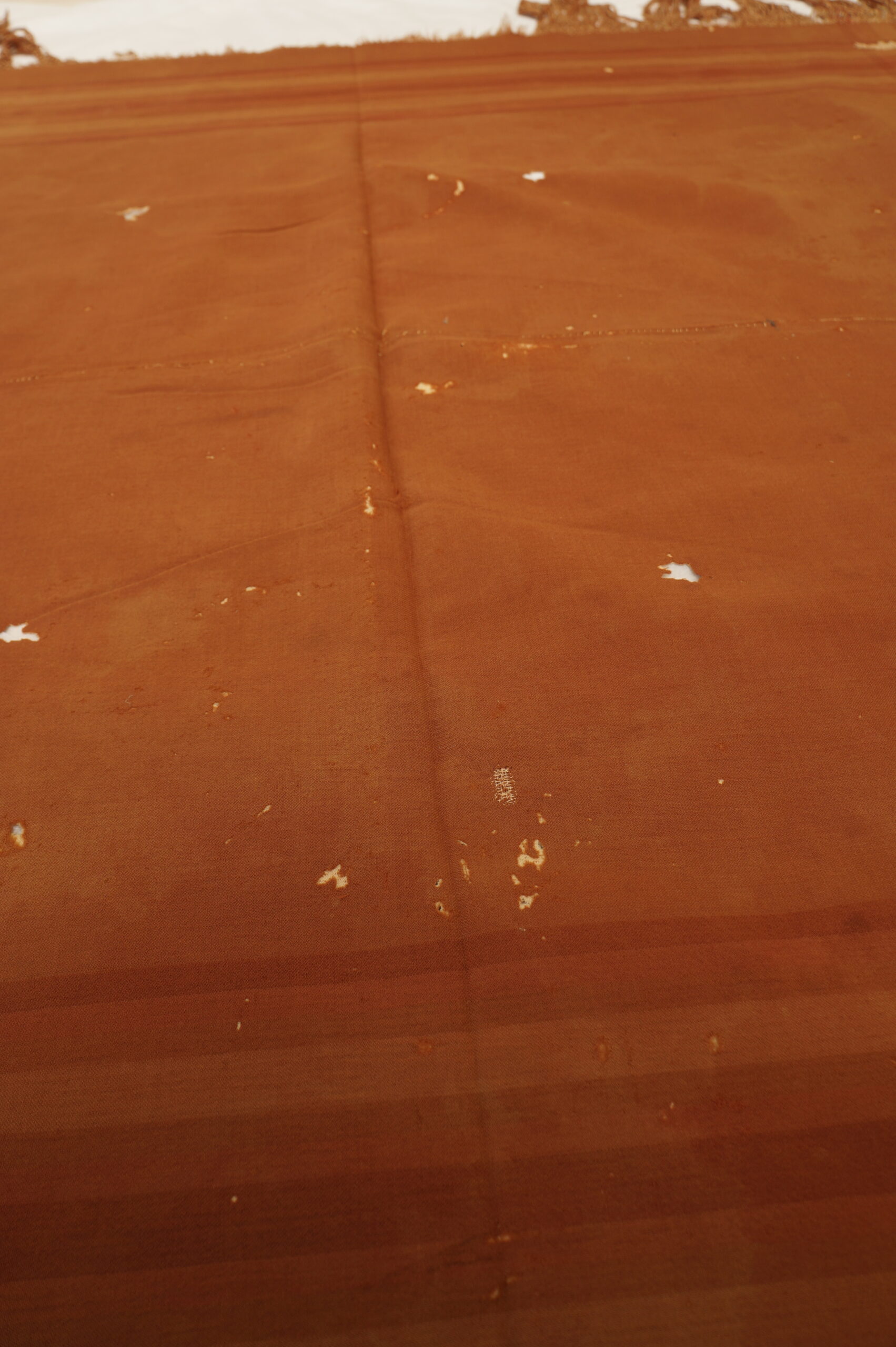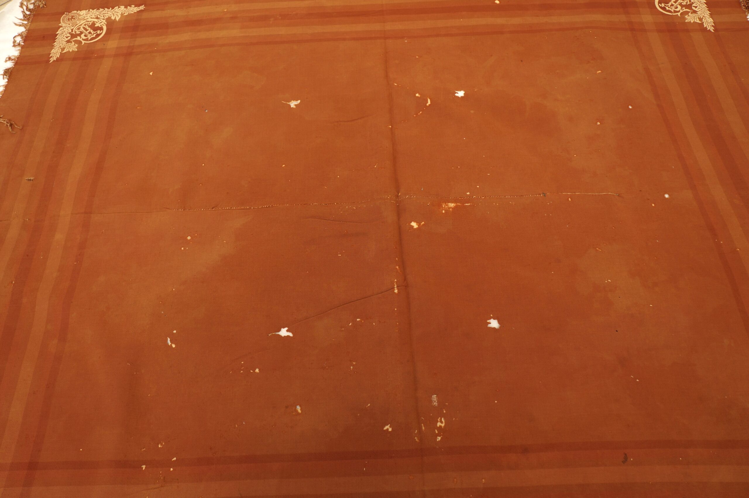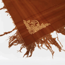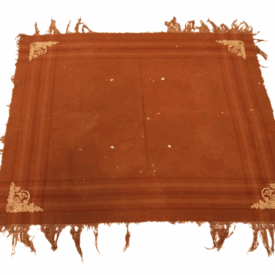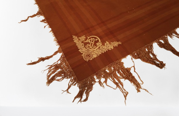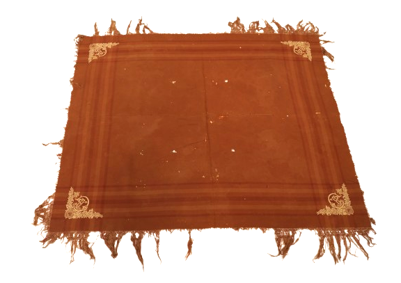 Pala retangular em tom terroso, confeccionado em tecido de aparência lisa com leve brilho, apresentando faixas horizontais e verticais que formam uma borda decorativa. Nos quatro cantos, há bordados elaborados em tom claro, compostos por folhagens estilizadas que se estendem em duas direções formando um ângulo, criando uma moldura vegetal. Entre as folhas, destaca-se um elemento circular semelhante a uma flor, e no centro da composição aparecem as iniciais JPC, trabalhadas em estilo caligráfico com linhas curvas e arabescos, conferindo caráter personalizado e refinado à peça. As extremidades possuem franjas longas, bastante danificadas, com fios soltos e desgaste evidente. A superfície central apresenta sinais de deterioração, incluindo rasgos, pequenos furos e marcas de envelhecimento.