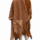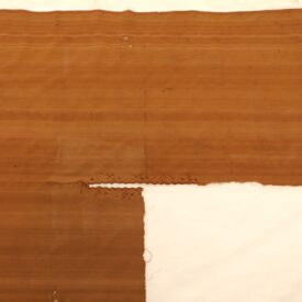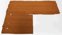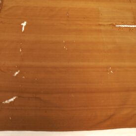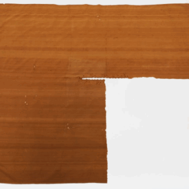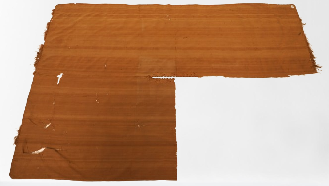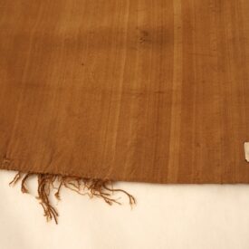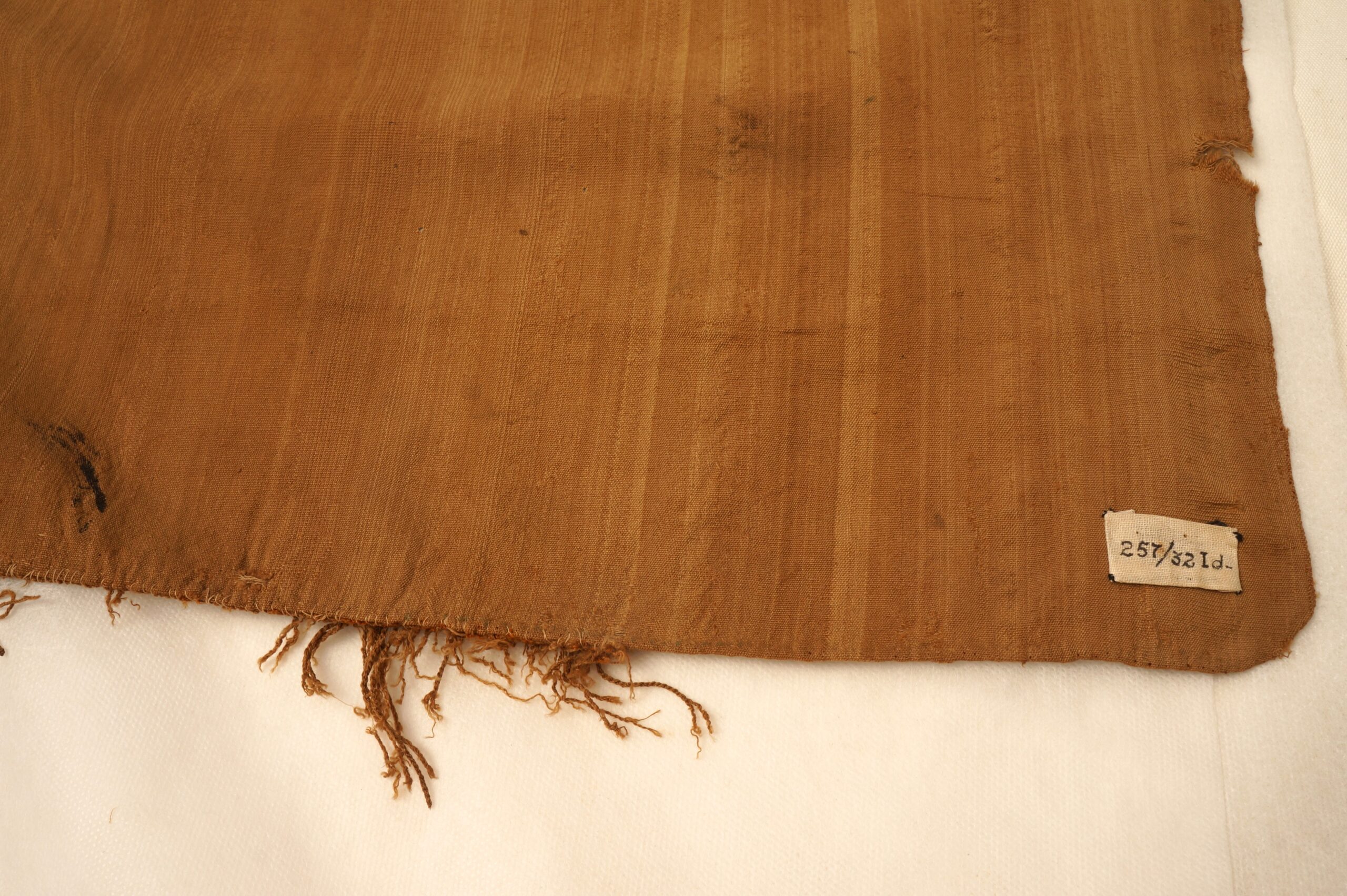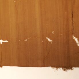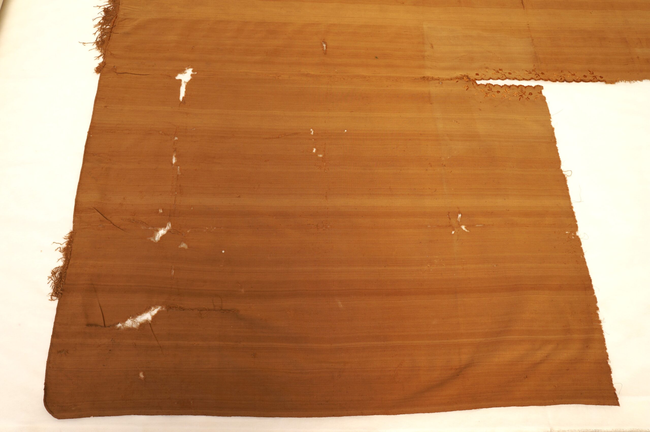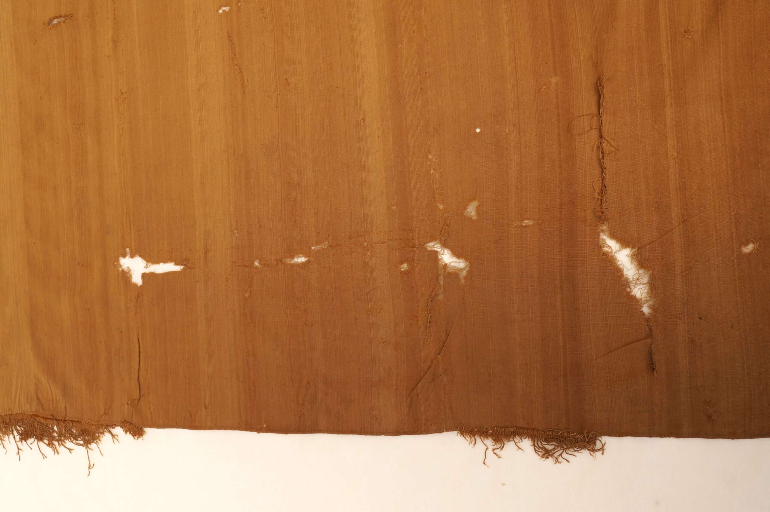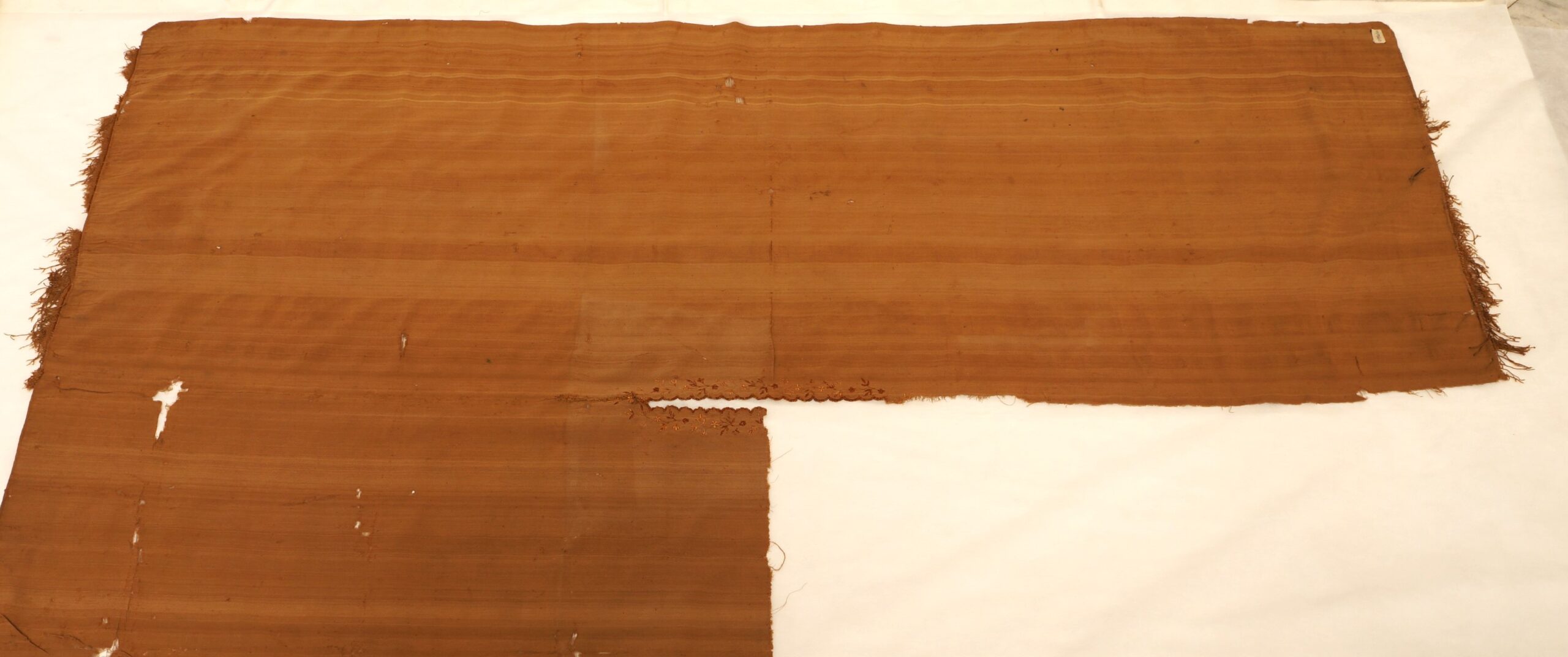 Pala de seda e lã retangular em tom terroso uniforme, com leve variação tonal em faixas horizontais. O tecido possui superfície lisa, pouco brilhante, e apresenta sinais evidentes de desgaste, incluindo áreas esgarçadas, rasgos e perdas de tecido, além de uma grande seção ausente na parte inferior. Nas extremidades, há vestígios de franjas bastante danificadas. A peça conta com uma gola simples, ornamentada com delicados bordados florais e acabamento em recorte ondulado, conferindo um detalhe artesanal refinado. Pequenos furos e marcas de deterioração indicam envelhecimento e fragilidade do material.