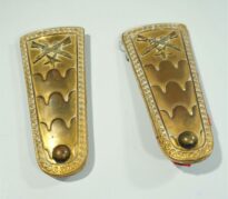 Par de dragonas douradas com um brasão composto por duas armas cruzadas e uma estrela. Pertenceu a João Silverio Petry que as utilizou na Guarda Nacional no Rio de Janeiro.