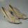Par de sandália feminina em couro prateado, com plataforma. Tira no calcanhar prolongada até a perna, fixando-se por uma pequena fivela de metal com vários furos para engate. Salto alto e grosso, sola de borracha preta. Forro em couro marrom, com couro prateado na parte da frente. Seis finas tiras de cada lado, entrelaçadas no meio.