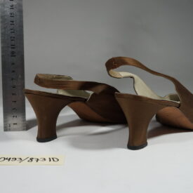 Sapato feminino forrado na parte externa com cetim marrom e na parte interna com couro na cor gelo. Sapato aberto na parte posterior, preso por uma alça. Sola na cor natural, base do salto em borracha preta, presa por um prego de metal.