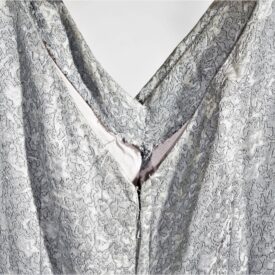 Vestido de festa cinza de brocado, em relevo, com fio de seda. Decote “V”drapeado na frente com prega macho unida por botão na parte traseira da saia. Pertenceu a Conceição Aranda de Souza e foi utilizado no casamento de seu filho primogênito, João Nery Maria de Souza, em 1947.