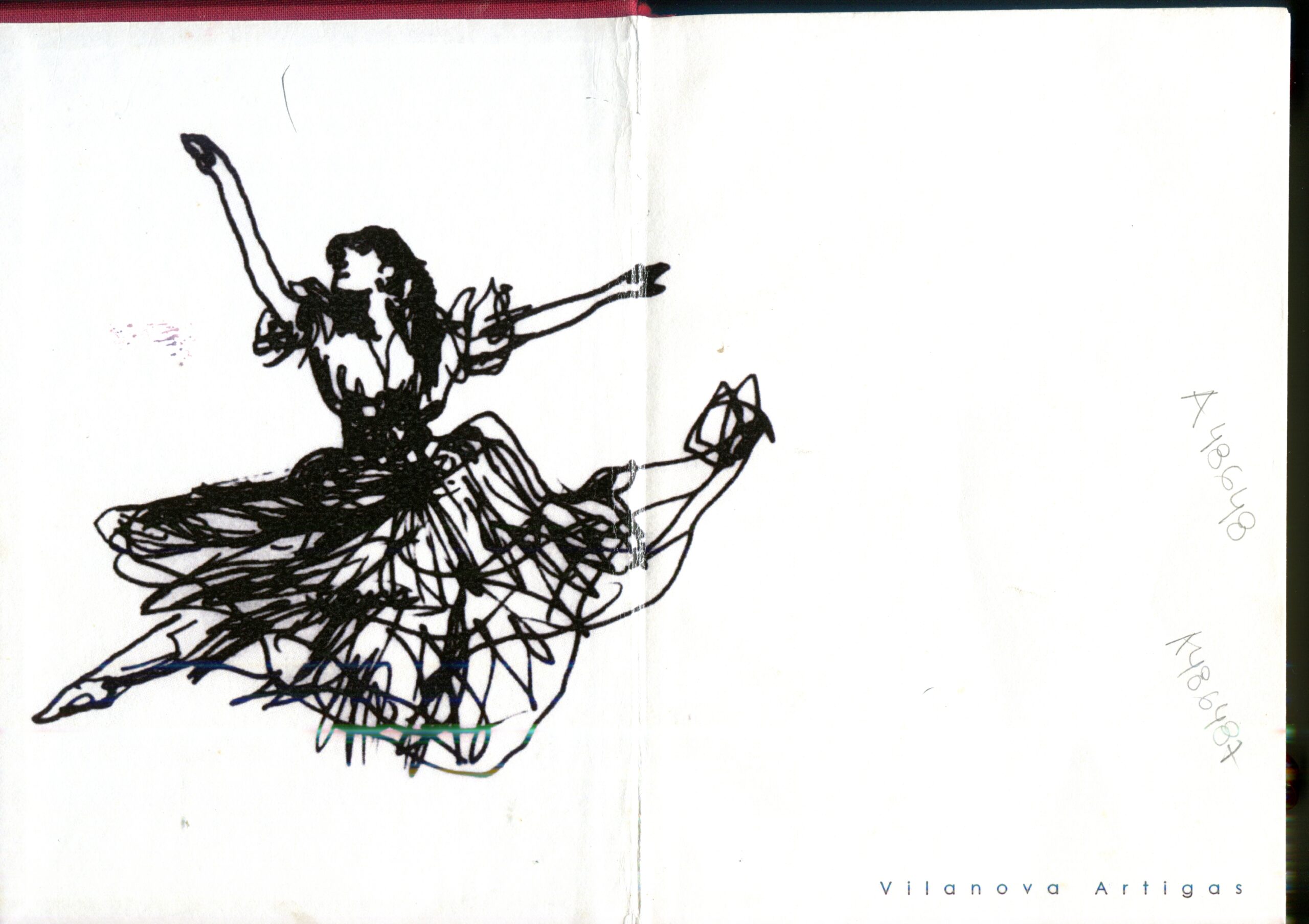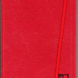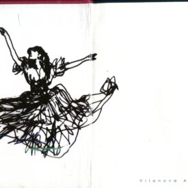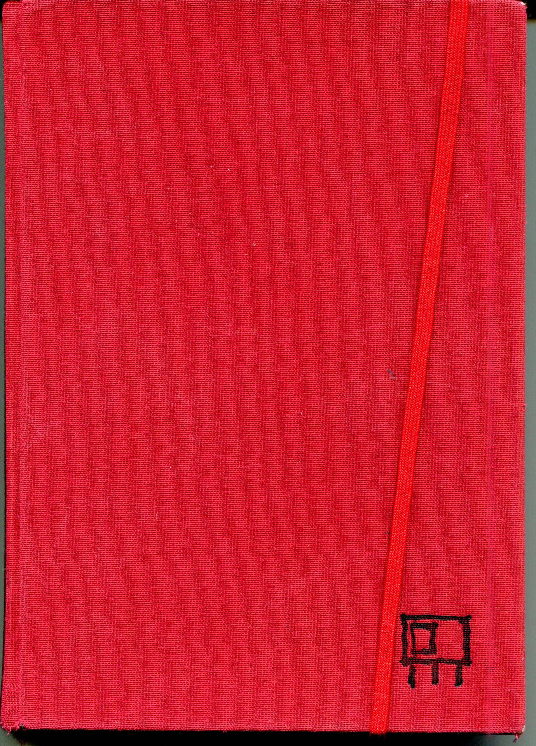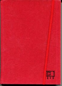 Caderno com cordão vermelho e capa de papelão forrado com tecido vermelho e páginas de folha sulfite. No canto inferior direito há um desenho com linhas pretas no formato de um quadrado e abaixo dele tem três linhas, dentro do quadrado há um quadrado menor. Na folha de rosto contém um desenho e uma bailarina em tinta preta. No canto inferior a direita tem inscrições datilografadas em tinta preta [Vilanova Artigas], ainda do canto direito escrito à lápis [A 48648 || A 486487]. Na parte interna foram feitas diversas anotações e desenhos de plantas arquitetônicas escritas em lápis e caneta preta, azul, roxo e verde.