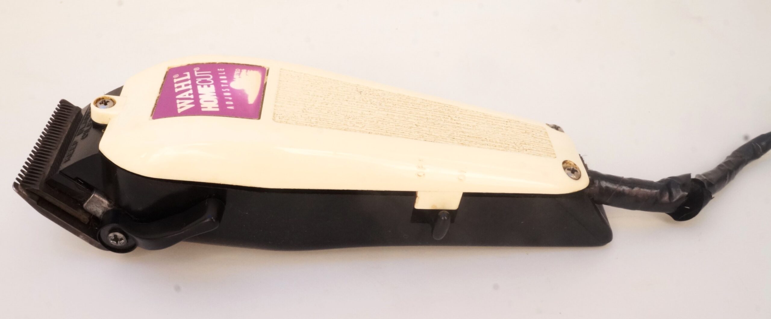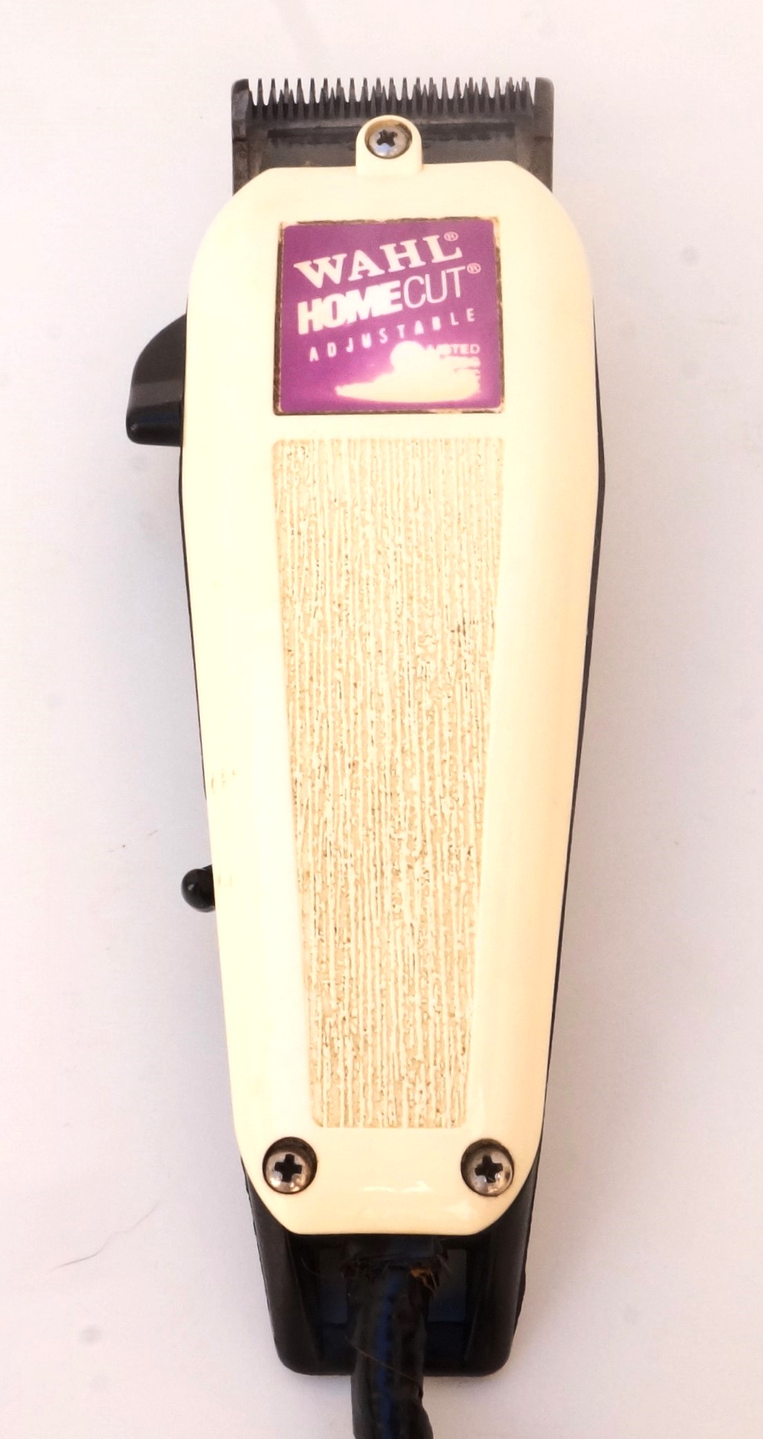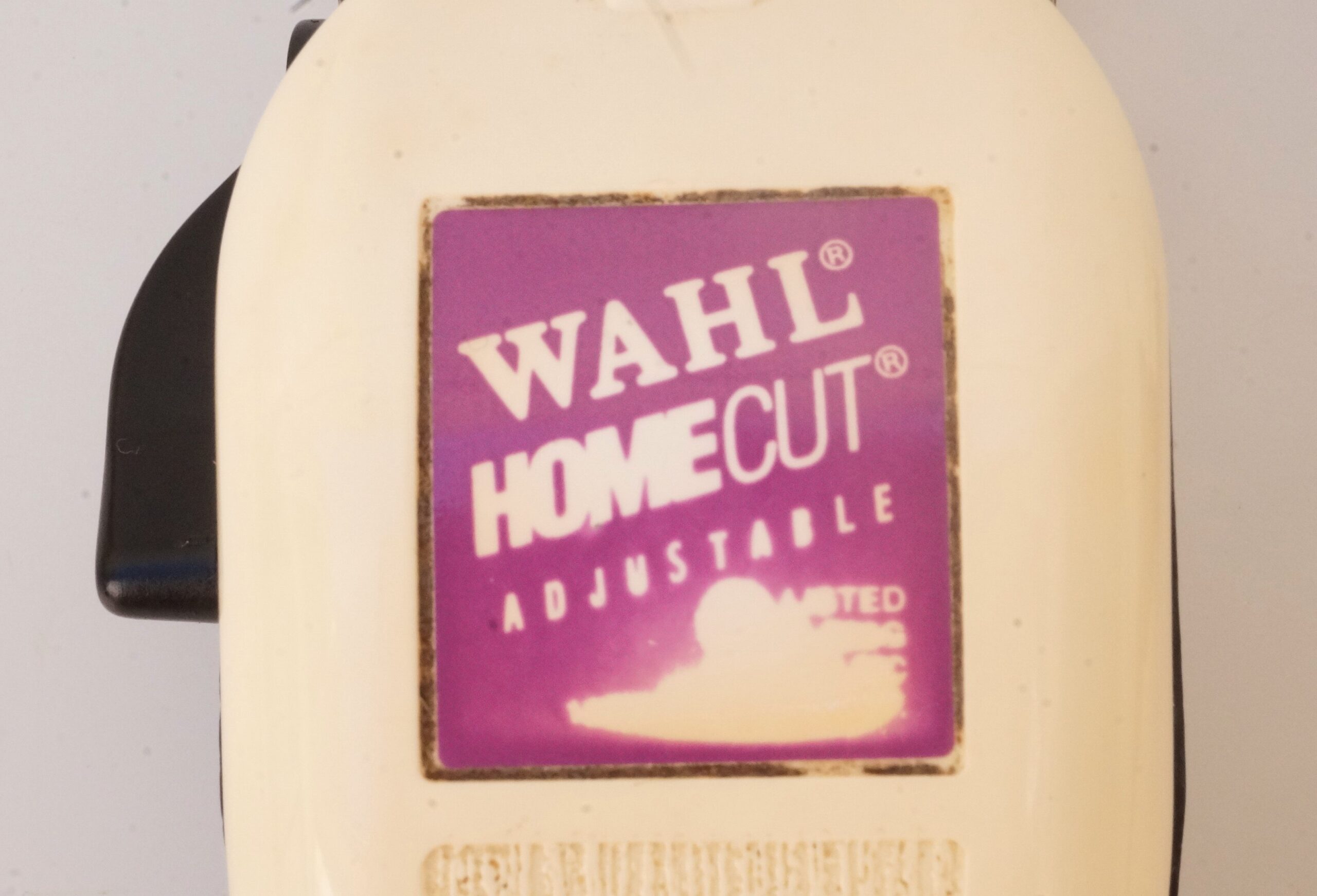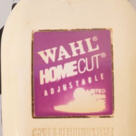 Máquina de cortar cabelo de baquelite com lâmina de metal e fio elétrico. O corpo da máquina é feito de baquelite preta, exceto pelo seu dorso, que é de baquelite bege. Nele se encontra um adesivo roxo com o texto impresso em branco “WAHL® HOMECUT® ADJUSTABLE [ilegível]”. Logo abaixo contém uma faixa texturizada para melhor manuseio. A sua lateral esquerda contém uma alavanca preta e, abaixo, um botão com a inscrição em baixo relevo “OFF | ON”. Na sua lateral direita contém três buracos circulares, sendo um preenchido por um parafuso preto. Na parte superior há uma lâmina dentilhada de metal com a inscrição em baixo relevo “PRECISION WAHL® USA”. Abaixo dos dentes há em alto relevo o texto “KEEP BLADES OILED”. Na parte inferior do corpo há uma alça quadrada, a etiqueta de fabricação com o número “95” e um fio elétrico de plástico preto remendado com fita isolante preta. Em sua ponta, possui um plug de tomada do tipo A.