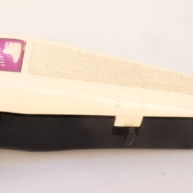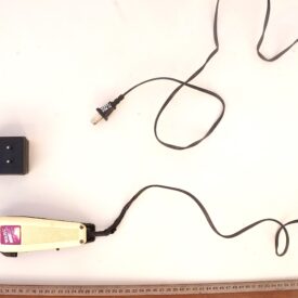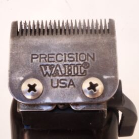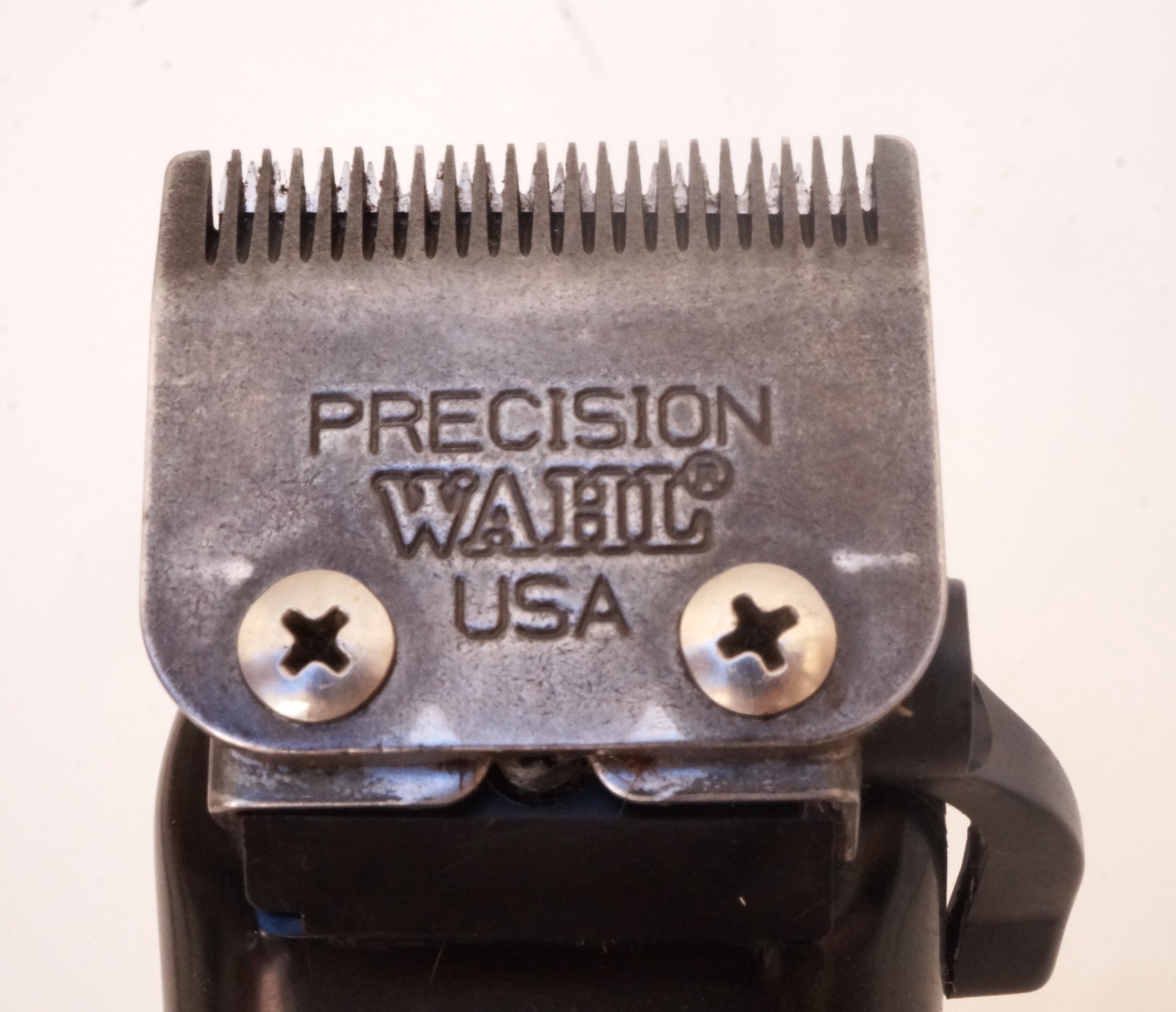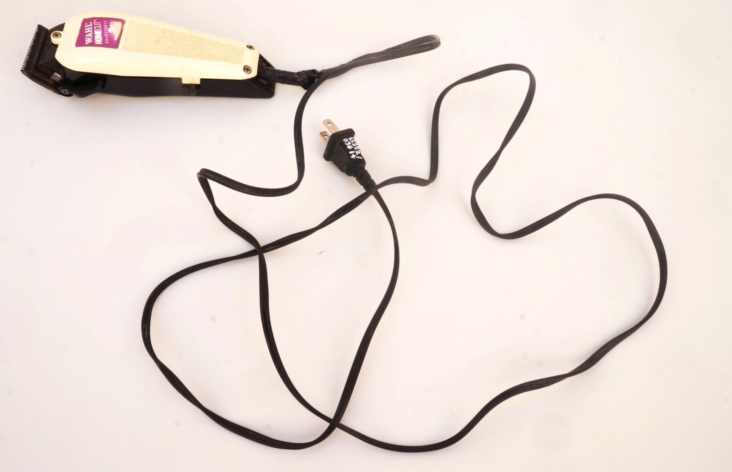 Máquina de cortar cabelo de baquelite com lâmina de metal e fio elétrico. O corpo da máquina é feito de baquelite preta, exceto pelo seu dorso, que é de baquelite bege. Nele se encontra um adesivo roxo com o texto impresso em branco “WAHL® HOMECUT® ADJUSTABLE [ilegível]”. Logo abaixo contém uma faixa texturizada para melhor manuseio. A sua lateral esquerda contém uma alavanca preta e, abaixo, um botão com a inscrição em baixo relevo “OFF | ON”. Na sua lateral direita contém três buracos circulares, sendo um preenchido por um parafuso preto. Na parte superior há uma lâmina dentilhada de metal com a inscrição em baixo relevo “PRECISION WAHL® USA”. Abaixo dos dentes há em alto relevo o texto “KEEP BLADES OILED”. Na parte inferior do corpo há uma alça quadrada, a etiqueta de fabricação com o número “95” e um fio elétrico de plástico preto remendado com fita isolante preta. Em sua ponta, possui um plug de tomada do tipo A.